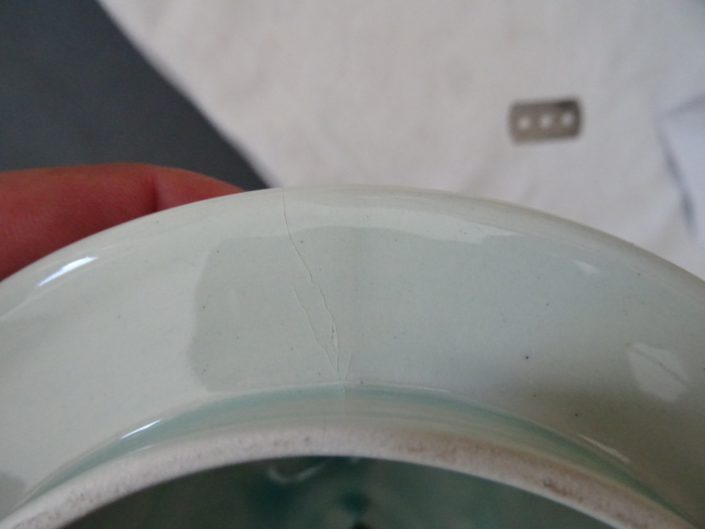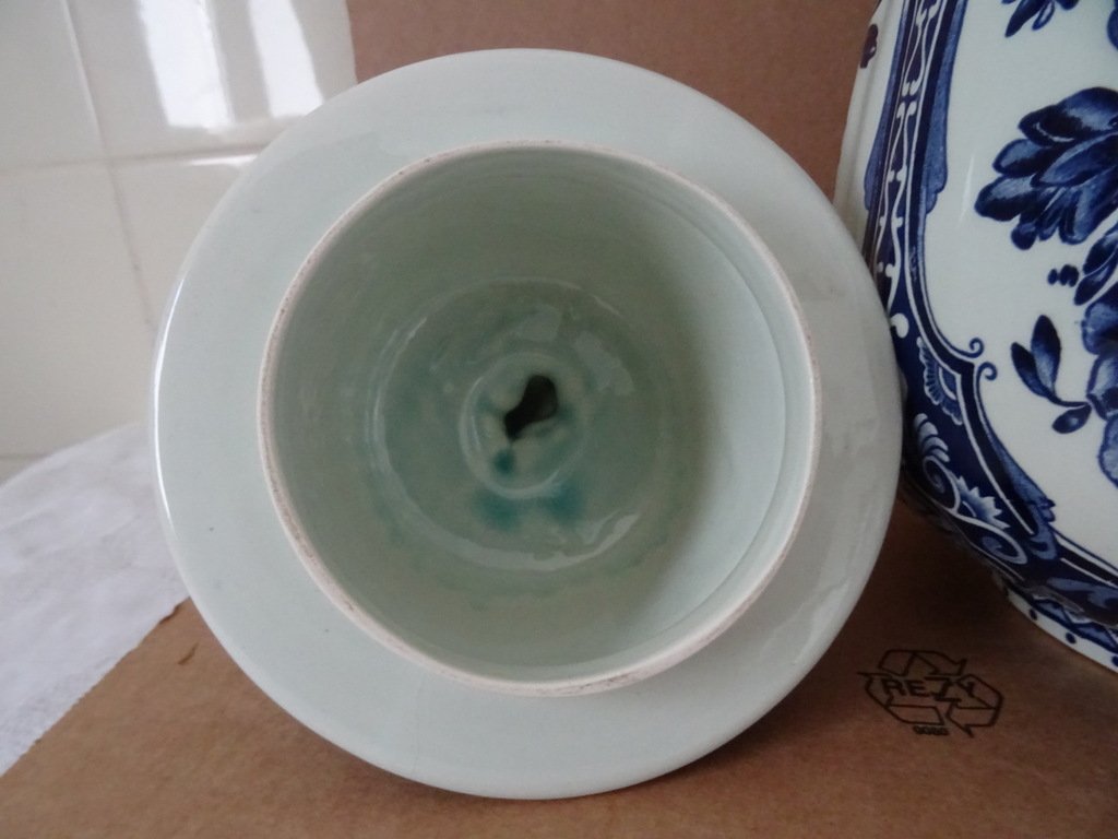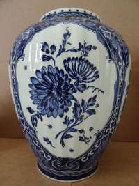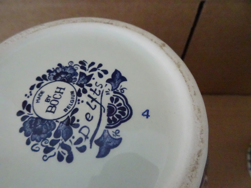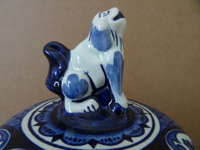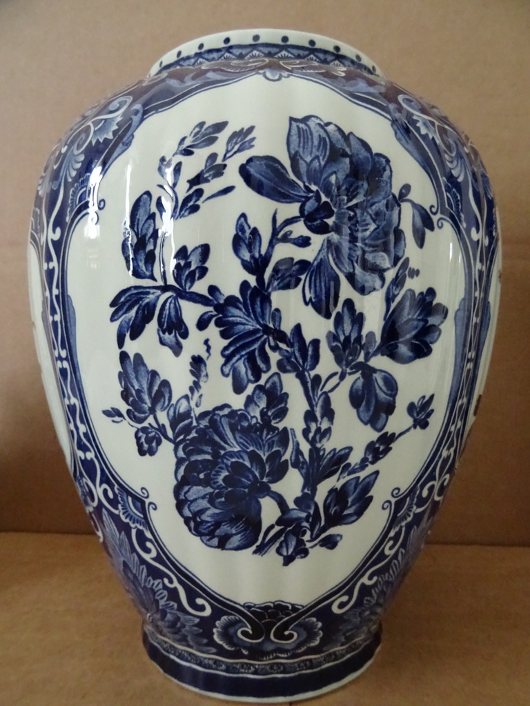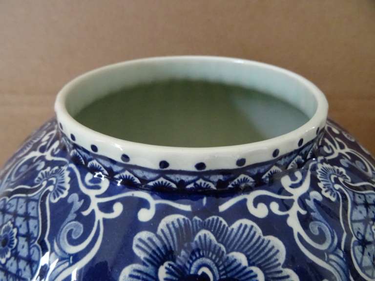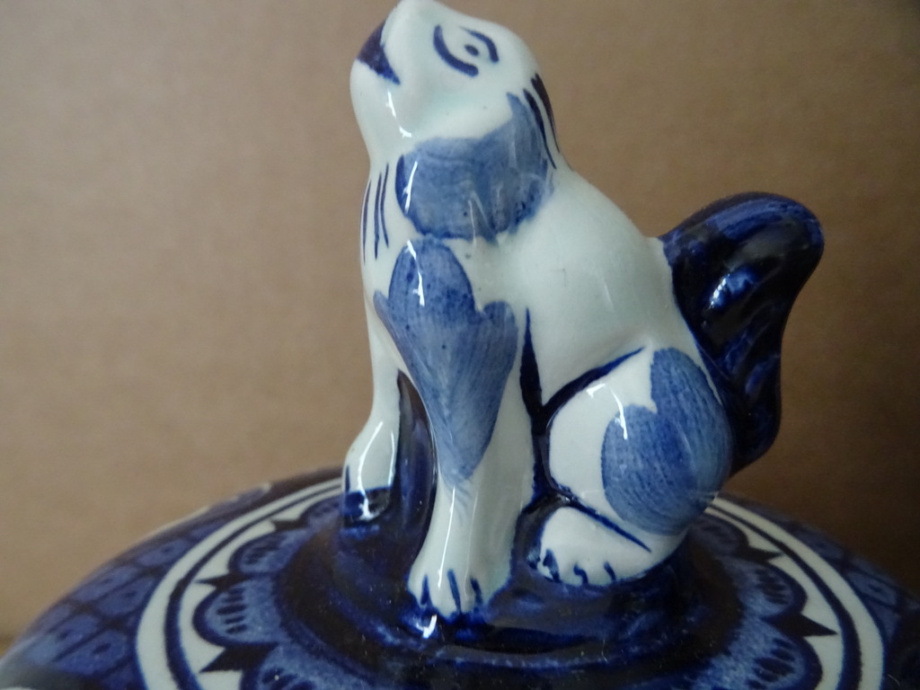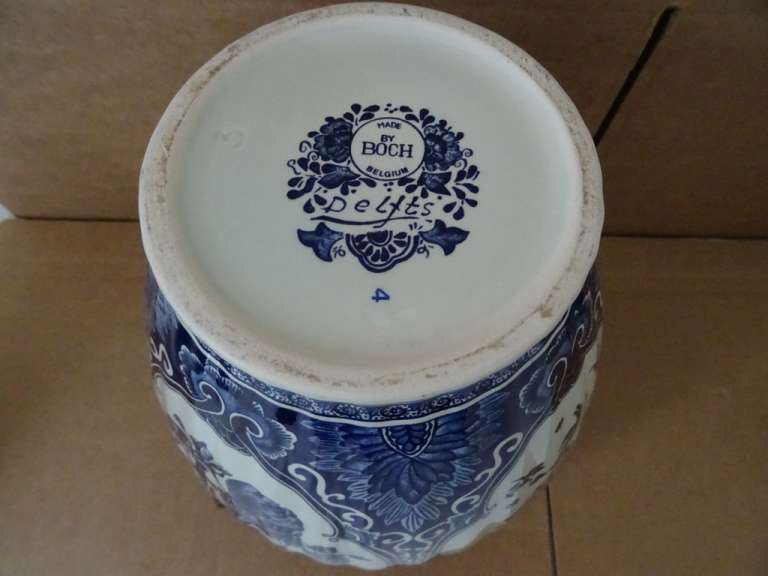 Antieke Delfts blauwe vaas Boch Belgium vervaardigd rond 1950 of iets eerder. Imponerende deksel-vaas van 21 bij 21 bij 39 cm (inclusief deksel). De vaas is op prachtige wijze verrijkt met florale decoratie. De deksel is verrijkt met een Foo dog of ander dier dat de wacht houdt. De wel heel erg fraaie vaas is vervaardigd door Boch Frères België. De naam van het gebruikte decor is Delfts Blauw. De vaas is in goede staat, puntgaaf. De deksel heeft een zo goed als onzichtbare haarscheur / barstje in de rand. Ik heb geprobeerd dit te fotograferen, zie laatste foto.
