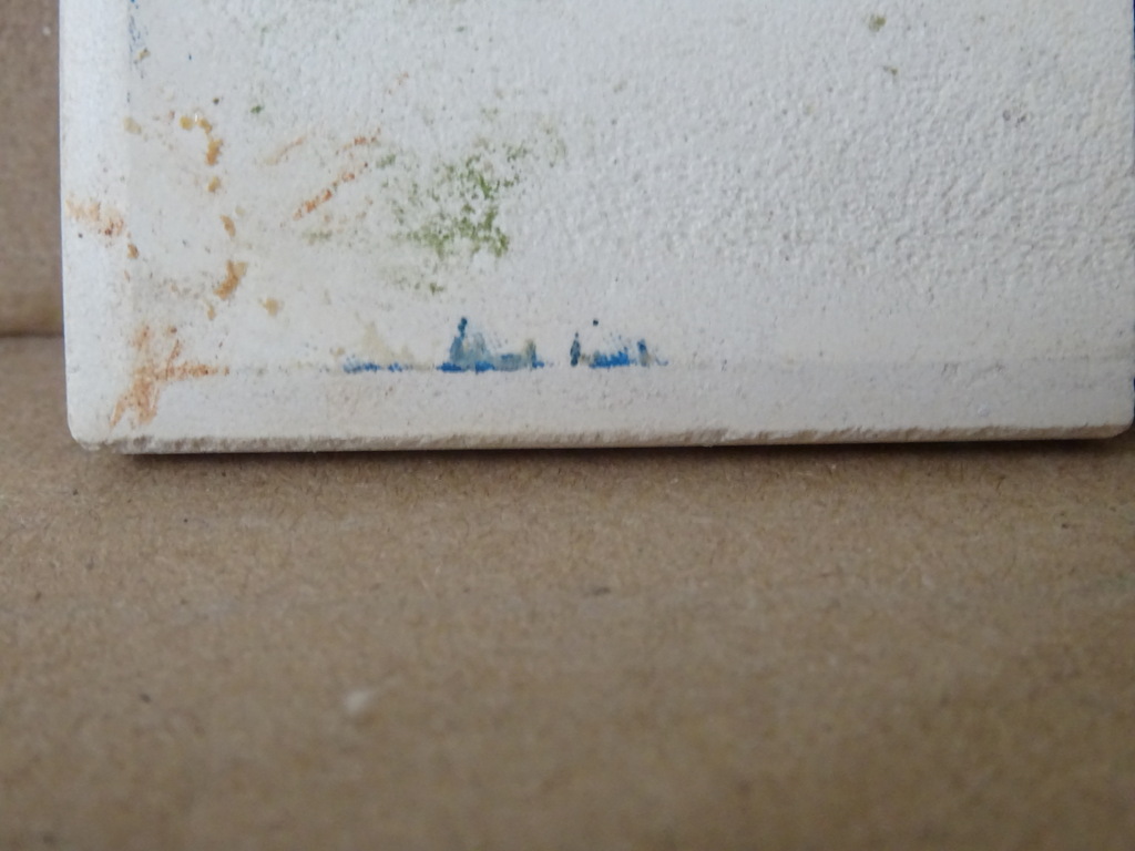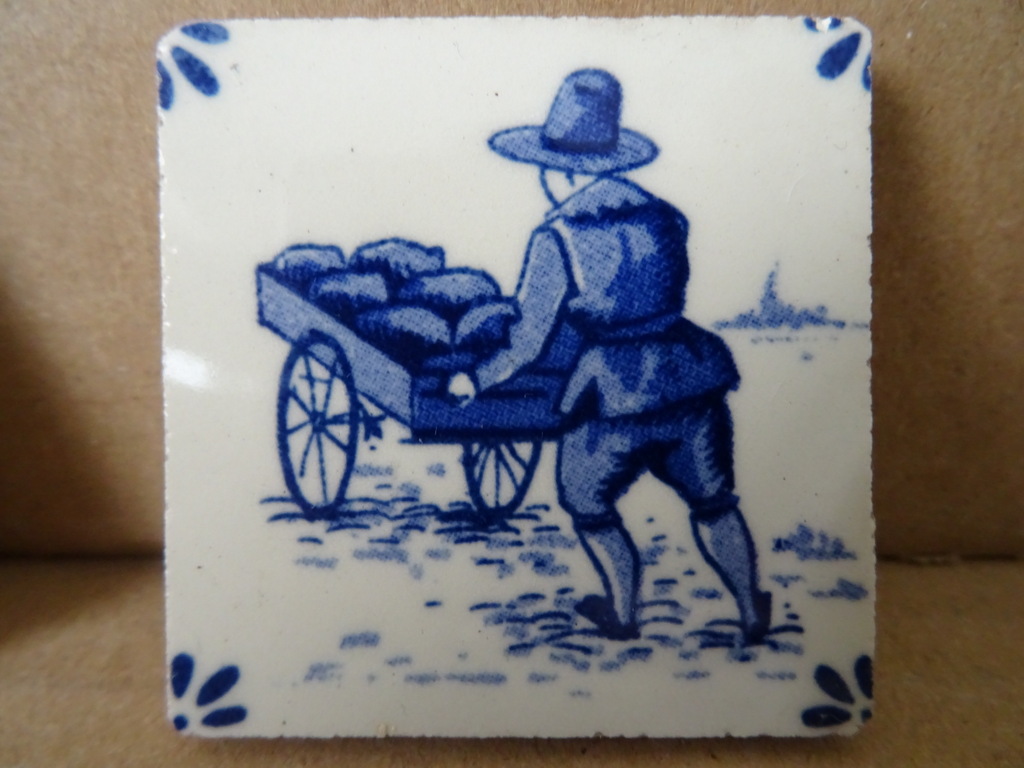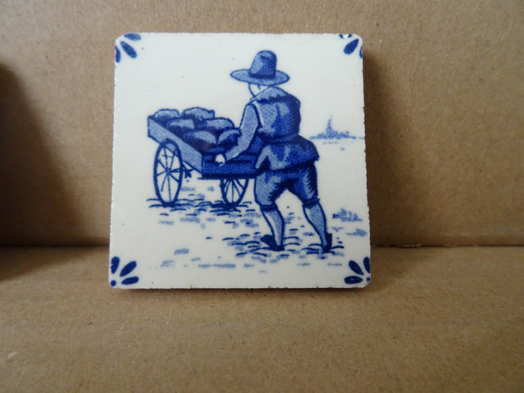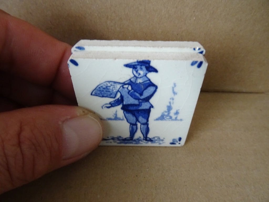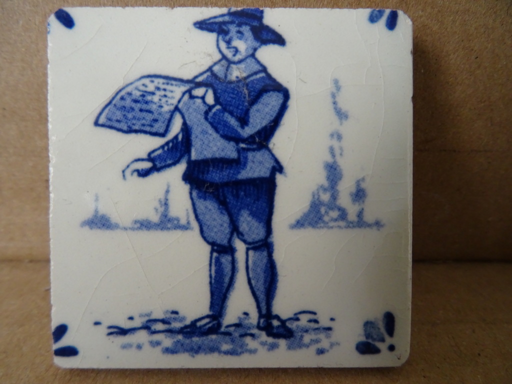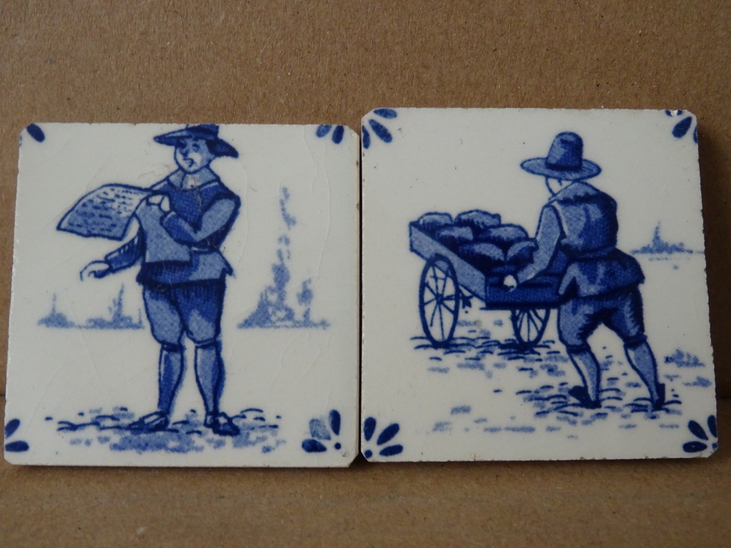 Delfts blauwe miniatuur tegeltjes stadsomroeper en boer vervaardigd rond 1950 of later. Afgebeeld zijn een stadsomroeper (aanzegger) en boer uit de zeventiende eeuw. In nog vrij goede staat, puntgaaf. Twee nieuwe haakjes worden meegeleverd om er zelf op te plakken met lijm (zie laatste foto’s). Afmetingen circa 4,6 bij 4,6 en circa 4,6 bij 4,8 cm. Dikte 0,5 cm.