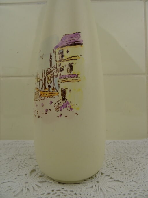 Aardewerk vaas Dom Keramik een weinig voorkomende vaas vervaardigd rond 1950. Op de schitterend vormgegeven vaas is een voorstelling geschilderd met onder andere twee boten en een huis. De vaas werd gemaakt in Nederland in Echt. Ze is aan de onderzijde gestempeld Staffel Limburg Echt Dom Keramik Handgemalt. Het object is in goede staat, puntgaaf.