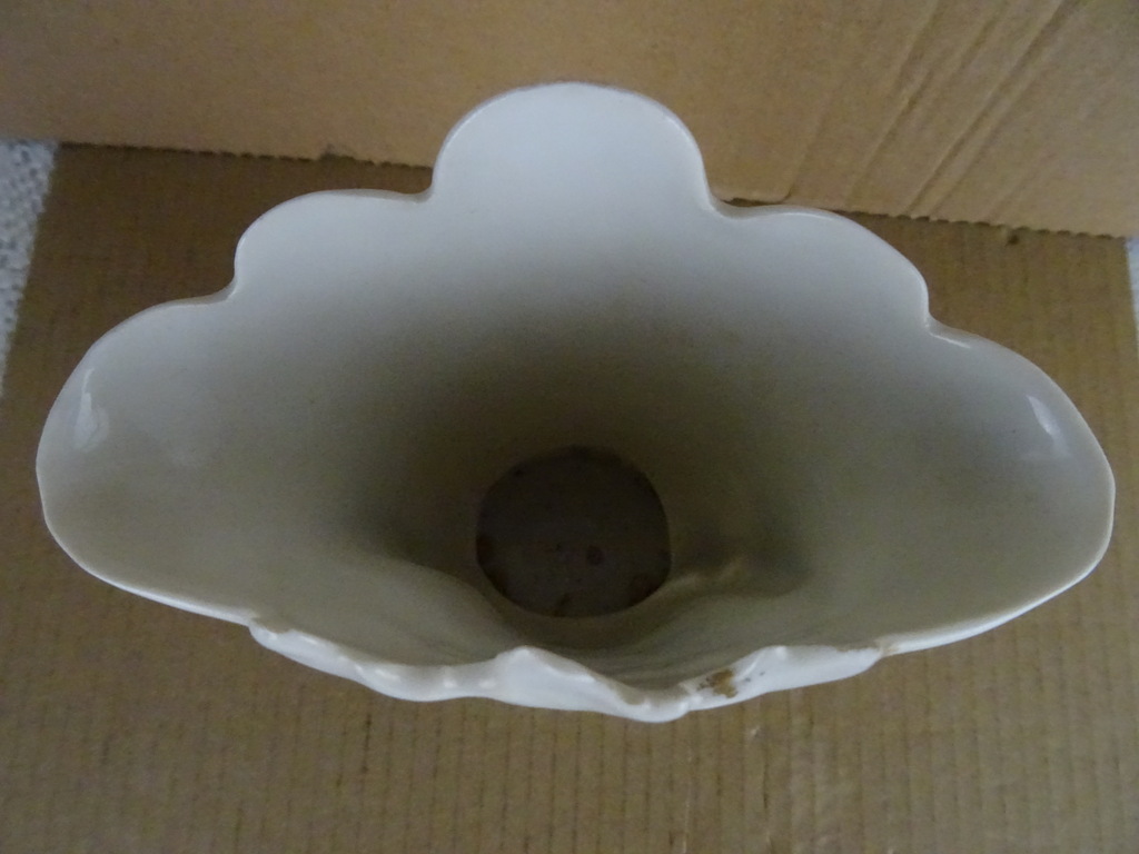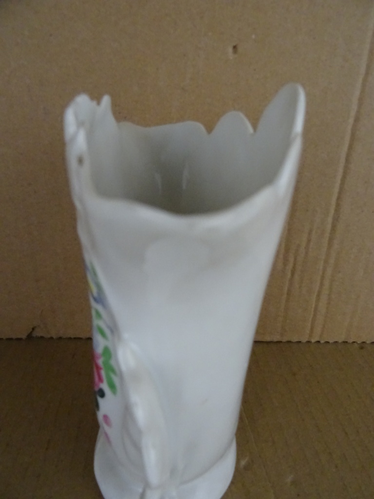 Antieke vaas met schulprand vervaardigd in de eerste helft van de vorige eeuw of nog iets eerder. Ze is prachtig verrijkt met florale decoratie (geschilderd). De elegante porseleinen vaas is puntgaaf, aan de binnenkant twee minuscule chipjes of afwijkende plekjes. De maker van de fraaie vaas is onbekend.