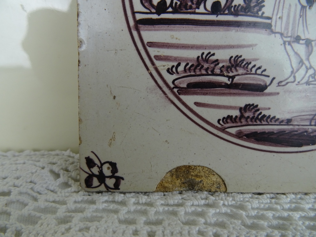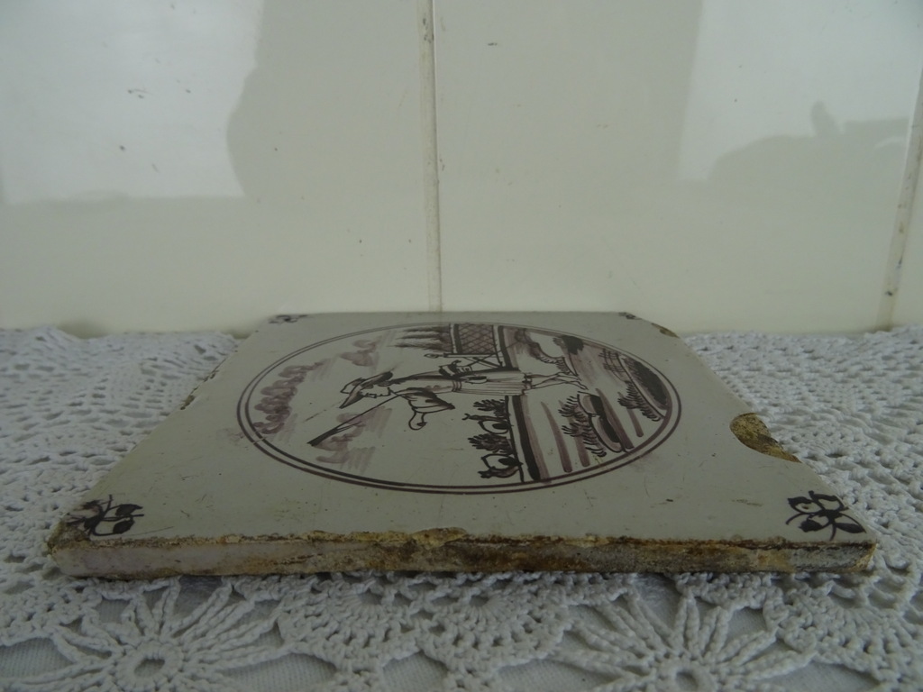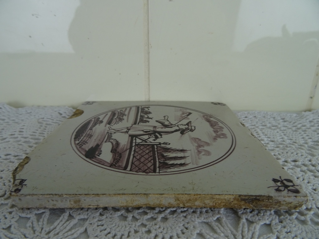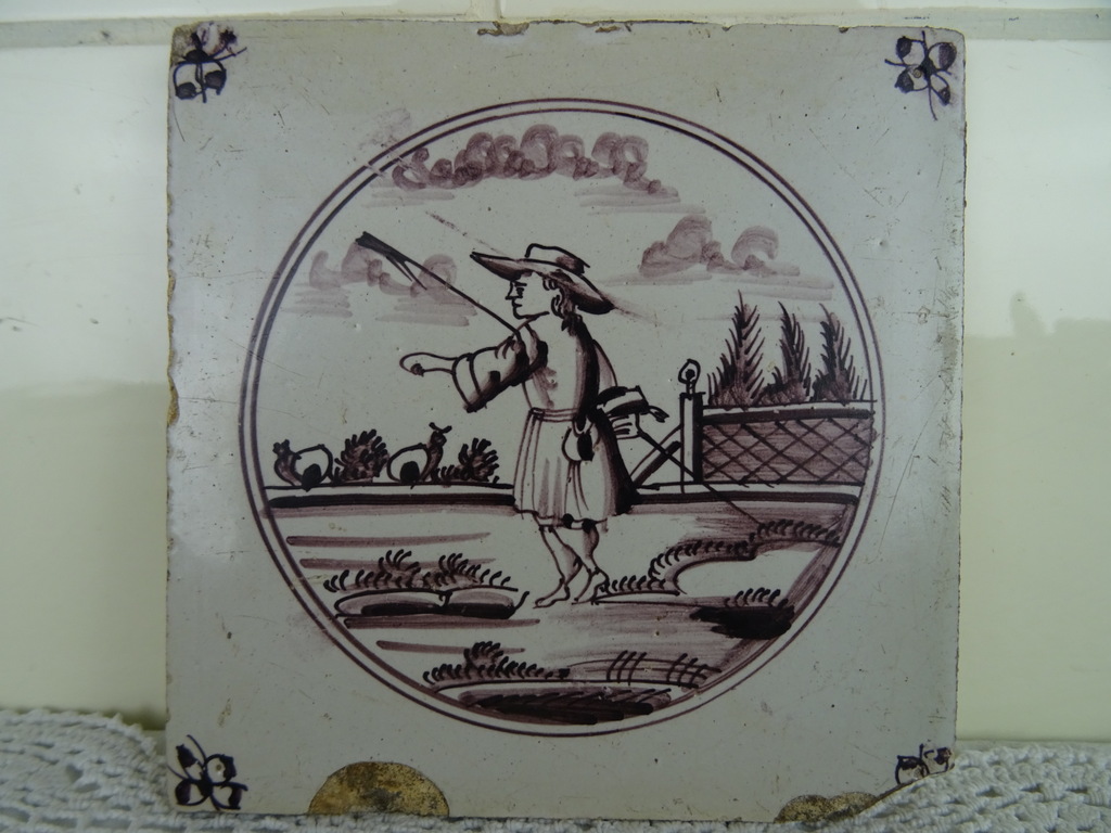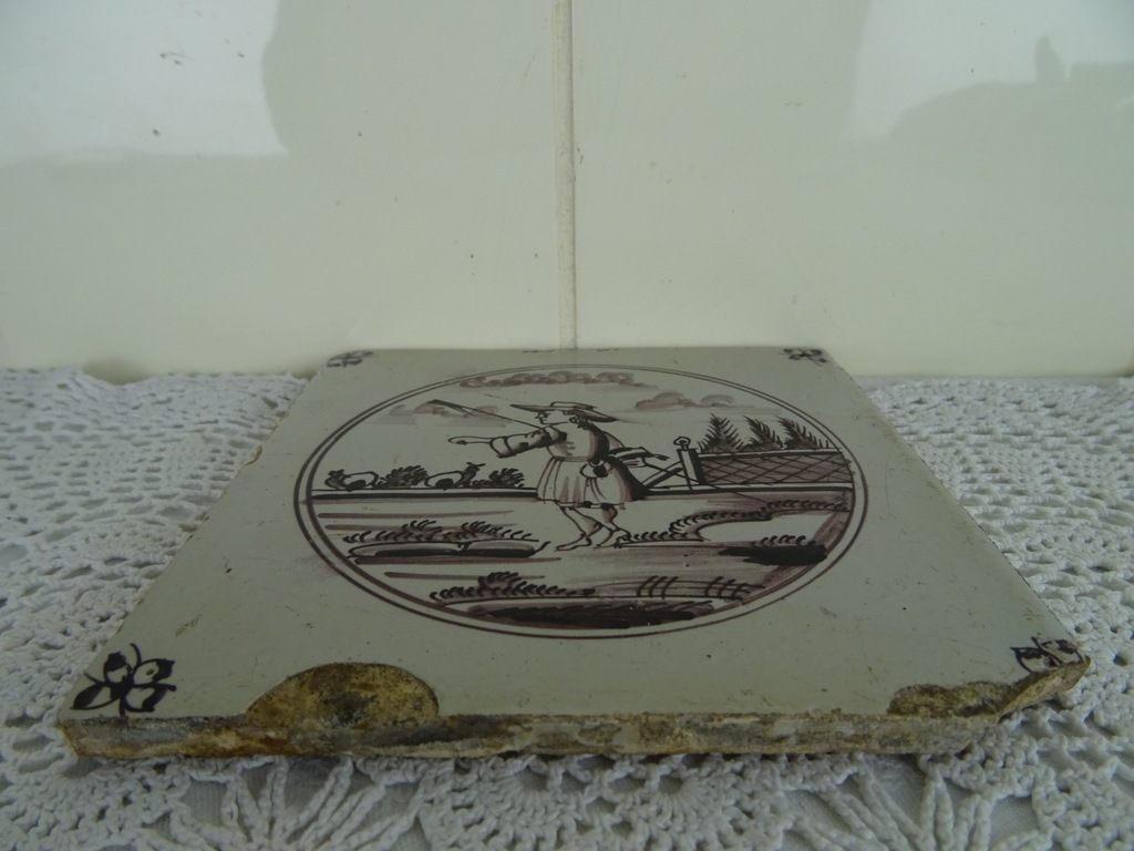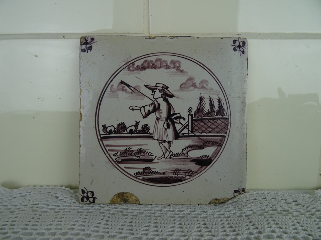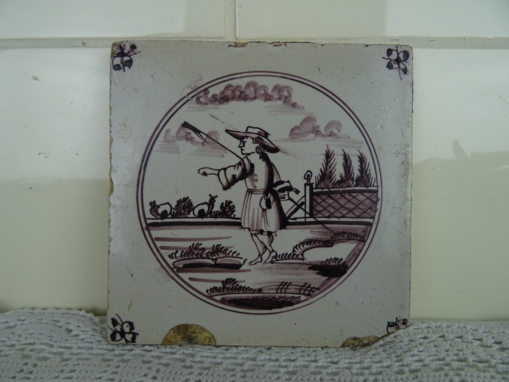 Antieke aardewerk tegel met visser vervaardigd rond circa 1850 (schatting). Afgebeeld is een visser staand aan de kade. Hij heeft een lange hengel vast. De fraaie tegel is in redelijke staat, mist wat chipjes en een hoekje, zie foto’s. Het blijft echter een schitterende niet-alledaagse tegel.