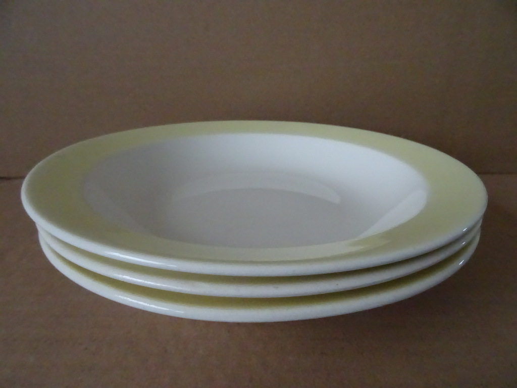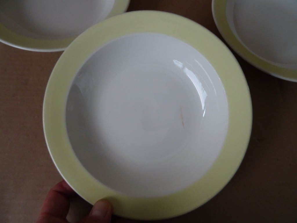 Pastel gele soepborden Royal Sphinx P. Regout vervaardigd rond 1950. Serveer uw soep of diner in stijl! De borden zijn een lust voor het oog dankzij de vrolijke pastelgele rand. Ze zijn gemerkt; Royal Sphinx P. Regout & co Maastricht Made in Holland. Alle drie de borden zijn puntgaaf. Twee borden hebben slechts lichte ouderdomsplekjes, zie foto’s. Er zijn nog twee van deze soepborden op voorraad zonder ouderdomsvlekjes (Vintage set borden P Regout) Ze staan momenteel te koop met 2 andere borden erbij. Indien gewenst kan de aankoop dus aangepast worden naar 4 of 5 soepborden of naar 3 soepborden zonder ouderdomsvlekjes. Stuur in dat geval even een mailtje.