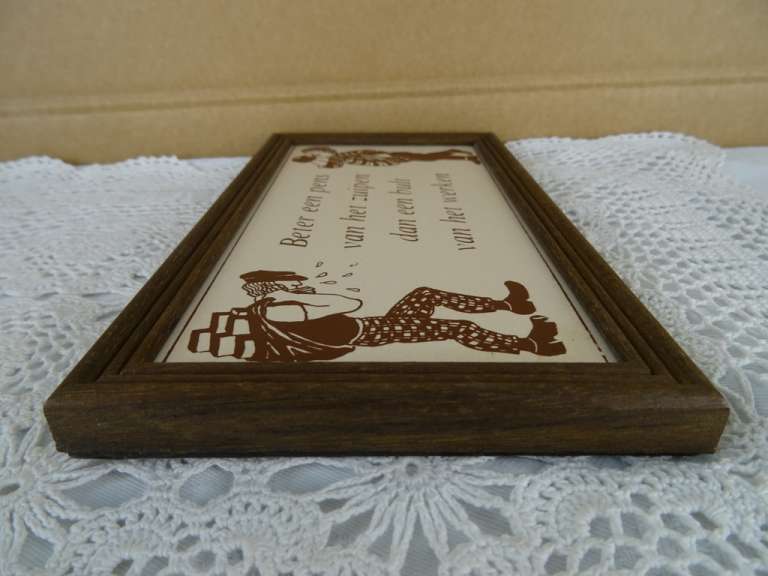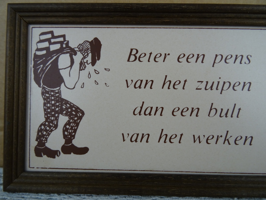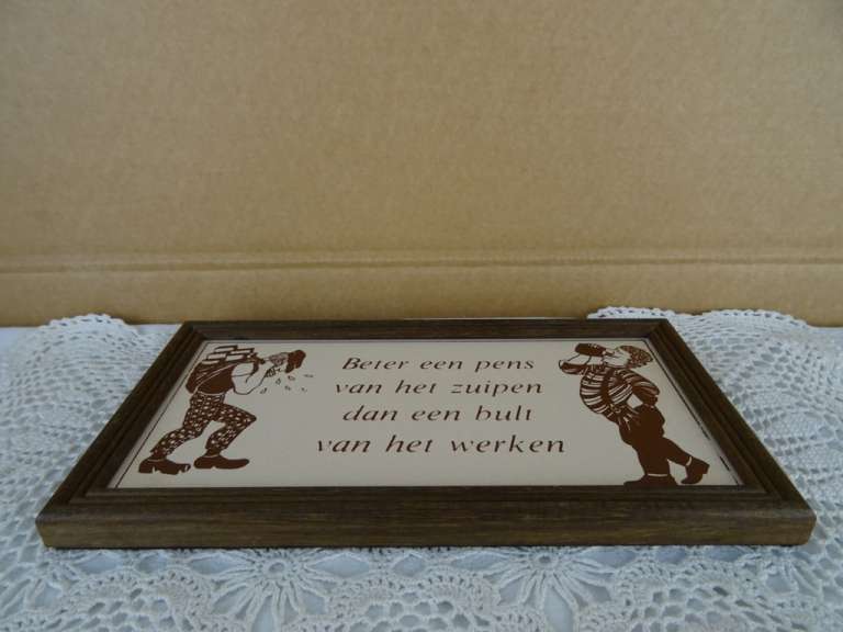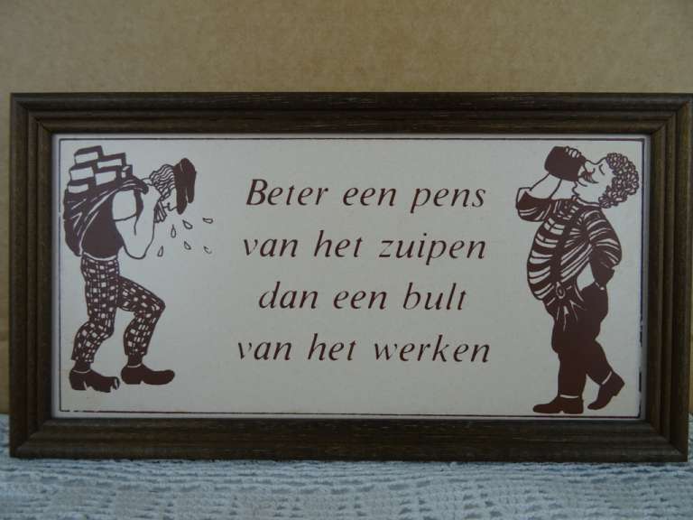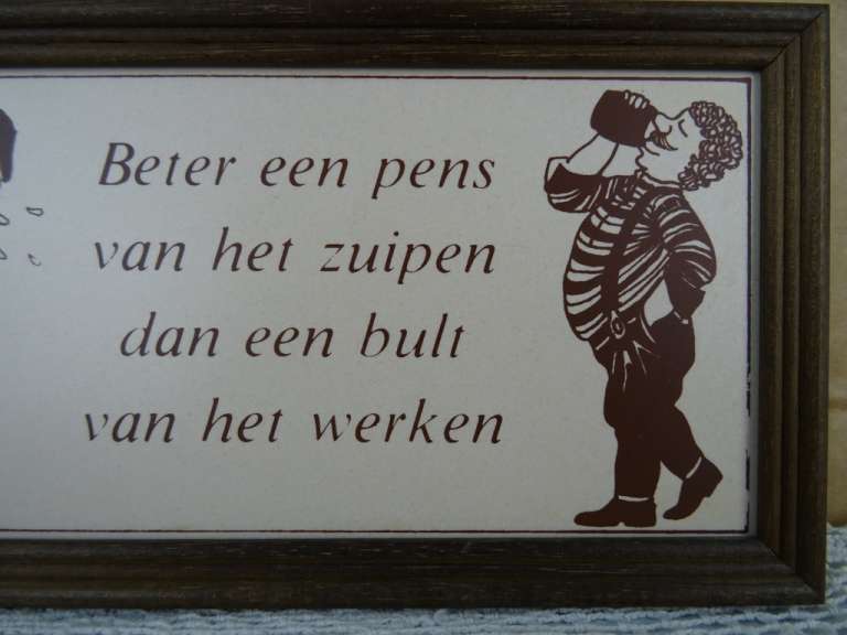 Antieke tegel met spreuk vervaardigd rond 1950. De grappige (zware) tegel is voorzien van de tekst; Beter een pens van het zuipen dan een bult van het werken. Aan de zijkanten zijn een harde werker en een vrolijke drinker afgebeeld. De tegel is ingelijst in een geprofileerd houten lijstje. Het geheel is nog in vrij goede staat, zie foto’s.