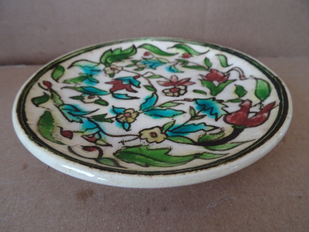 Kleurrijk wandbordje 12cm vintage vervaardigd rond 1950 of later. Het fraaie bordje is nog in goede staat, puntgaaf. De herkomst is onbekend. De houten standaard is bij de koop inbegrepen.