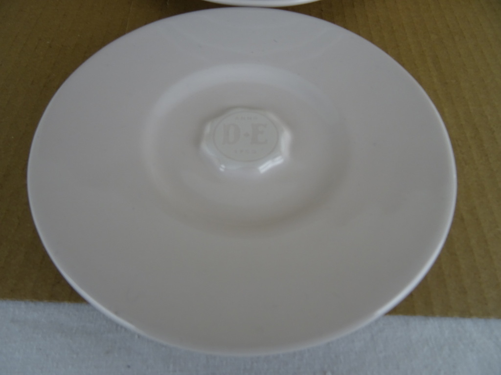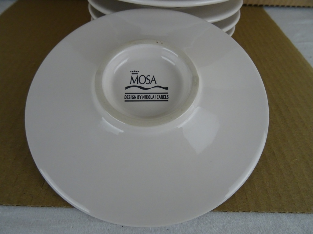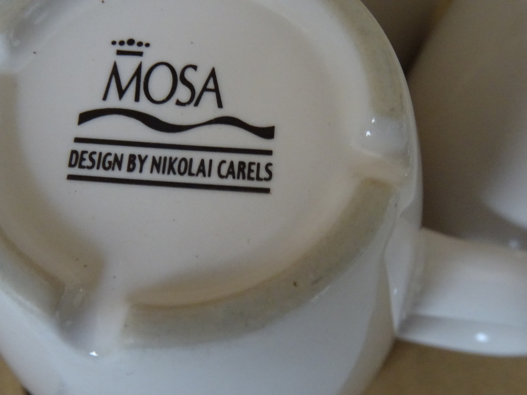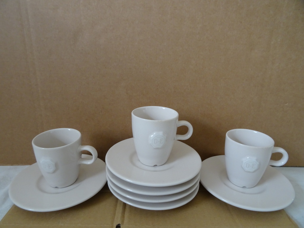 Kop en schotels Douwe Egberts Nikolai Carels vervaardigd door Mosa in de tweede helft van de vorige eeuw of later. De zes fraaie design schotels zijn puntgaaf, haast als nieuw. Verrijk uw kopjes met de juiste schotels. Toegevoegd zijn 3 bijbehorende kopjes in een prachtige gebruikte staat, zie foto’s.
