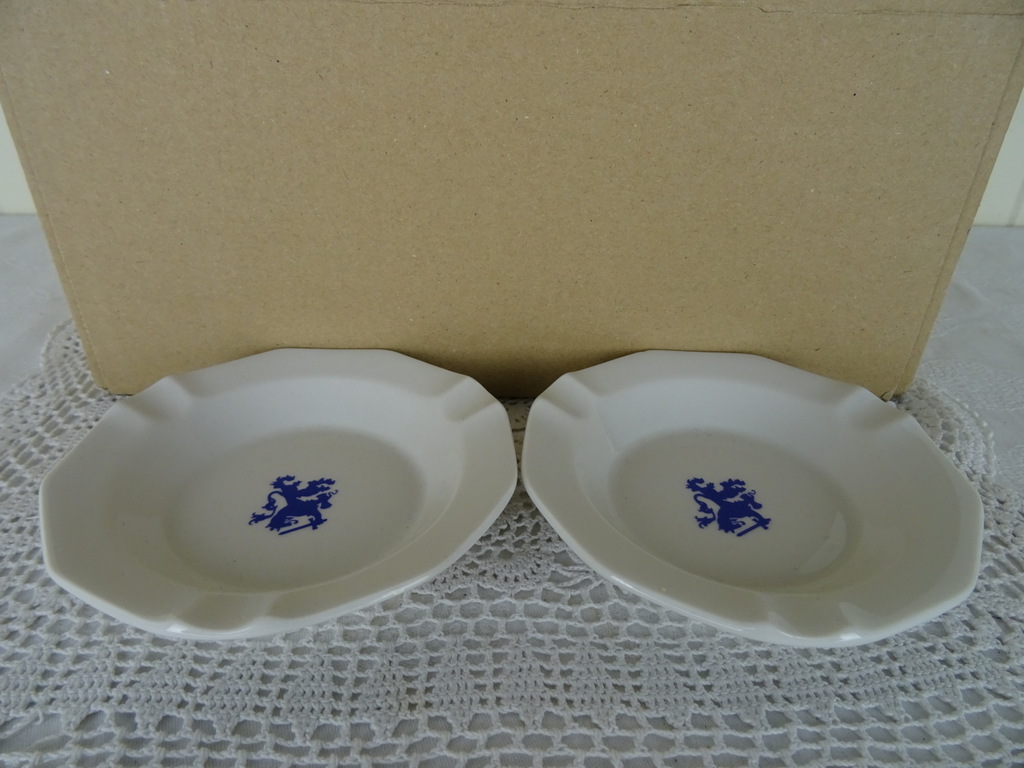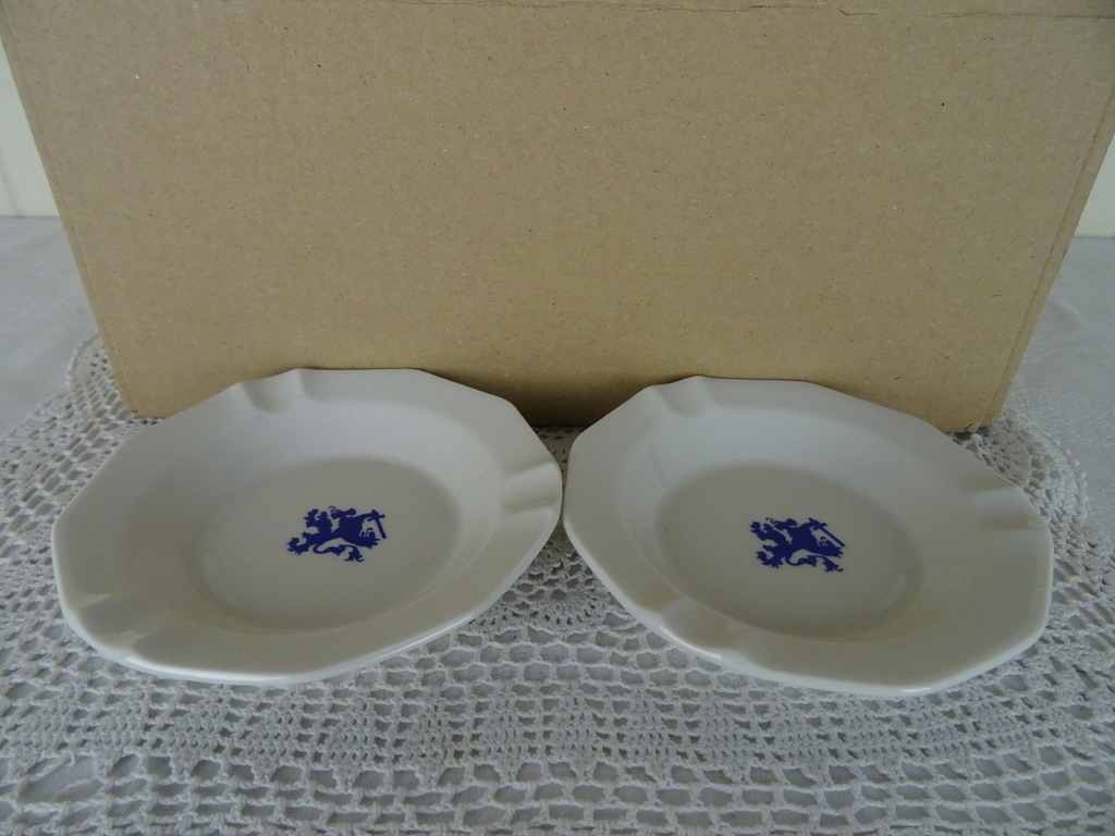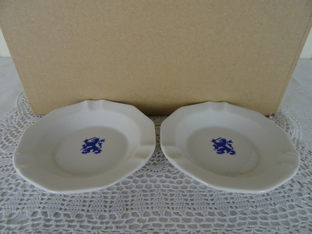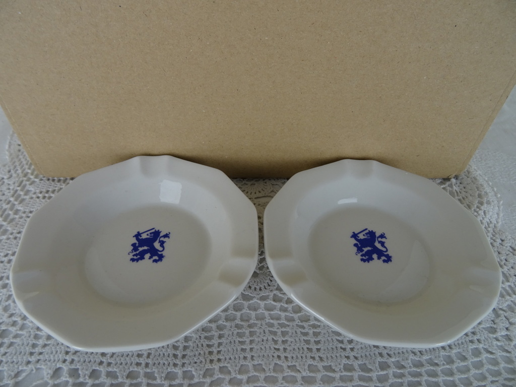 Twee asbakjes met Hollandse leeuw vervaardigd door Royal Sphinx voor 1958. De zogenaamde Generaliteitsleeuw was het wapen van de Unie van Utrecht. Het was ook het wapen van de Republiek der Zeven Verenigde Nederlanden. Het was de voorloper van het Wapen van het Koninkrijk der Nederlanden. Beide asbakjes hebben een doorsnede van 12 cm. Ze zijn nog in vrij goede staat, puntgaaf.