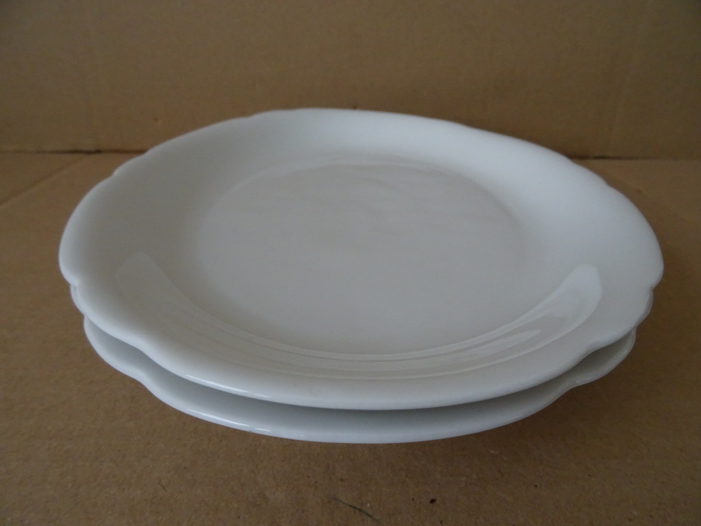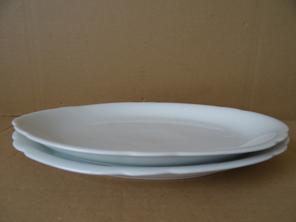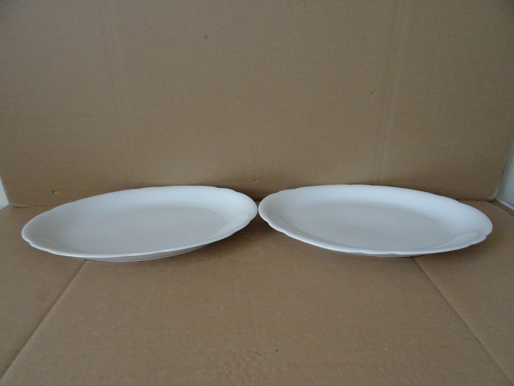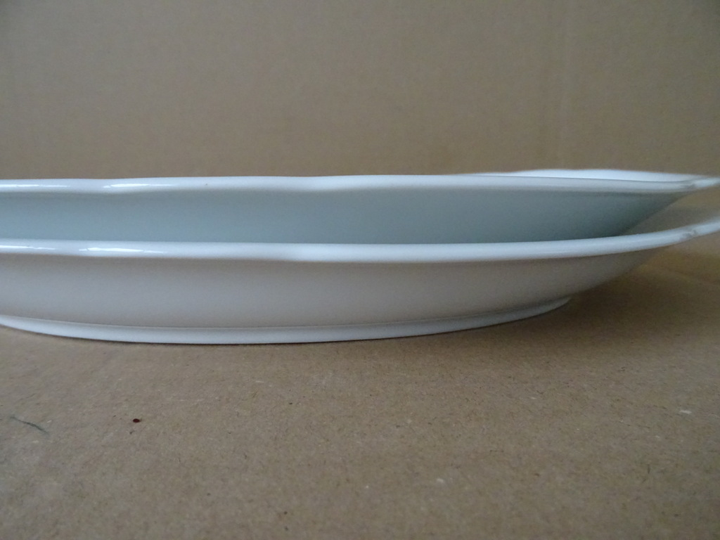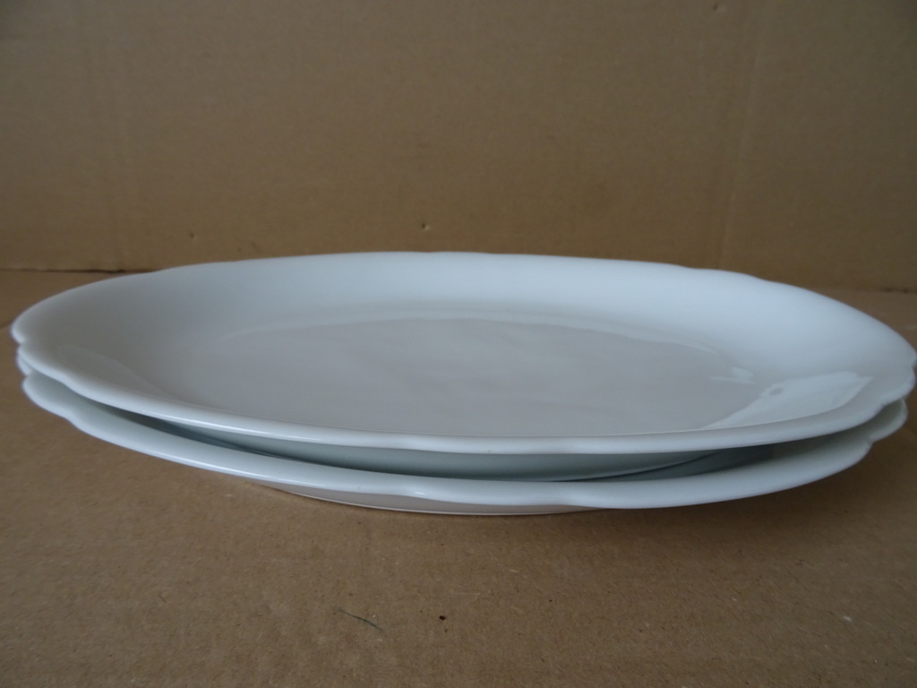 Twee vintage dinerborden of serveerschalen met schulprand vervaardigd rond 1950 wat eerder. De fraaie identieke porseleinen borden of schalen zijn 31 bij 22 bij 3 cm. Ze zijn beide nog in goede staat, puntgaaf. Ongemerkt. Serveer uw maaltijd in stijl!