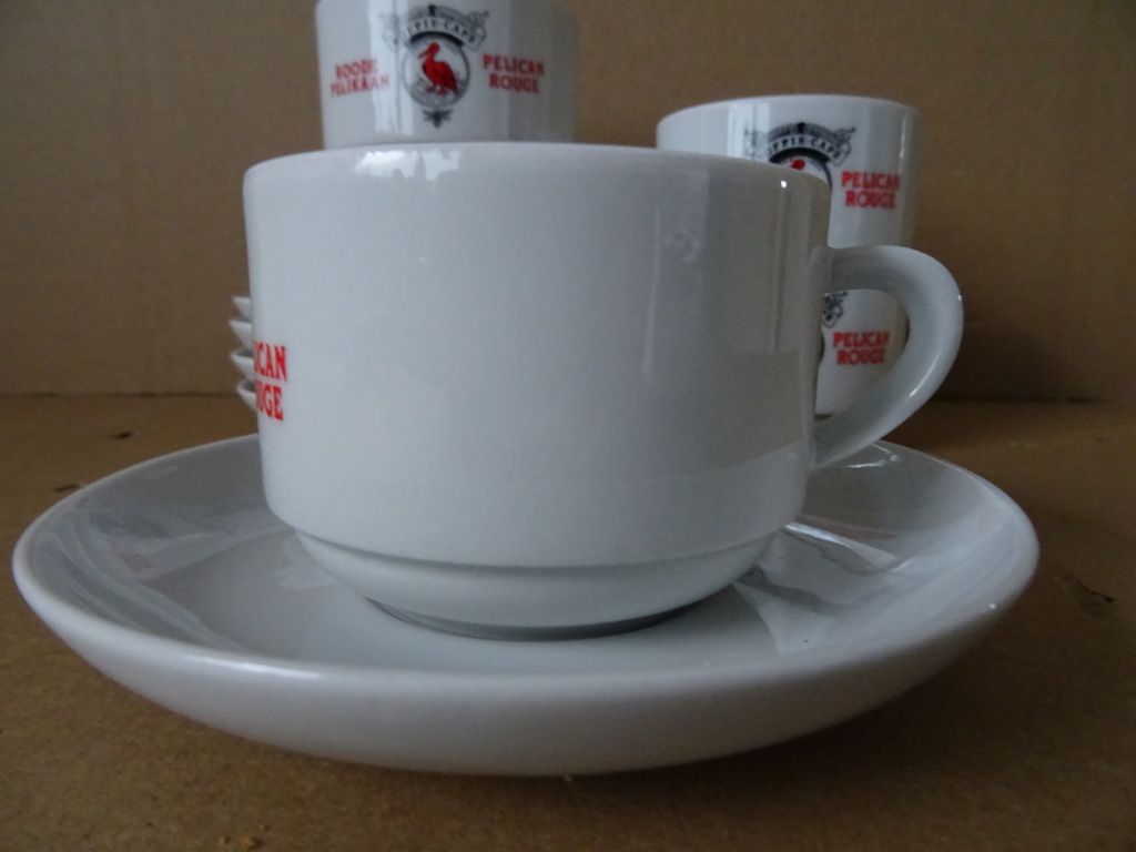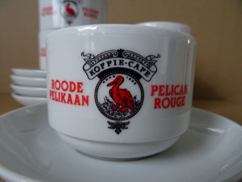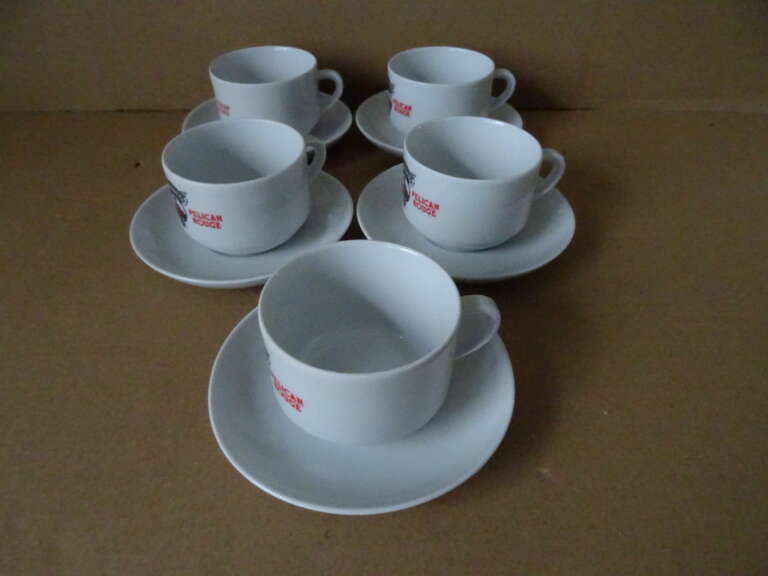 Vintage kop en schotels Roode pelikaan Pelican rouge vervaardigd rond 1950 of wat later. Zeldzaam. Alle 5 de koppen en schotels zijn puntgaaf. Afmetingen per stuk circa 13 bij 13 bij 6,5 cm.