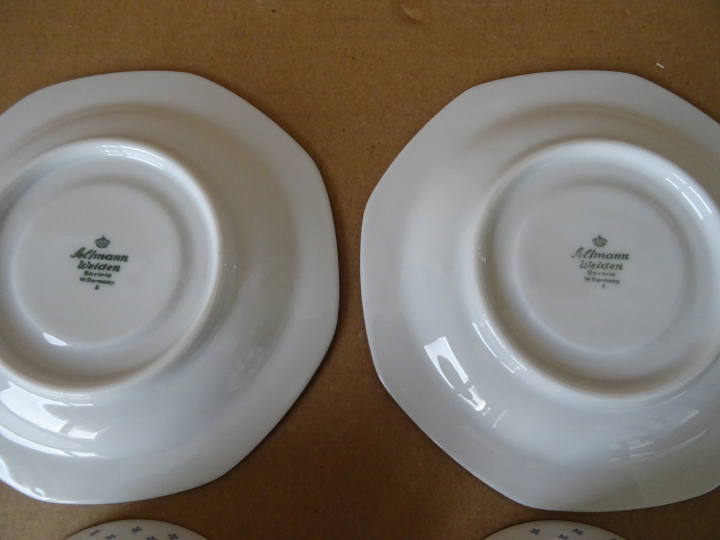 Vintage kop en schotels Seltmann Weiden Bavaria W. Germany vervaardigd na 1950. Ik vond deze set netjes opgeborgen in een vitrinekast met vintage porselein en aardewerk. Een kopje mist een minuscuul chipje in de rand, niet veel groter dan een speldenprik. Verder is de set puntgaaf en haast als nieuw. Afmetingen kopjes; circa 10,2 bij 8,5 bij 5,3 cm. Schotels; 14,3 bij 14,3 bij 1,6 cm. Serveer uw koffie in stijl!