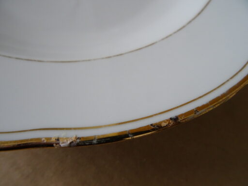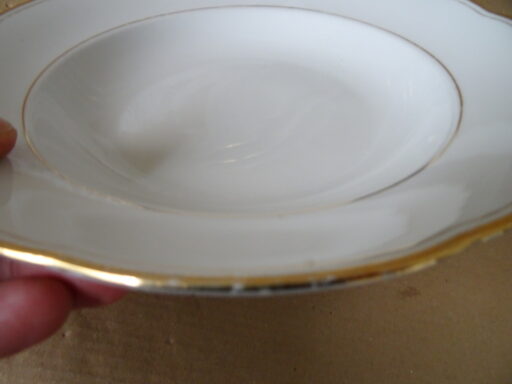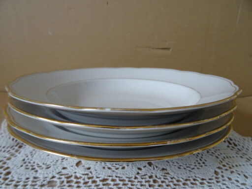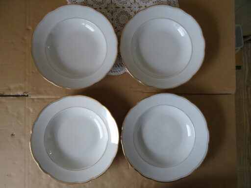 Vintage set Thuringia vergulde soepborden pastaborden vervaardigd rond 1960 of later. Drie van de vier borden zijn in een prachtige gebruikte staat, puntgaaf. Hier en daar is slechts de vergulde rand wat weggesleten. Bord vier heeft waarschijnlijk in de magnetron gestaan, zie foto’s van de vergulde rand. Serveer uw soep of pasta in stijl!
