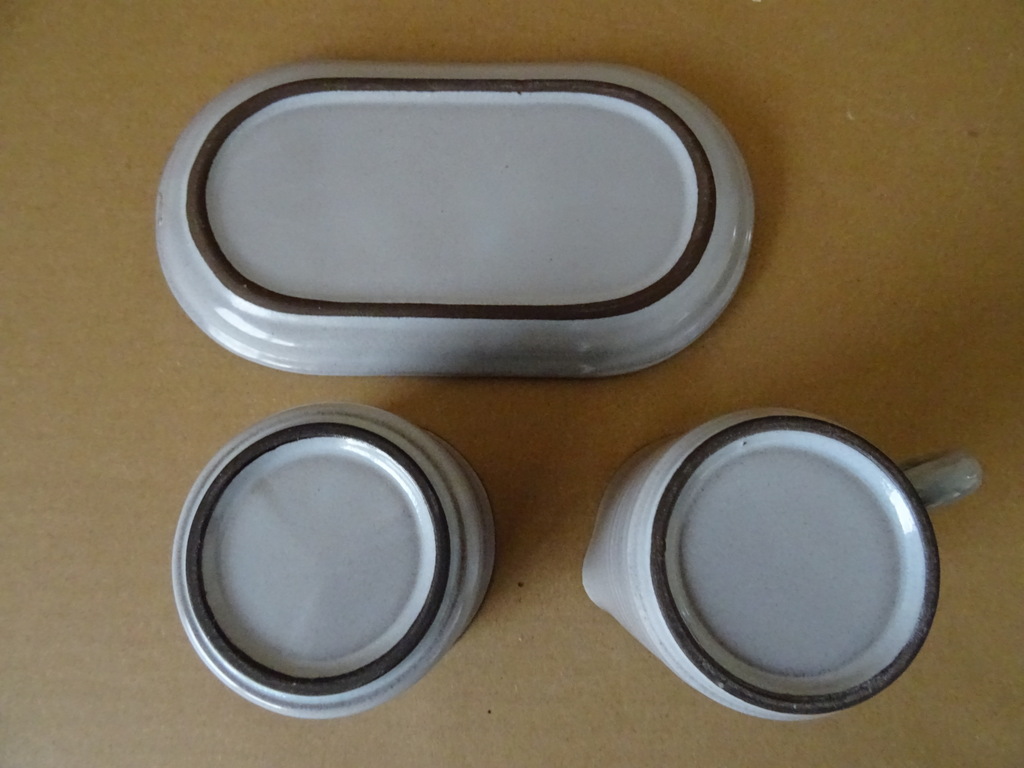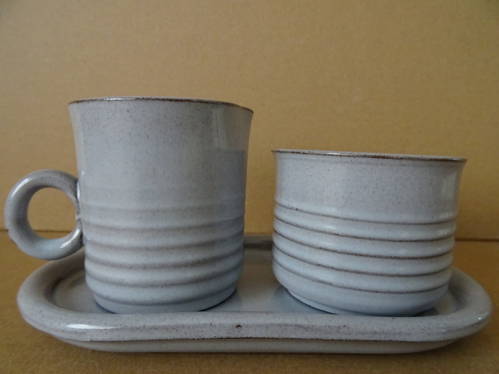 Vintage suiker en melk stel vervaardigd rond 1970 of iets later. Ik vond deze prachtige handgemaakte aardewerk set netjes opgeborgen in een vitrinekast met vintage porselein en aardewerk. Puntgaaf en haast als nieuw. Schaaltje; circa 18,7 bij 10,5 bij 2 cm. Melkkan; circa 9,5 bij 7 bij 7,5 cm. Suikerpot; circa 7,5 bij 7,5 bij 6 cm.