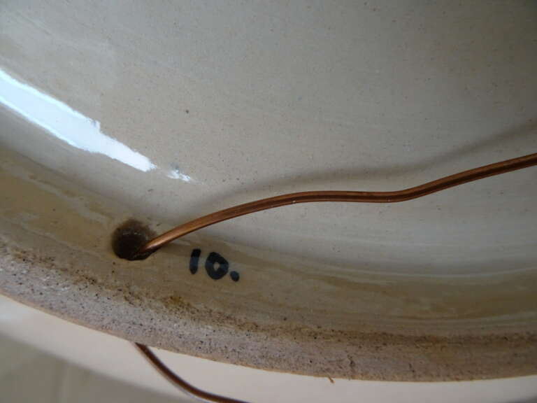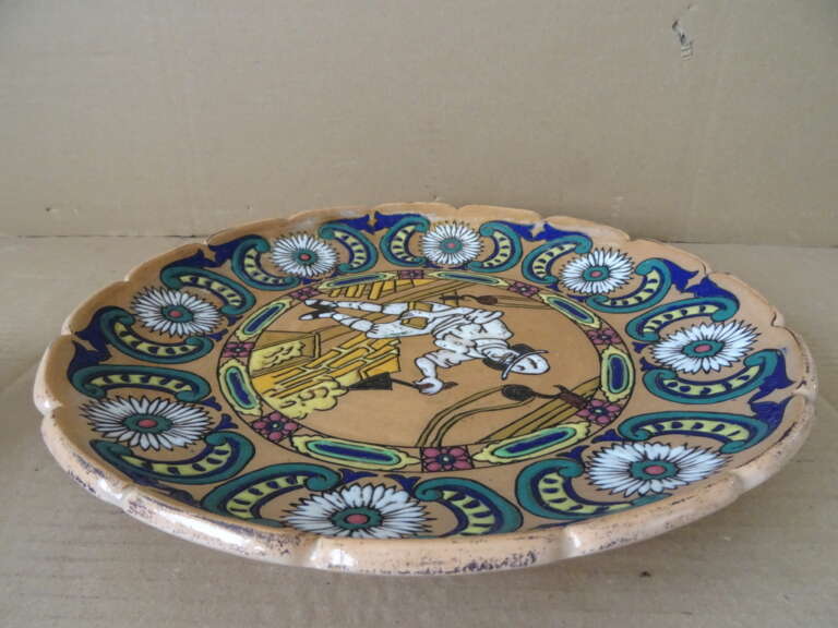 Vintage wandbord met metselaar 33cm vervaardigd rond 1950 of iets later. Op het bord is een geglazuurd tafereel te zien met een metselaar die aan het werk is met zijn troffel. Om het tafereel heen is florale decoratie aangebracht. Het geheel is geglazuurd, het bord is een waar pronkstuk. Het wandbord is in ieder geval op zijn minst een fraai eerbetoon aan de metselaar. Het is puntgaaf, de vergulde laag op de rand is slechts haast helemaal verdwenen in de loop der jaren.