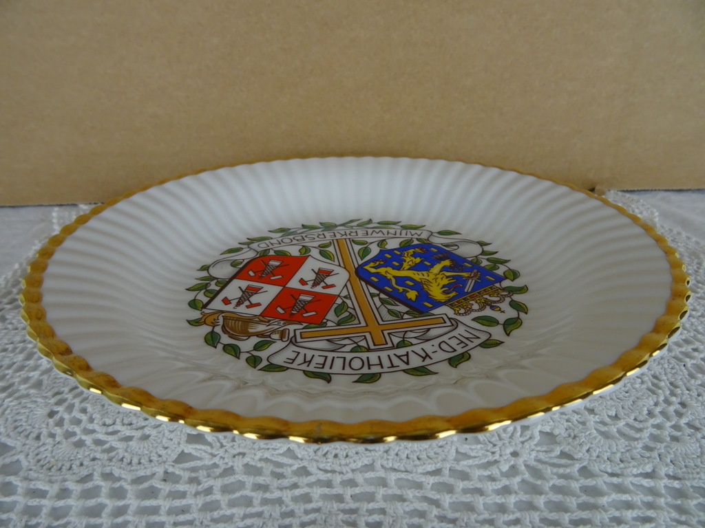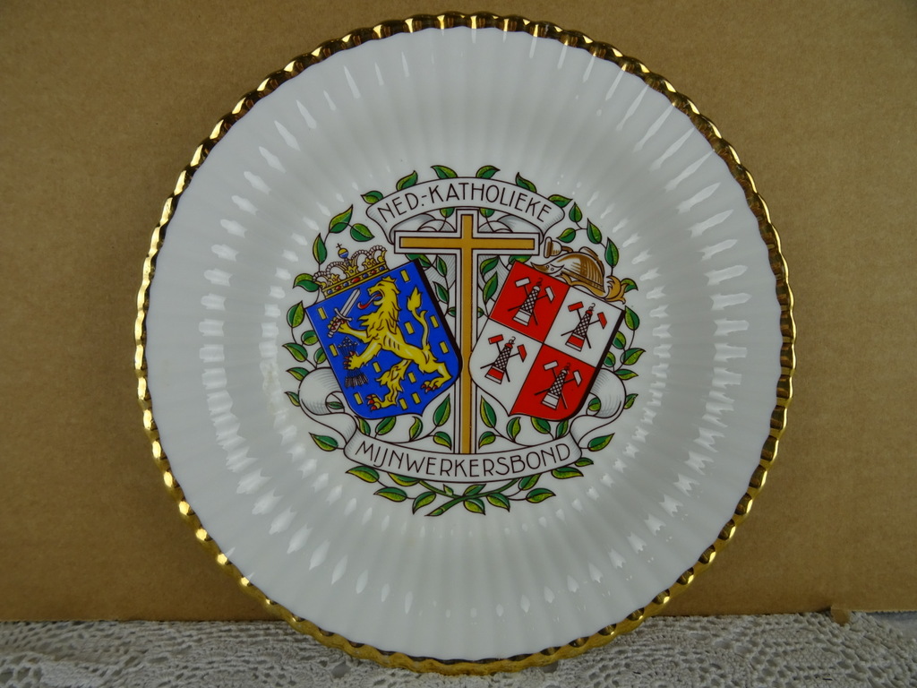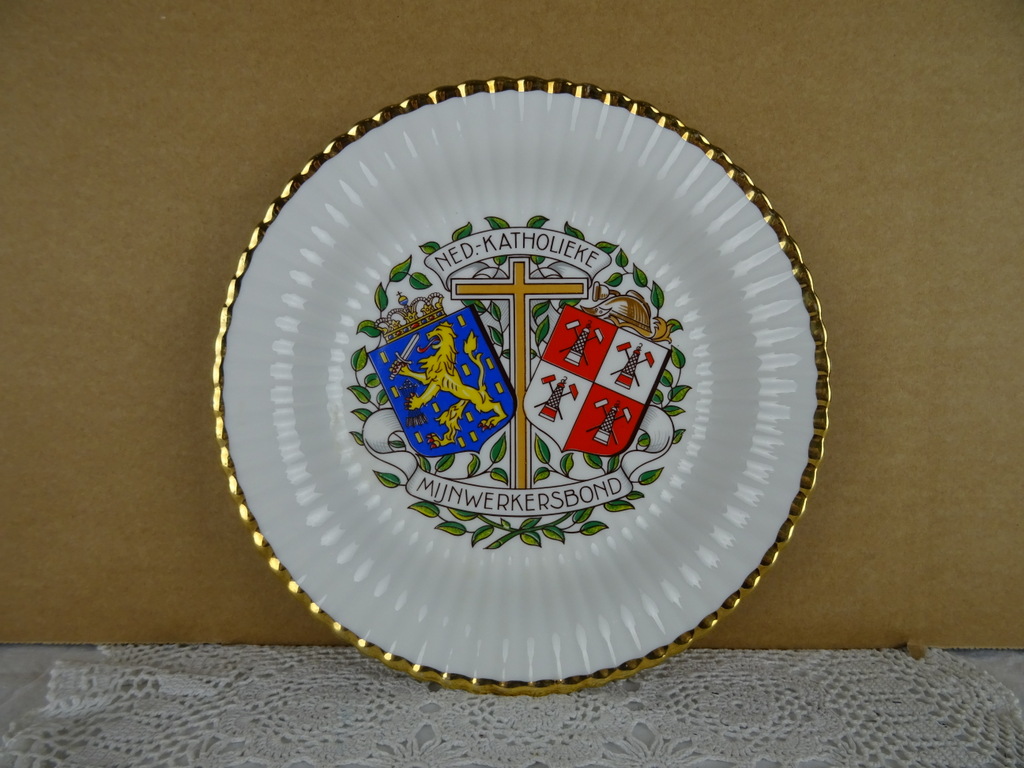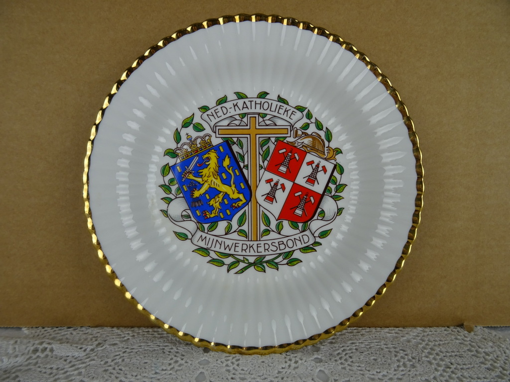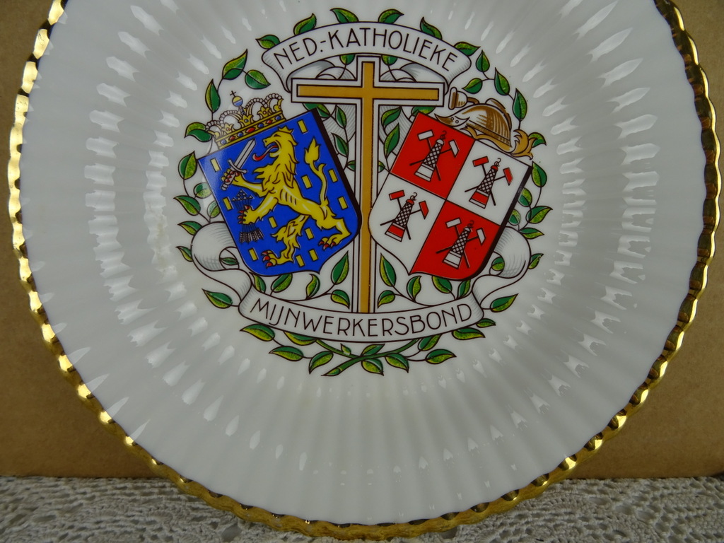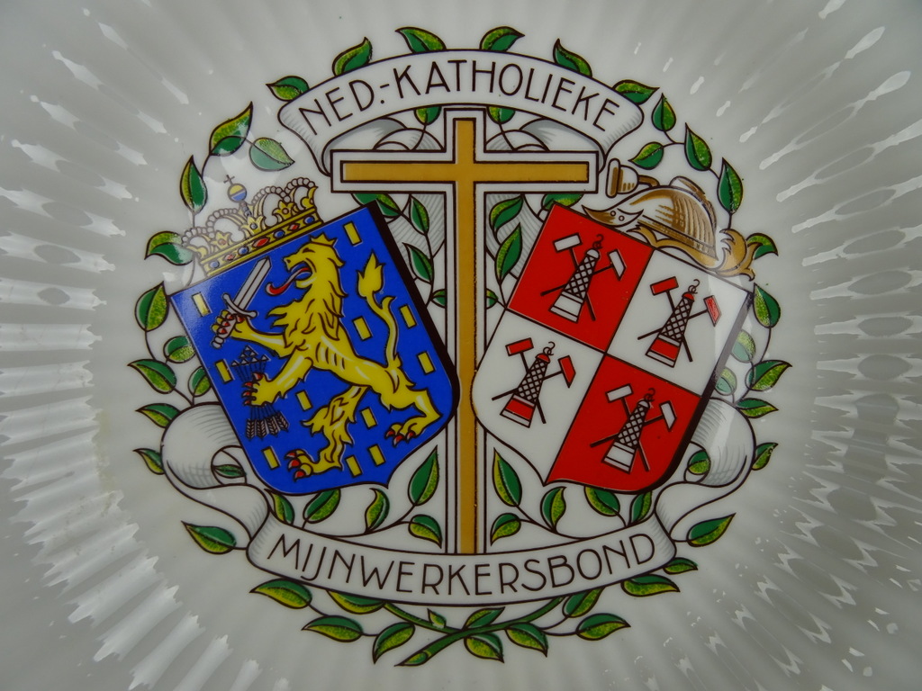 Vintage wandbord Mijnwerkersbond vervaardigd bij Mosa Maastricht rond 1950. In het midden is een kruis te zien met links ervan een wapen met de Hollandse leeuw. Rechts ernaast is het wapen van de Ned.-Katholieke Mijnwerkersbond te zien. Hierop zijn vier mijnlampen afgebeeld met ervoor telkens twee hamers (kruiselings). Het geheel is verrijkt met florale decoratie. Het bord is in goede staat, puntgaaf.