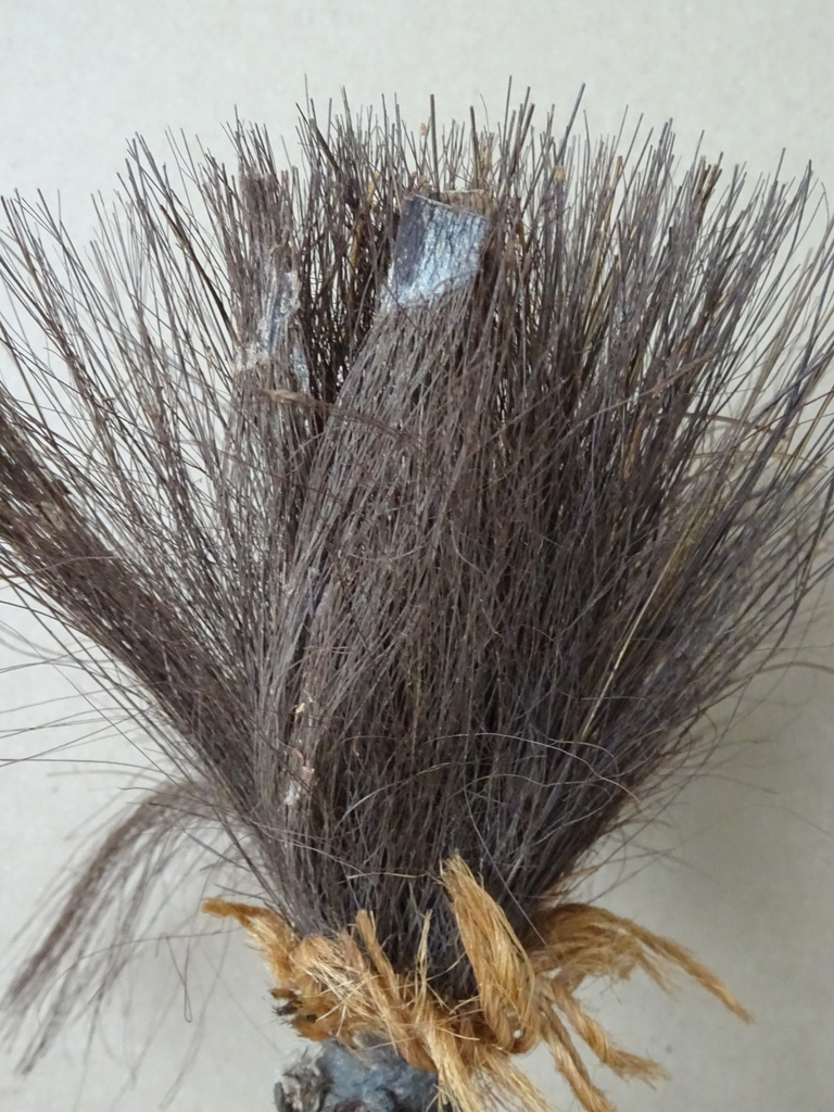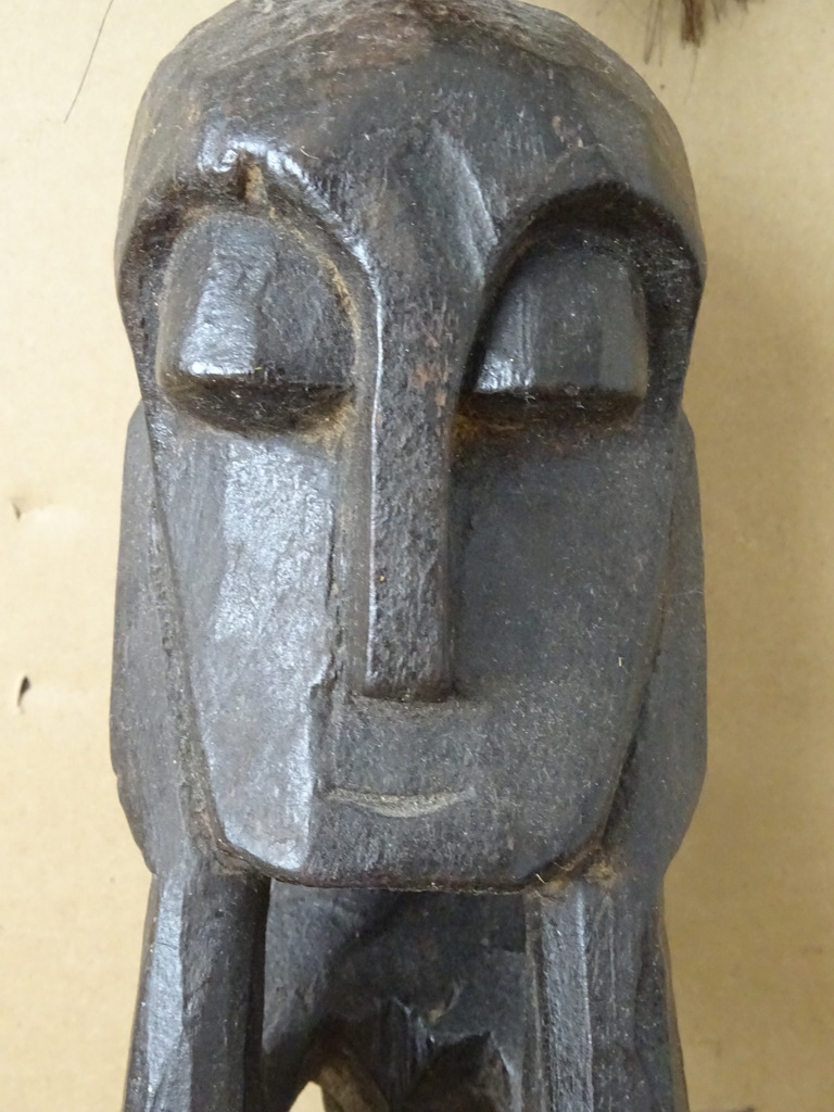 Afrikaans beeld De denker 43cm inclusief haardos vervaardigd rond 1970 of later. Afgebeeld is een zittende figuur die aan het nadenken of mediteren is. Het beeld is op prachtige wijze gesneden uit een lichte inheemse houtsoort en voorzien van echte haren (van een dier). Het beeld is in een schitterende gebruikte staat, zie foto’s. Hoogte exclusief haardos circa 31 cm.