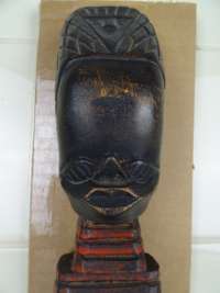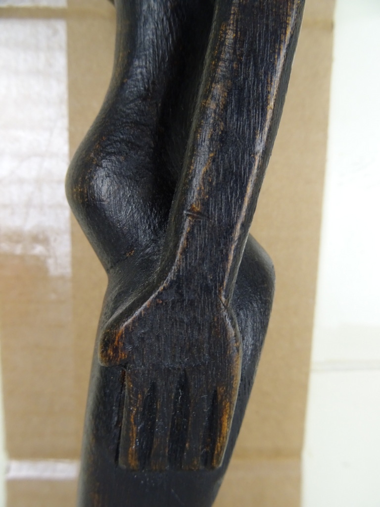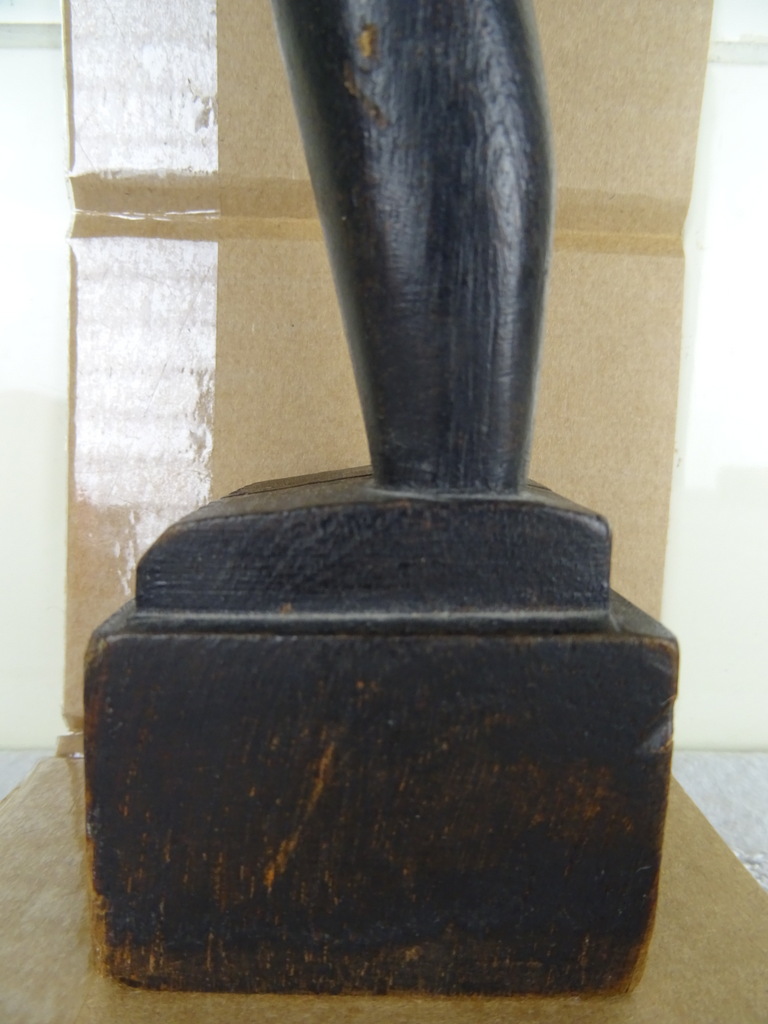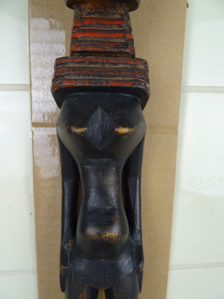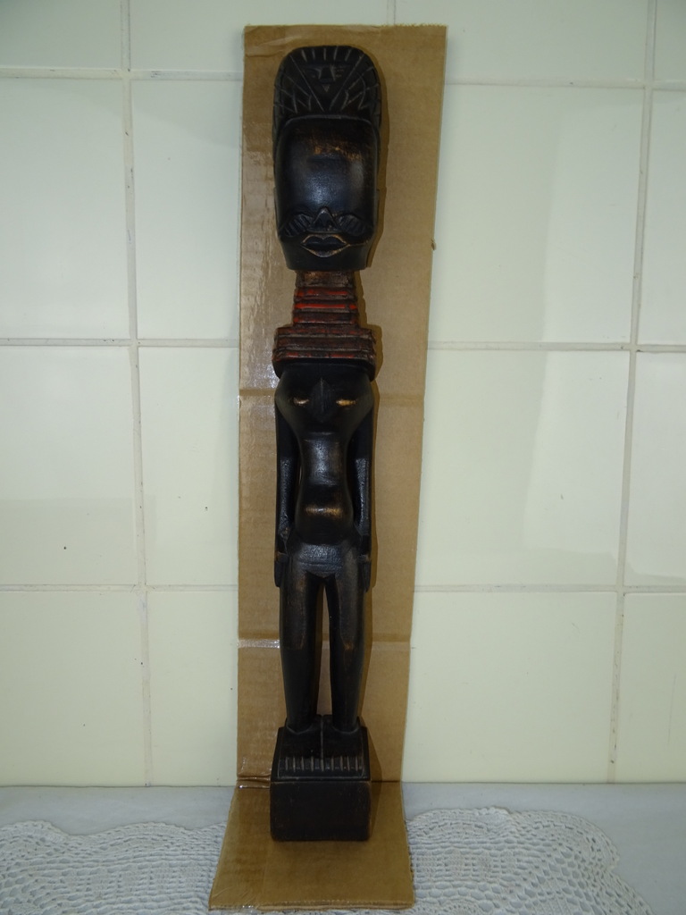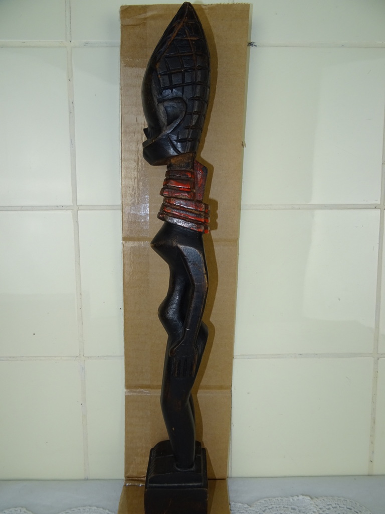 Afrikaans houten vruchtbaarheidsbeeld vervaardigd in de tweede helft van de vorige eeuw. Afgebeeld is een naakte vrouw met haar handen tegen haar dijbenen aan gedrukt. Ze kijkt stoïcijns voor zich uit. De vrouw heeft een bol buikje en een opvallend kapsel. Bovenin het haar is een gezicht afgebeeld. Wat verder opvalt is dat ze zes voorwerpen om haar lange nek heeft hangen. Het fraaie houtsnijwerk is in goede staat, puntgaaf. Hier en daar is de lak wat weg, zie foto’s. Dit geeft het beeld alleen maar extra allure.