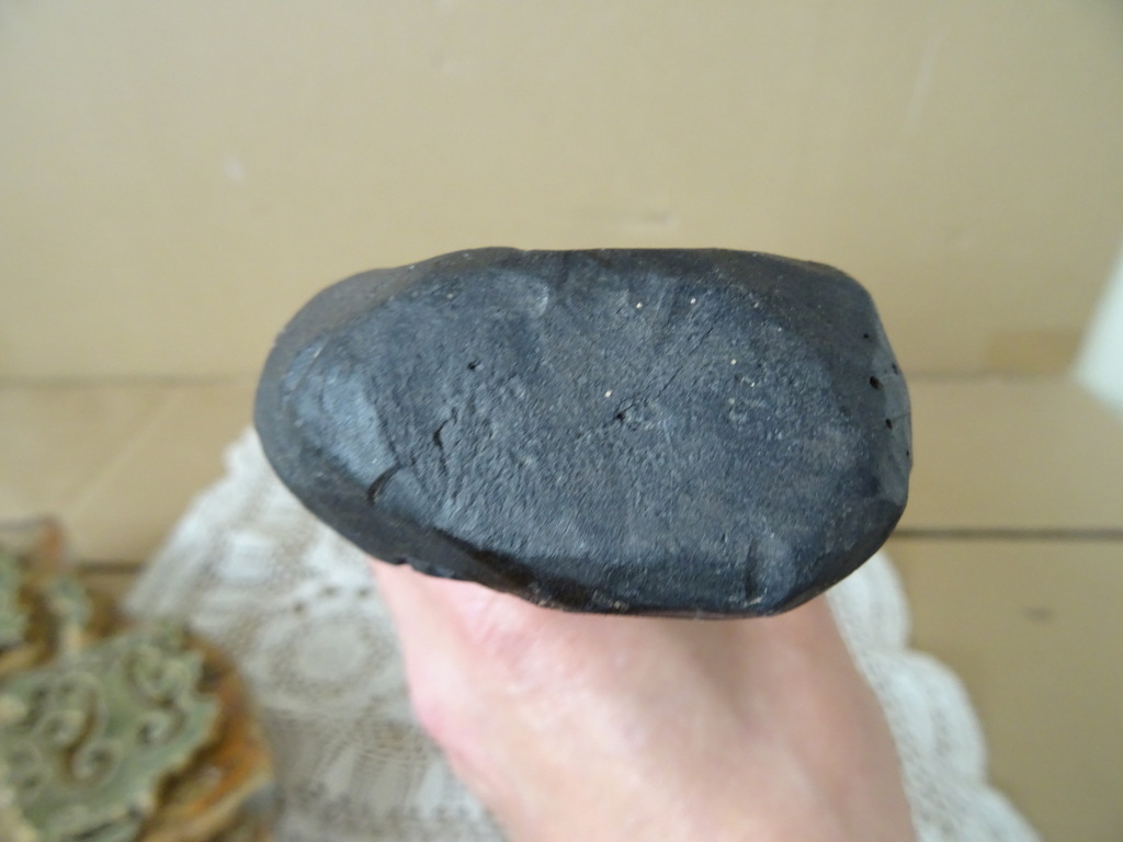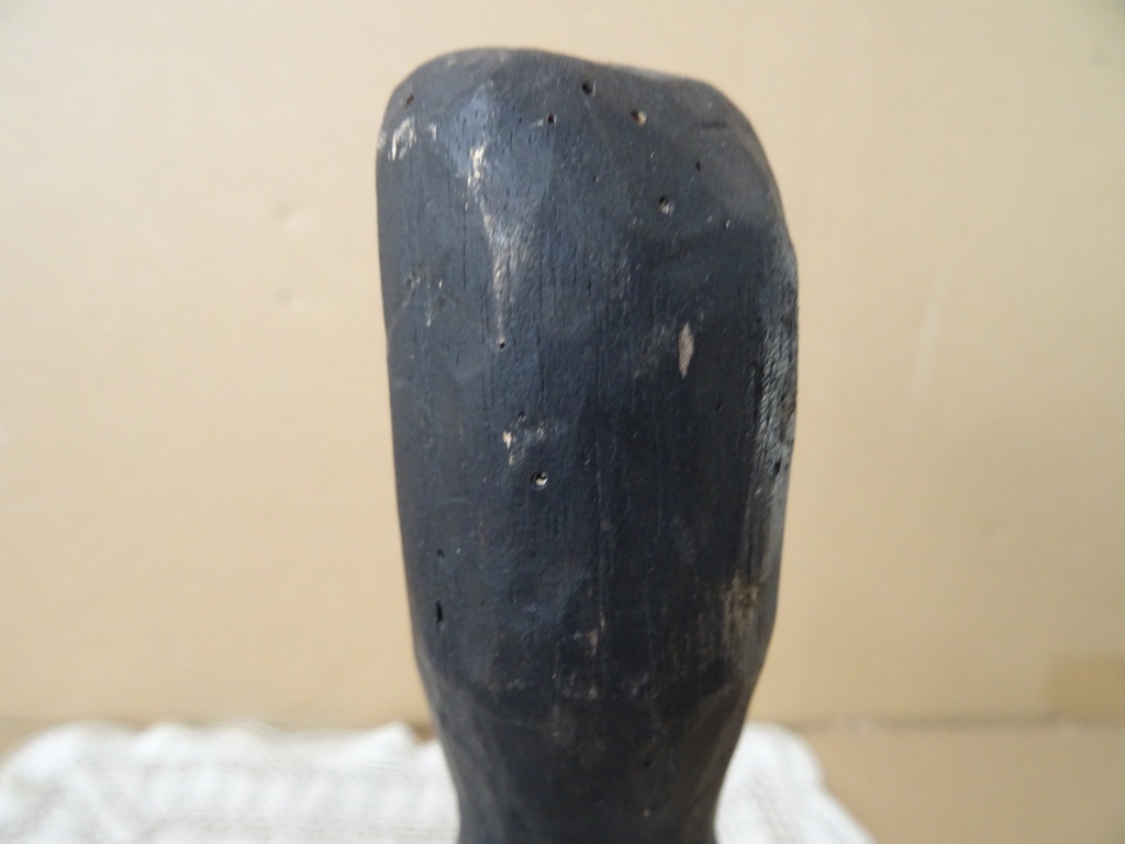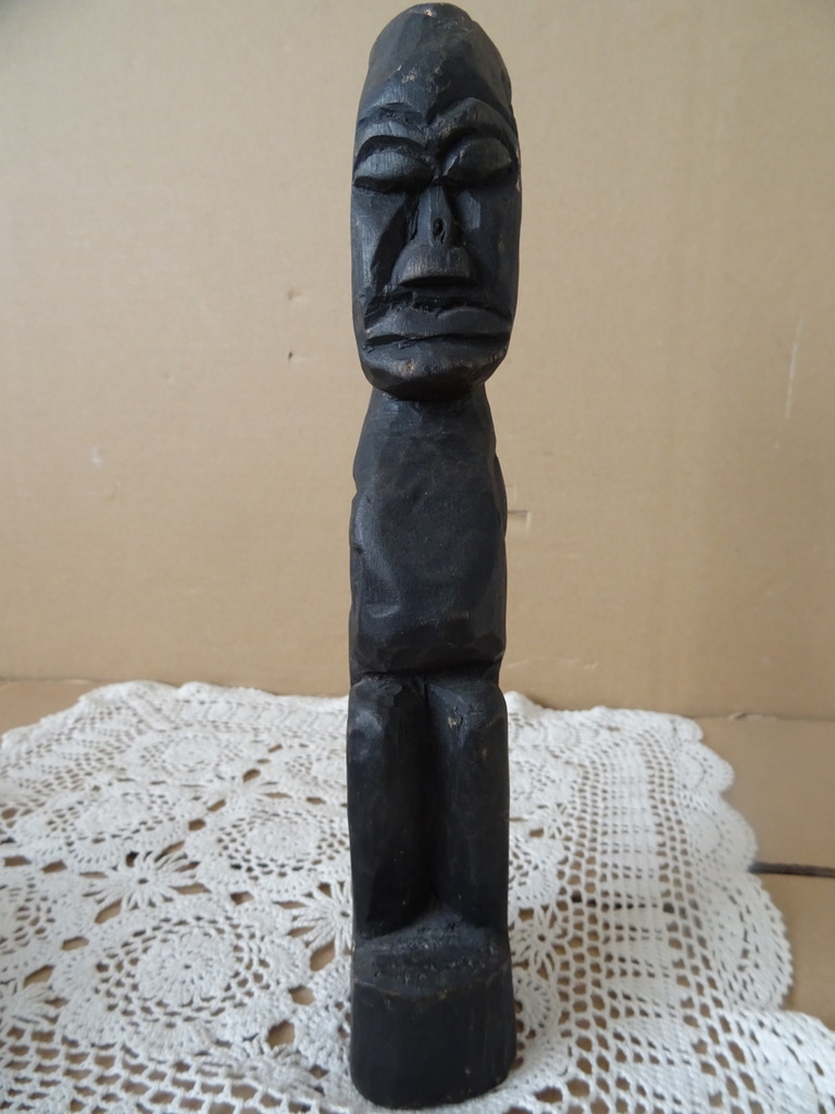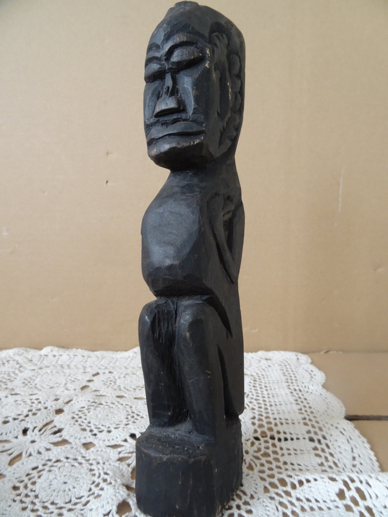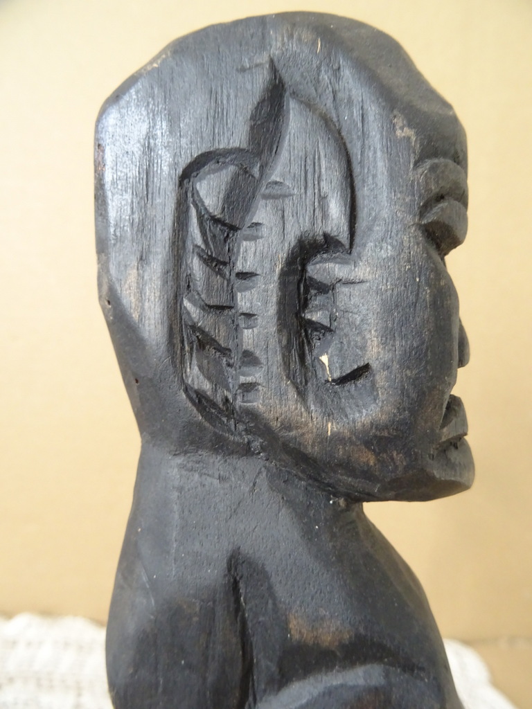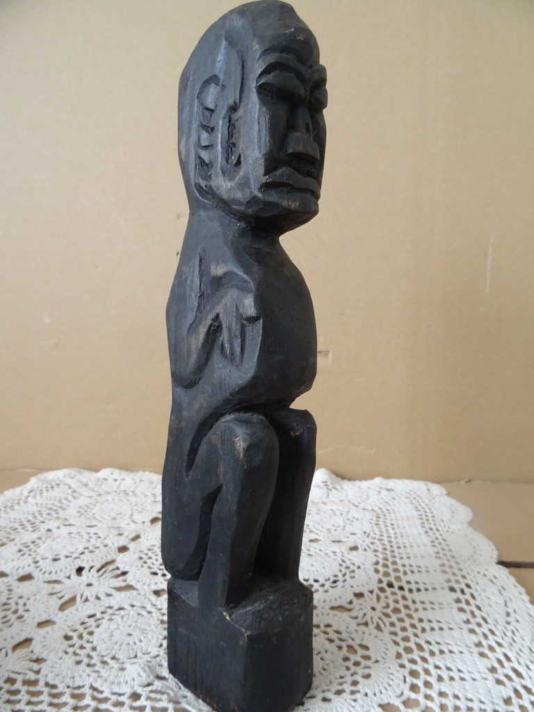 Inheems houten beeld 14cm vervaardigd rond 1960 of later. Afgebeeld is een zittende mannelijke figuur met een dikke buik (vruchtbaarheidsbeeld?). Het mysterieuze beeld is in goede gebruikte staat, hier en daar wat lakschade. Het wiebelt licht, het blijft wel staan.