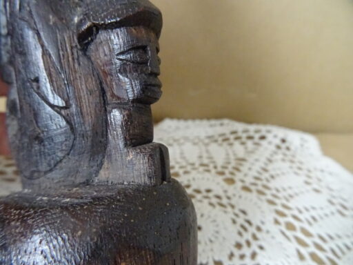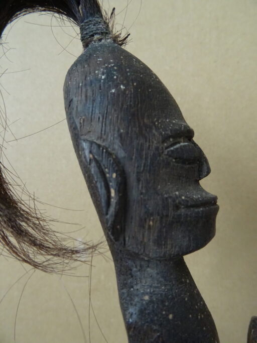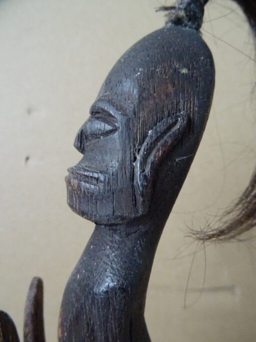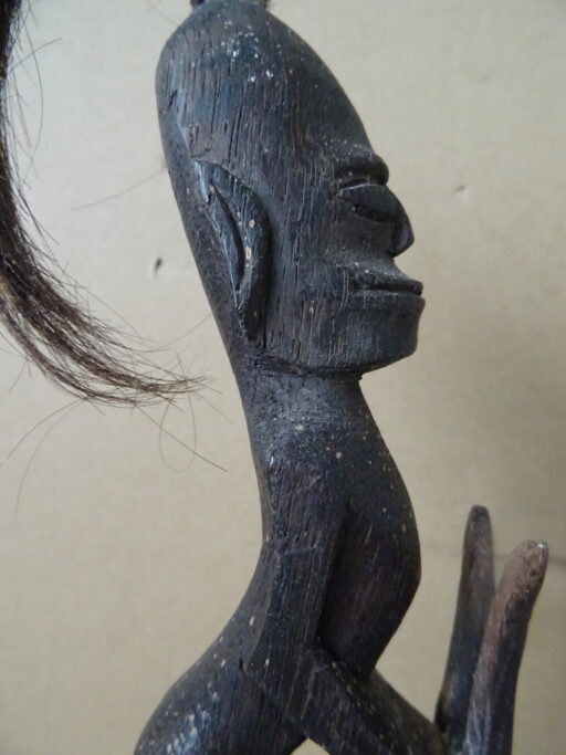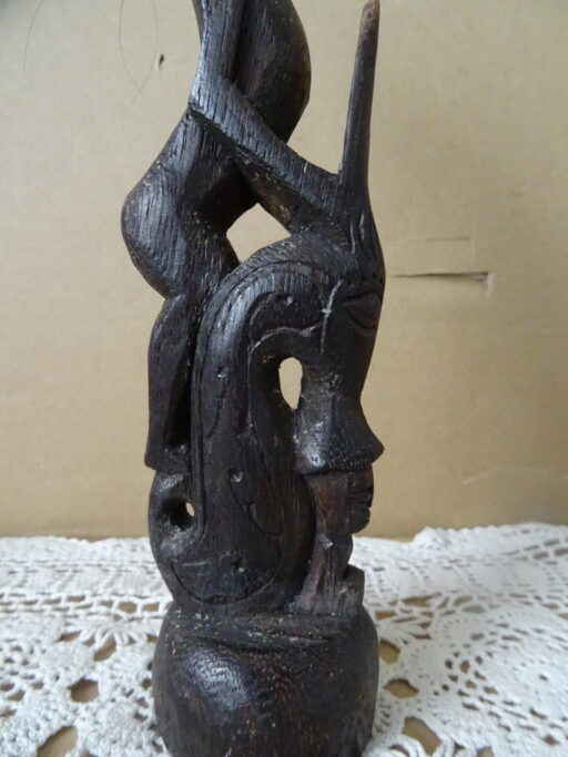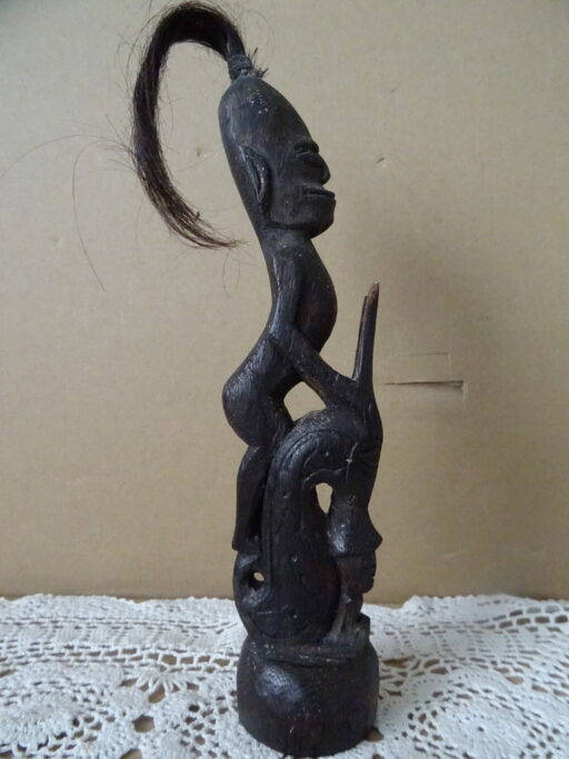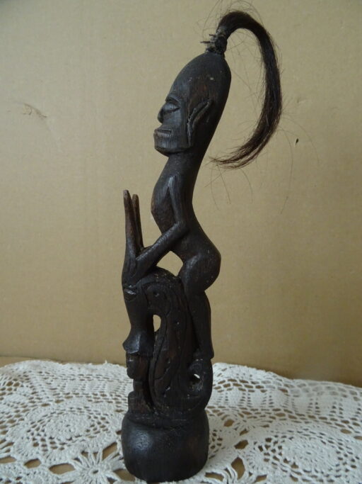 Inheems mythologisch houten beeld 24cm vervaardigd rond 1950 of later. Afgebeeld is een mannelijke figuur met lang haar staand op een mythologisch dier. Het dier lijkt op een enorm zeepaard maar heeft hoorns als een bok of antilope. De snuit van het dier rust dan weer op het hoofd van een klein mannetje dat onderaan zit. Het zal een voorouderbeeld of iets dergelijks zijn. Ik heb een tijdje gespeurd maar kan geen vergelijkbaar item vinden om met zekerheid te kunnen zeggen van welke stam het is, het lijkt Afrikaans. Tips zijn welkom. In ieder geval een zeer apart beeld, u vindt het alleen bij ons. Hoogte exclusief haar circa 22 cm. In een prachtige gebruikte, licht verweerde staat en puntgaaf, zie foto’s.