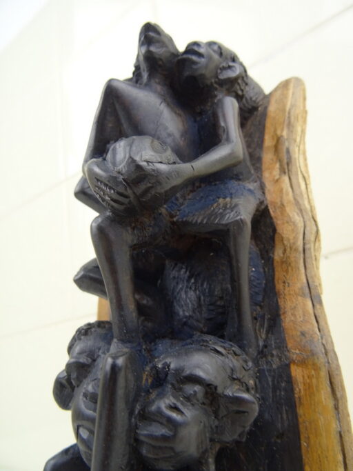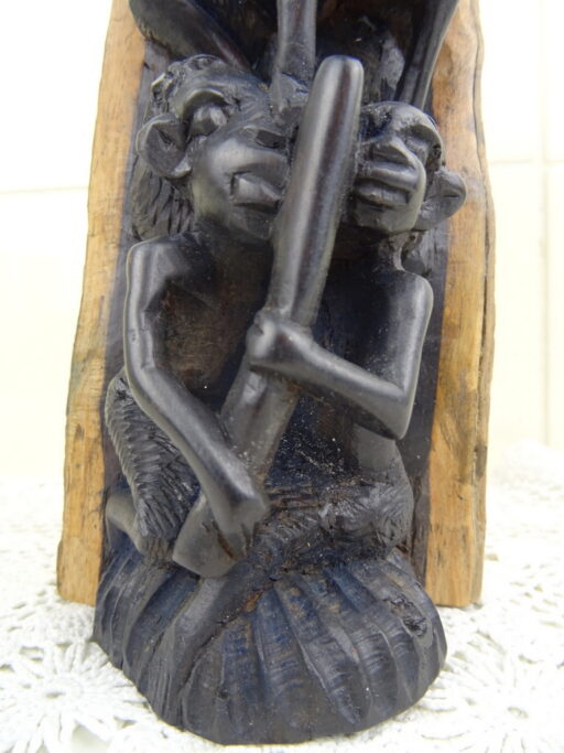 Markant Afrikaans hardhouten beeld dat waarschijnlijk werd vervaardigd in de eerste helft van de vorige eeuw. Het opvallende beeld werd gesneden uit een stuk boomstam, de (zeer droge) schors zit er nog aan! Afgebeeld zijn vijf mannen die met een in zittende en knielende posities, die in de weer zijn met een bal en een soort paal. De twee mannen rechtsboven lijken met elkaar vergroeid te zijn. Het beeld is in goede staat, het is mogelijk gerestaureerd, zie de pols op foto 5.