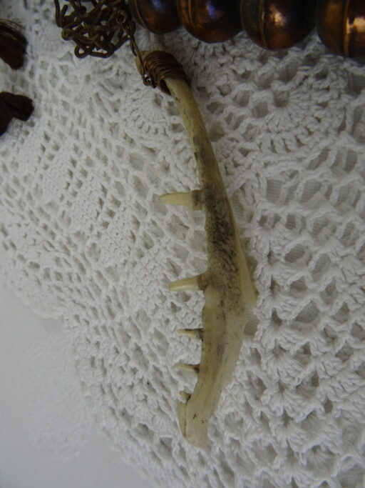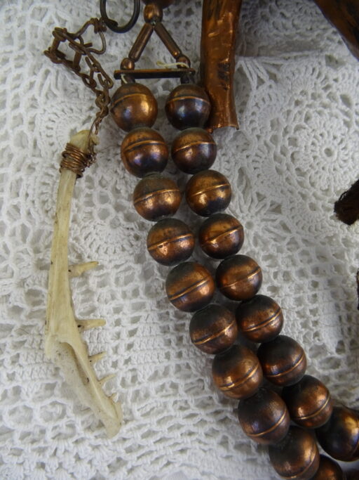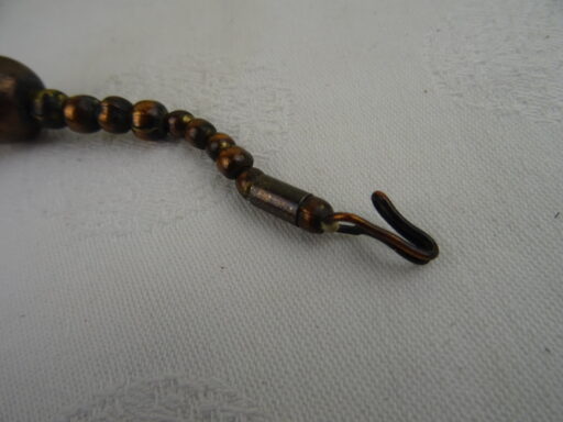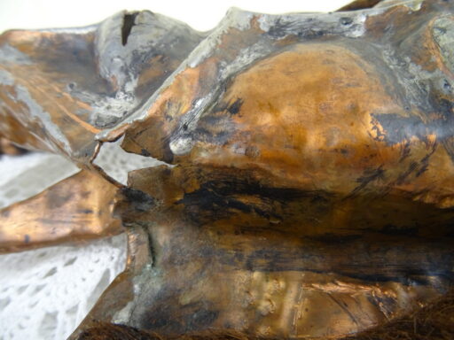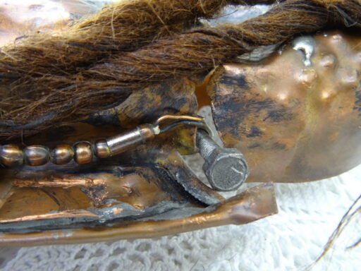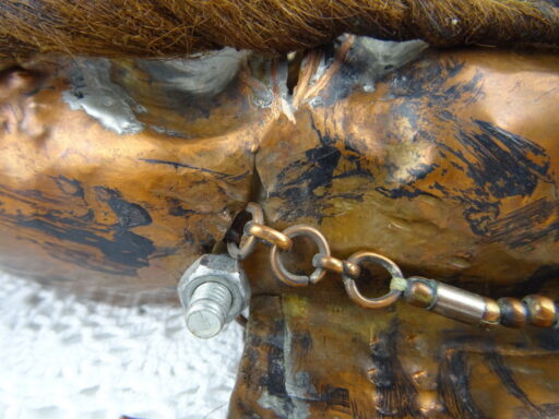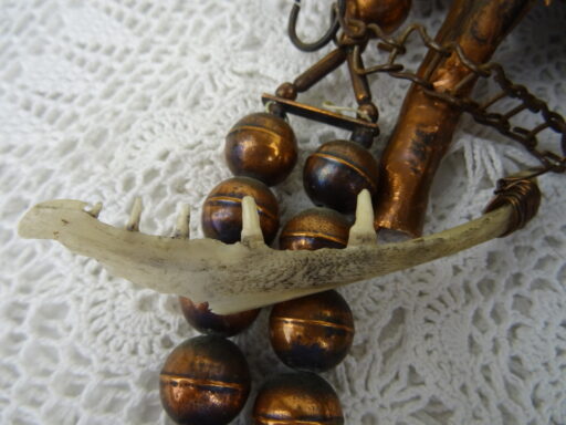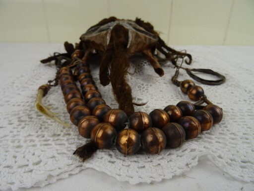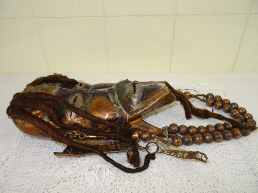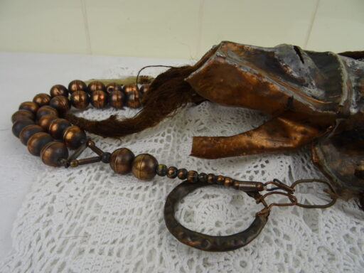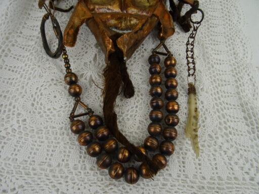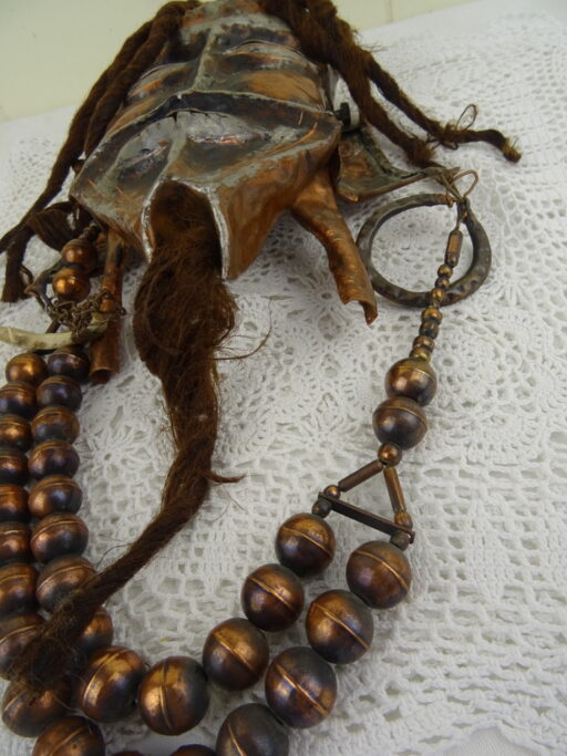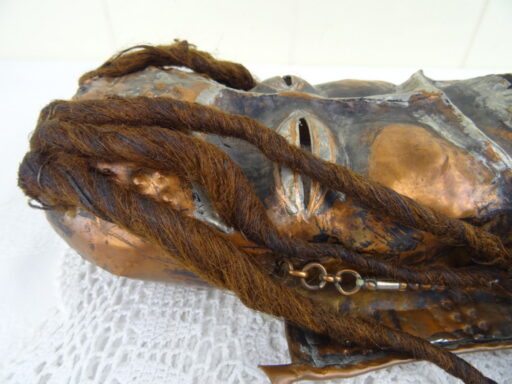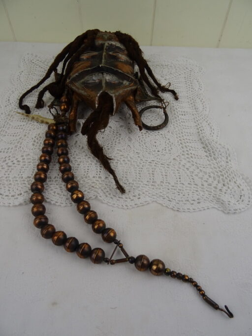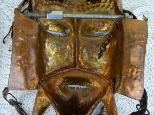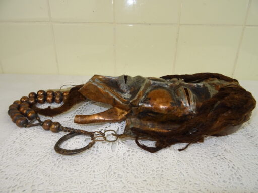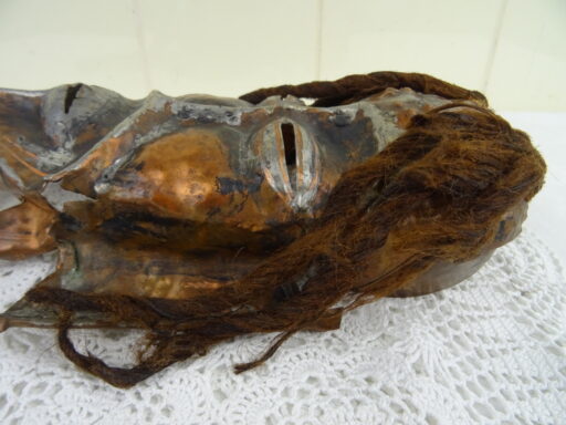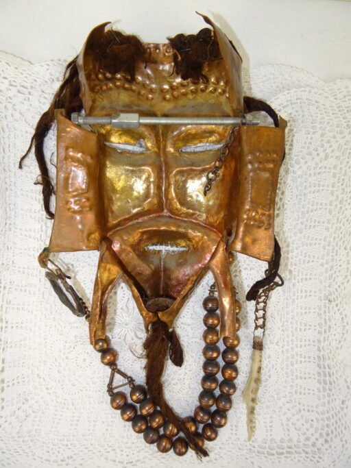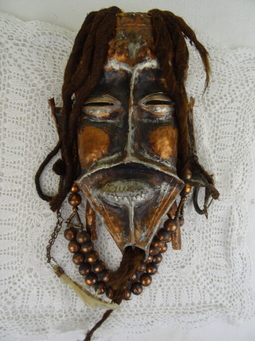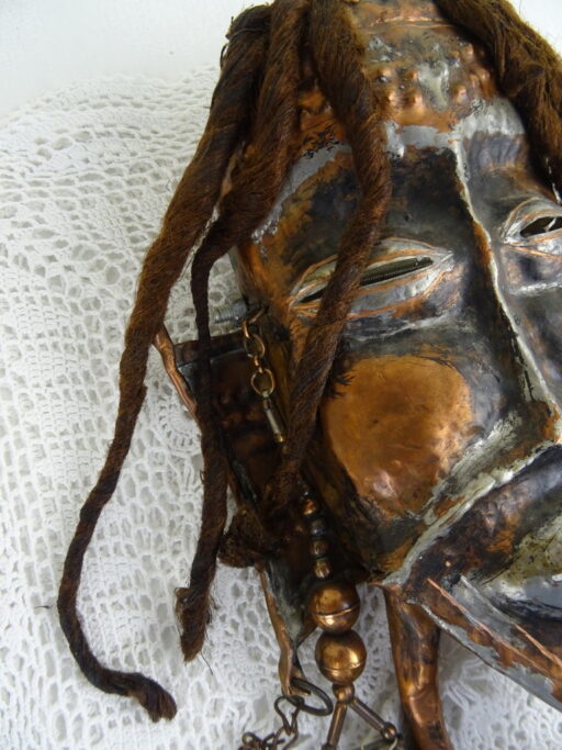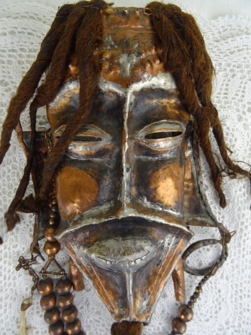 Afrikaans koperen masker vervaardigd in de tweede helft van de vorige eeuw. Het imponerende masker heeft een zeer sterke expressie. De dichtgeknepen ogen en mond geven het een haast angstaanjagend uiterlijk. Voor de haren en de baard zijn echte haren gebruikt. Het masker is verrijkt met een grote koperen ketting en er hangt ook een stuk kaak van een beest (kaaiman?) aan. Dit is door de maker eraan bevestigd om onheil en boze geesten af te wenden. Het object is in goede gebruikte staat, zie foto’s.