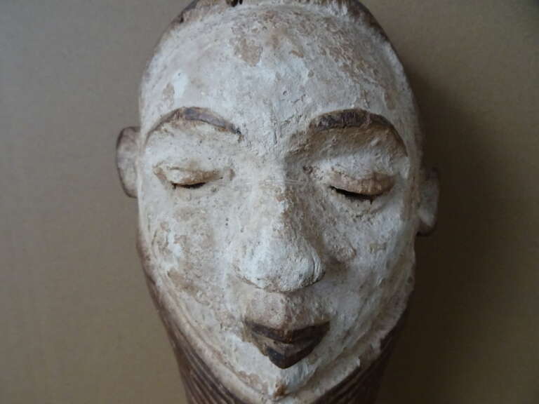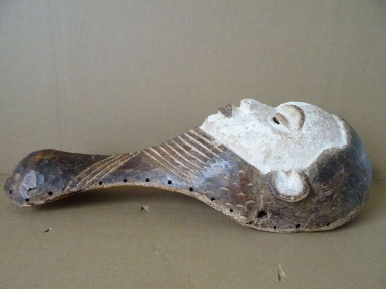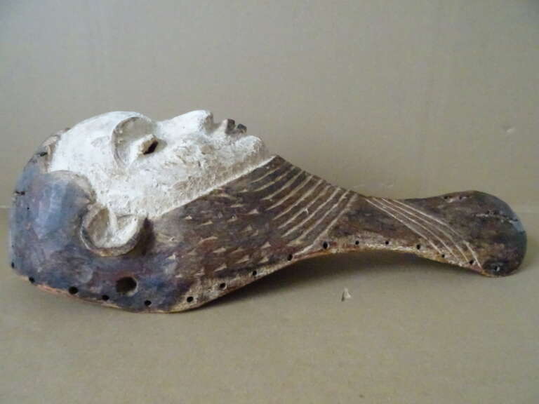Pende masker D.R. Congo vervaardigd rond 1960 of later. Een schitterend houten masker van ruim 42 cm, waarschijnlijk gemaakt door het Pende volk in D.R.C. (Congo). Gekleurd met natuurlijke pigmenten. In een prachtige gebruikte staat, hier en daar is het hout slechts wat gaan werken. Afkomstig uit een collectie exclusieve Afrikaanse maskers. Een prachtig masker / dansmasker dat je niet elke dag meer tegenkomt.