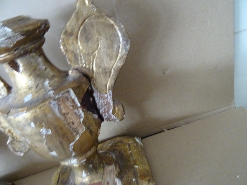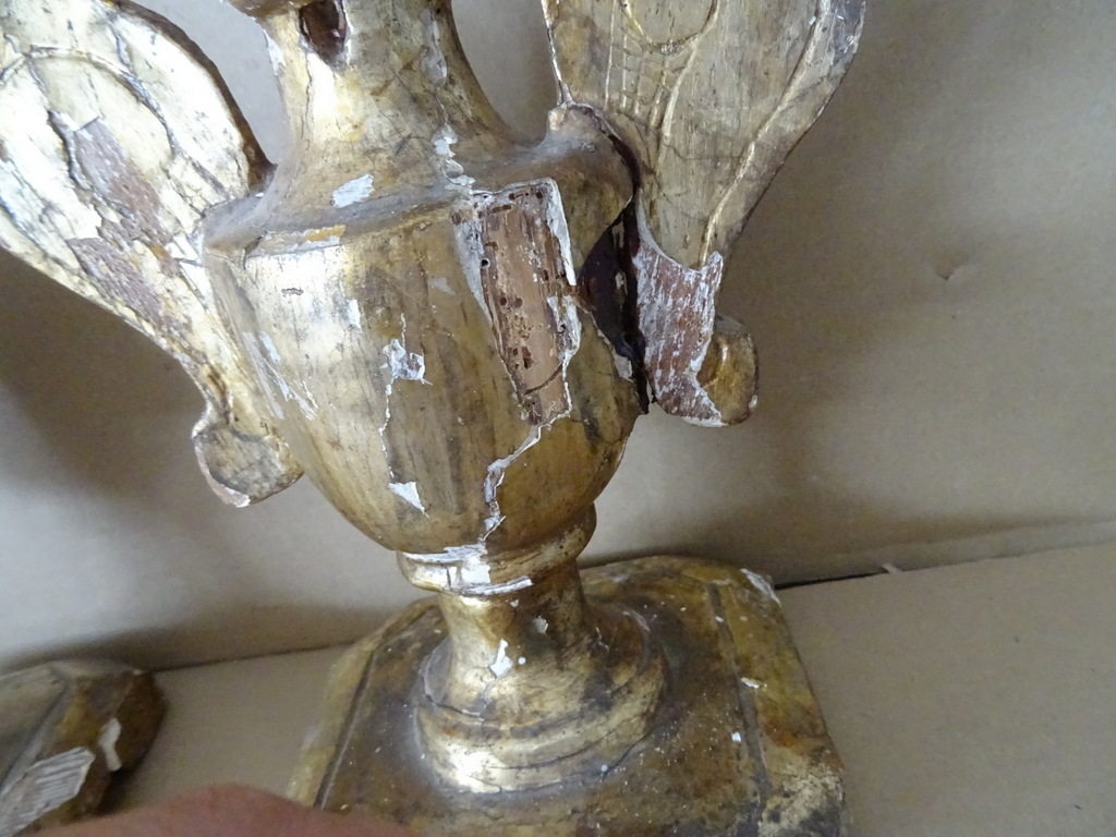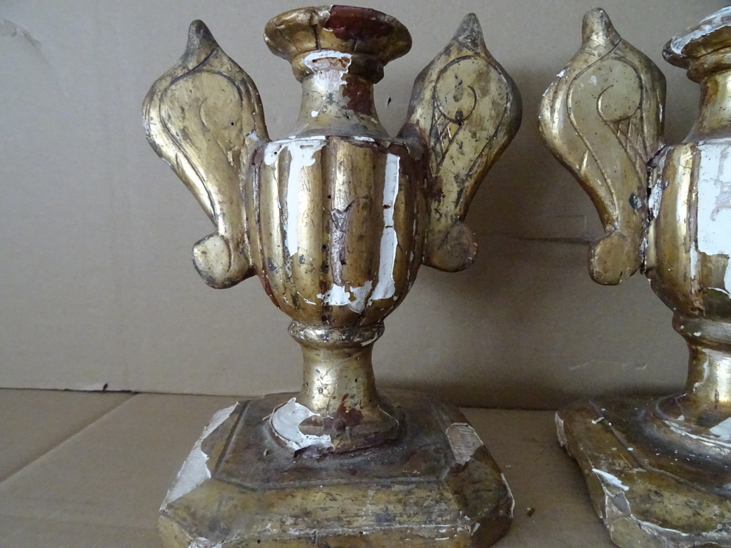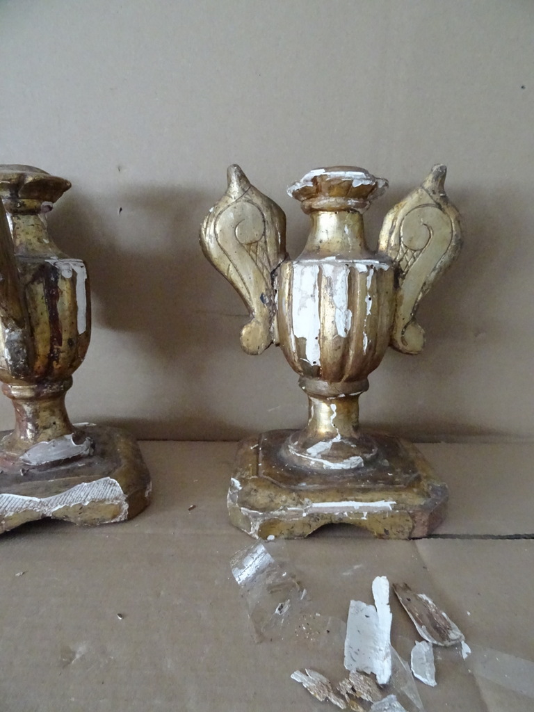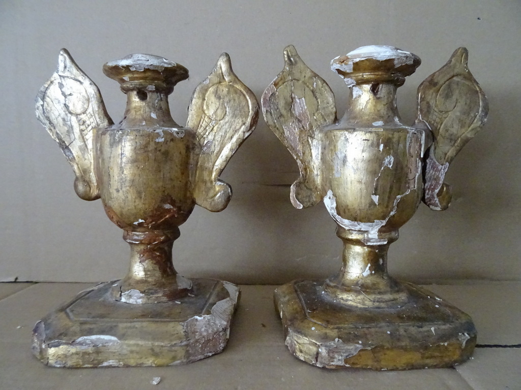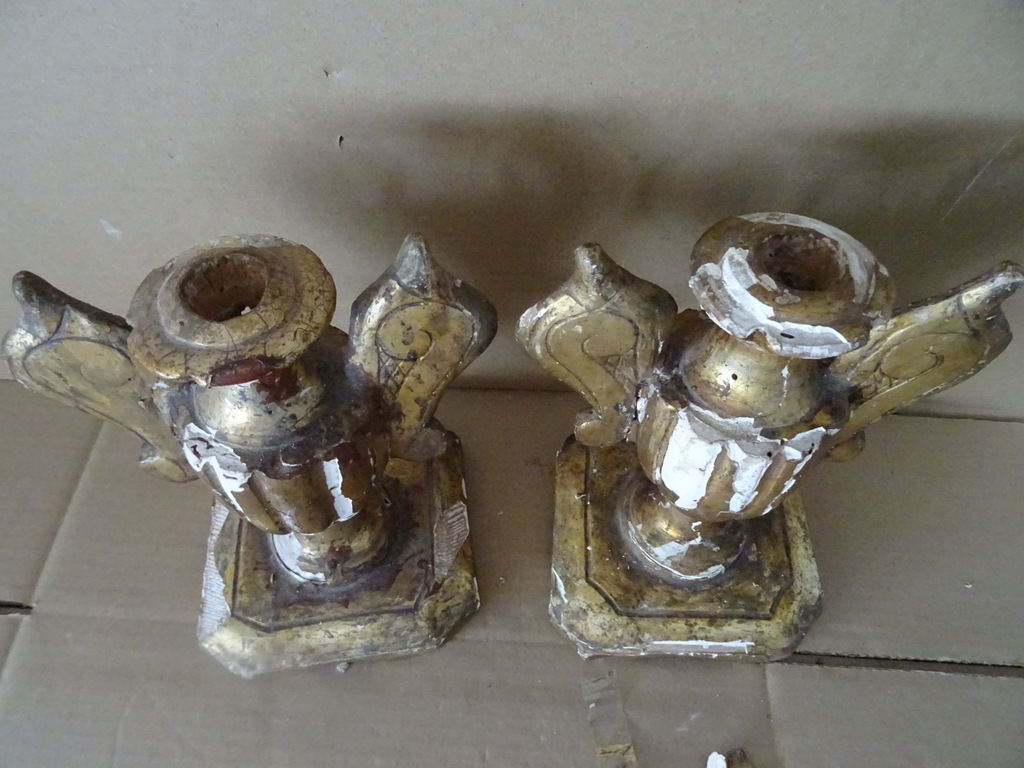 18e-eeuwse vergulde houten sierkandelaars of sierornamenten vervaardigd rond 1750. Aangezien er geen kaarsvet te bespeuren is zullen het sierkandelaars zijn of sierornamenten met vleugels. De stukken zijn afkomstig uit een collectie. Ze zijn in redelijke gebruikte staat. Hier en daar is het hout gaan werken en in de loop der eeuwen. Er is tamelijk wat lakschade en er vallen nog steeds stukjes af. Toen ik de plakband verwijderde van de rechter kandelaar kwam er nog wat lak mee. De rechter vleugel is nog nèt niet helemaal los, zie foto’s. Kortom deze fraaie sierkandelaars verdienen het om in ere hersteld te worden. Afmetingen per stuk circa 18,5 bij 14,5 bij 23 cm. Gewichten; circa 600 en 628 gram.