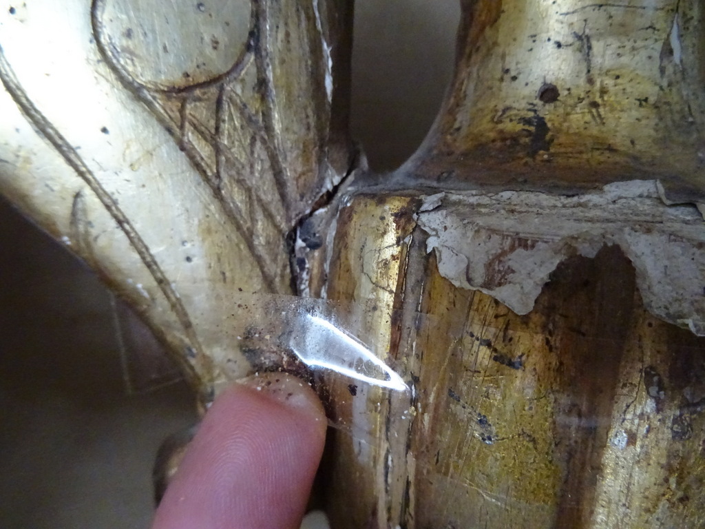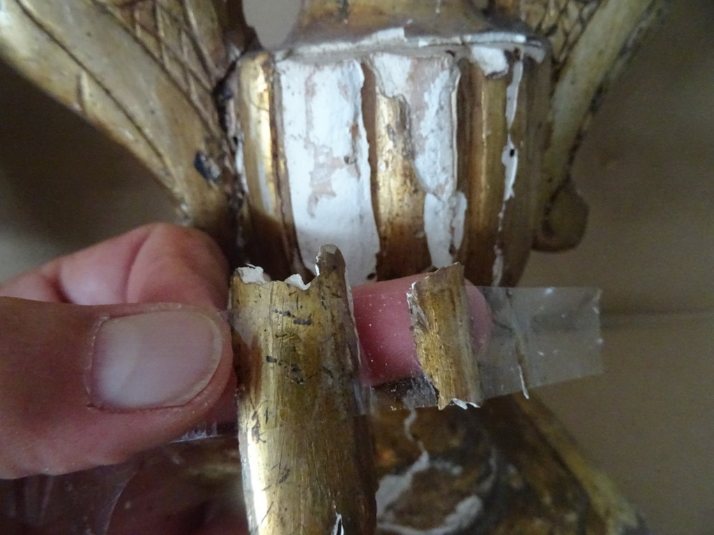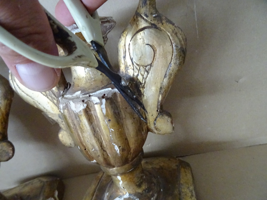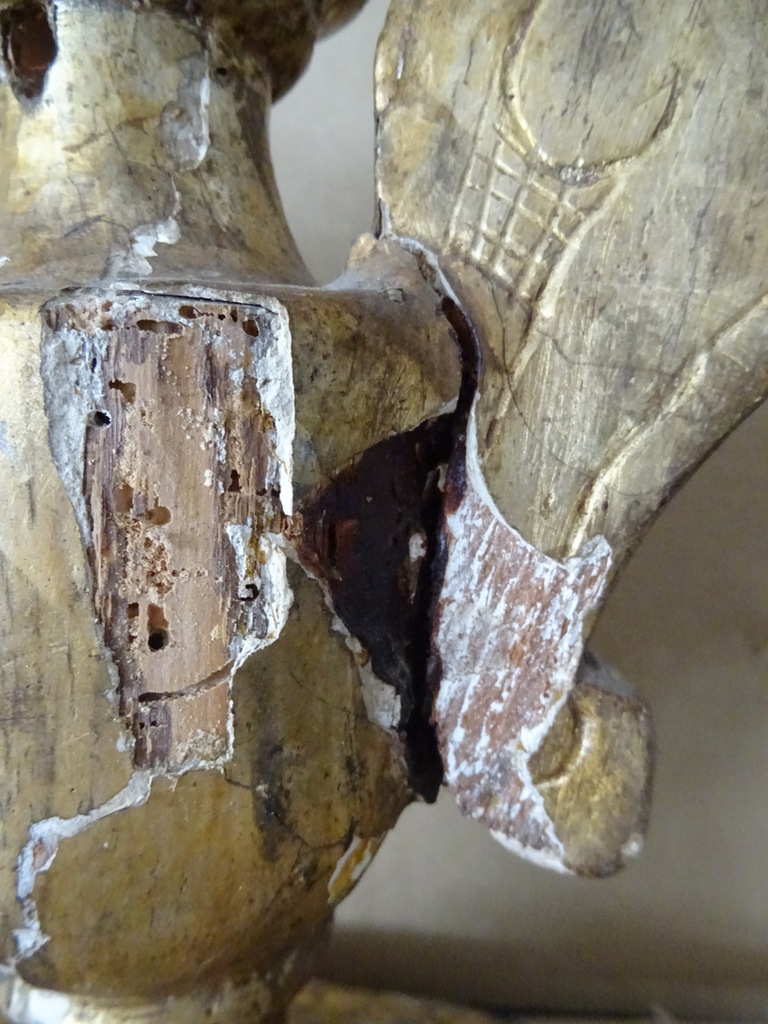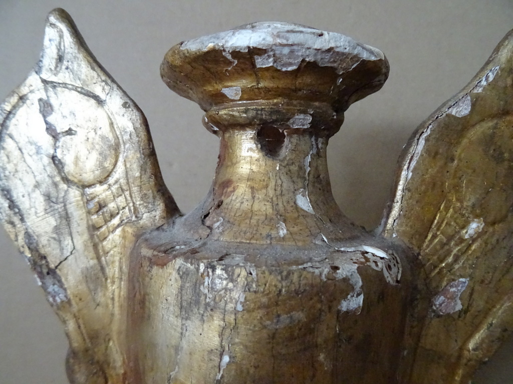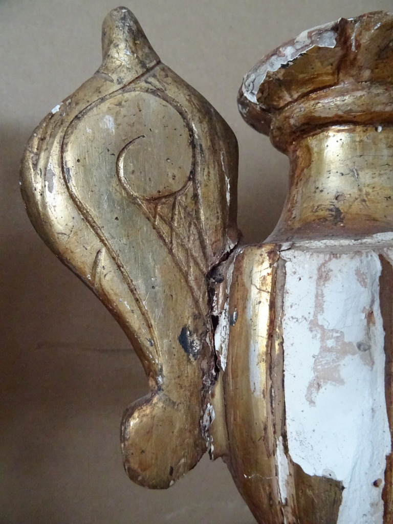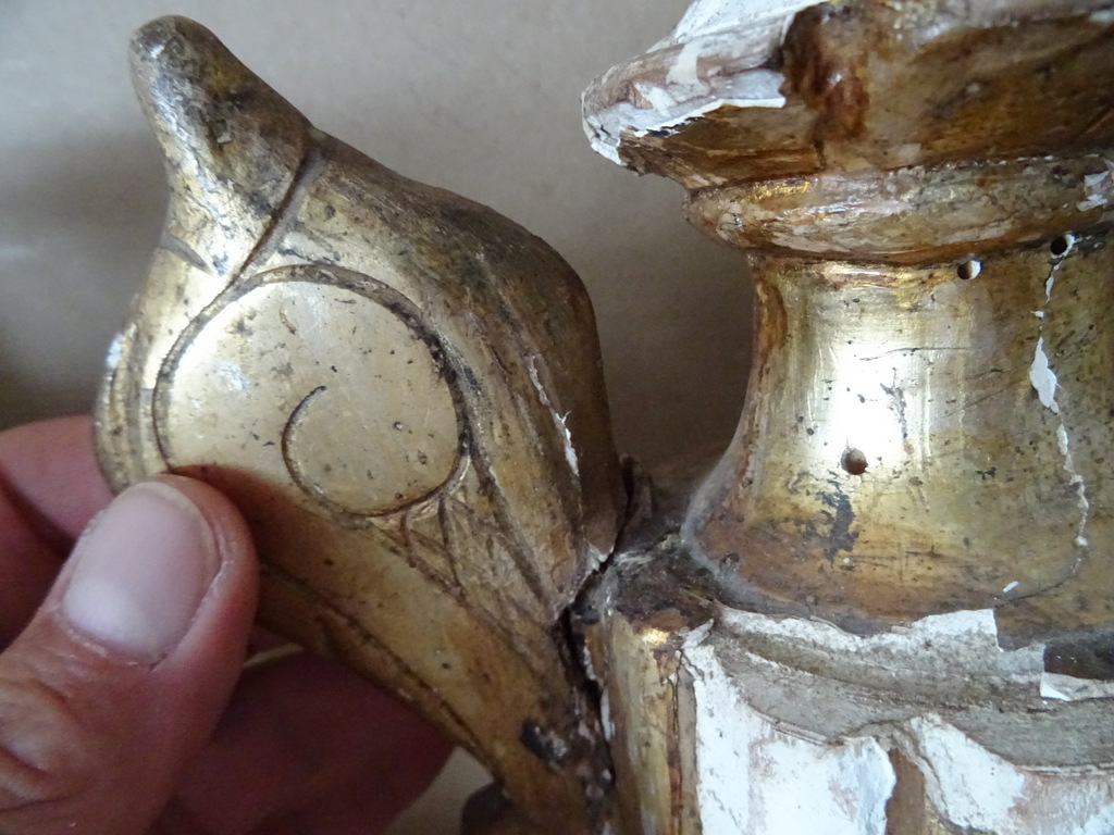 18e-eeuwse vergulde houten sierkandelaars of sierornamenten vervaardigd rond 1750. Aangezien er geen kaarsvet te bespeuren is zullen het sierkandelaars zijn of sierornamenten met vleugels. De stukken zijn afkomstig uit een collectie. Ze zijn in redelijke gebruikte staat. Hier en daar is het hout gaan werken en in de loop der eeuwen. Er is tamelijk wat lakschade en er vallen nog steeds stukjes af. Toen ik de plakband verwijderde van de rechter kandelaar kwam er nog wat lak mee. De rechter vleugel is nog nèt niet helemaal los, zie foto’s. Kortom deze fraaie sierkandelaars verdienen het om in ere hersteld te worden. Afmetingen per stuk circa 18,5 bij 14,5 bij 23 cm. Gewichten; circa 600 en 628 gram.