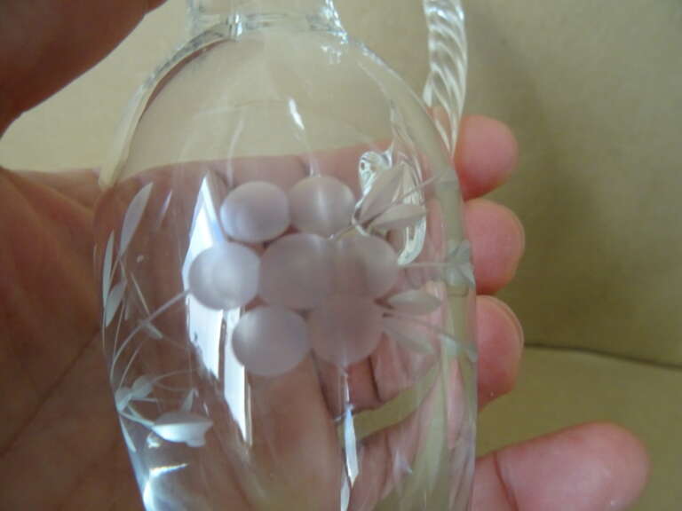 Antiek glazen drankkannetje 18cm vervaardigd rond 1920 of wat later. Het elegante kannetje voor drank is prachtig verrijkt met een sierlijk handvat en voorzien van florale decoratie (gegraveerd). Het is in goede staat, puntgaaf en schoon.
