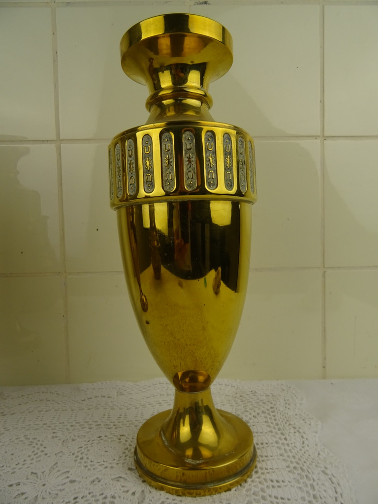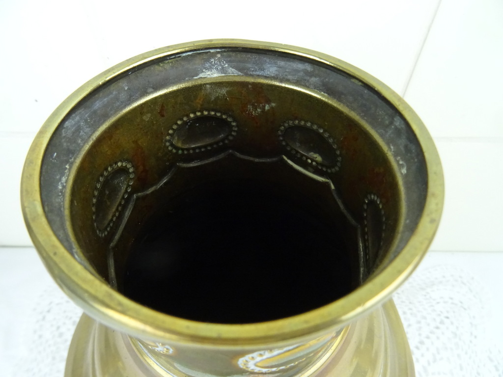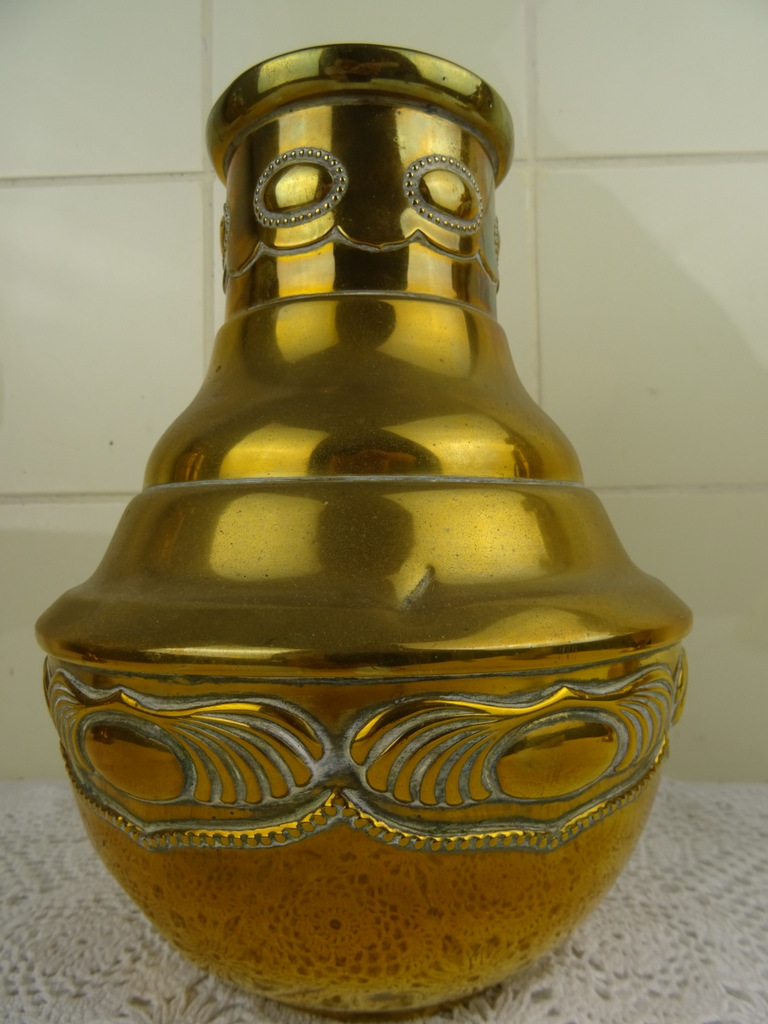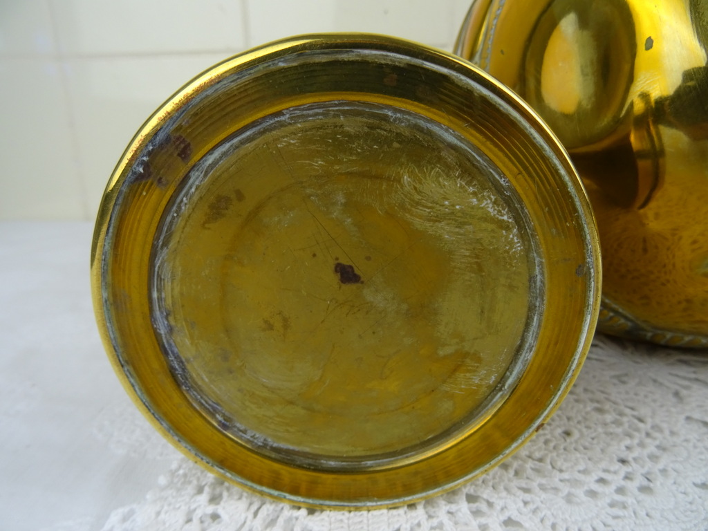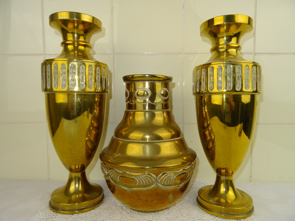 Antiek koperen kaststel vervaardigd in de negentiende of twintigste eeuw. De drie fraaie vazen zijn in goede gebruikte staat, Een van de twee identieke vazen is flink gedeukt aan de voet en staat hierdoor wat scheef, zie foto’s. Als de vaas op de juiste manier wordt neergezet valt dit haast niet op. De middelste vaas heeft ook een aantal deuken. De maker en herkomst van de vazen zijn onbekend (Daalderop?). Of ze bijeen horen weet ik niet zeker maar ze staan in ieder geval mooi samen! De afmetingen van de twee grote vazen zijn 10.5 bij 10.5 bij 32.5 cm. Deze vazen hebben iets (waarschijnlijk zand) in de voet zitten om te zorgen dat ze niet te snel omvallen. Ze wegen 532 en 550 gram. De afmetingen van de andere vaas zijn 15.5 bij 15.5 bij 22.7 cm. Ze weegt 439 gram.