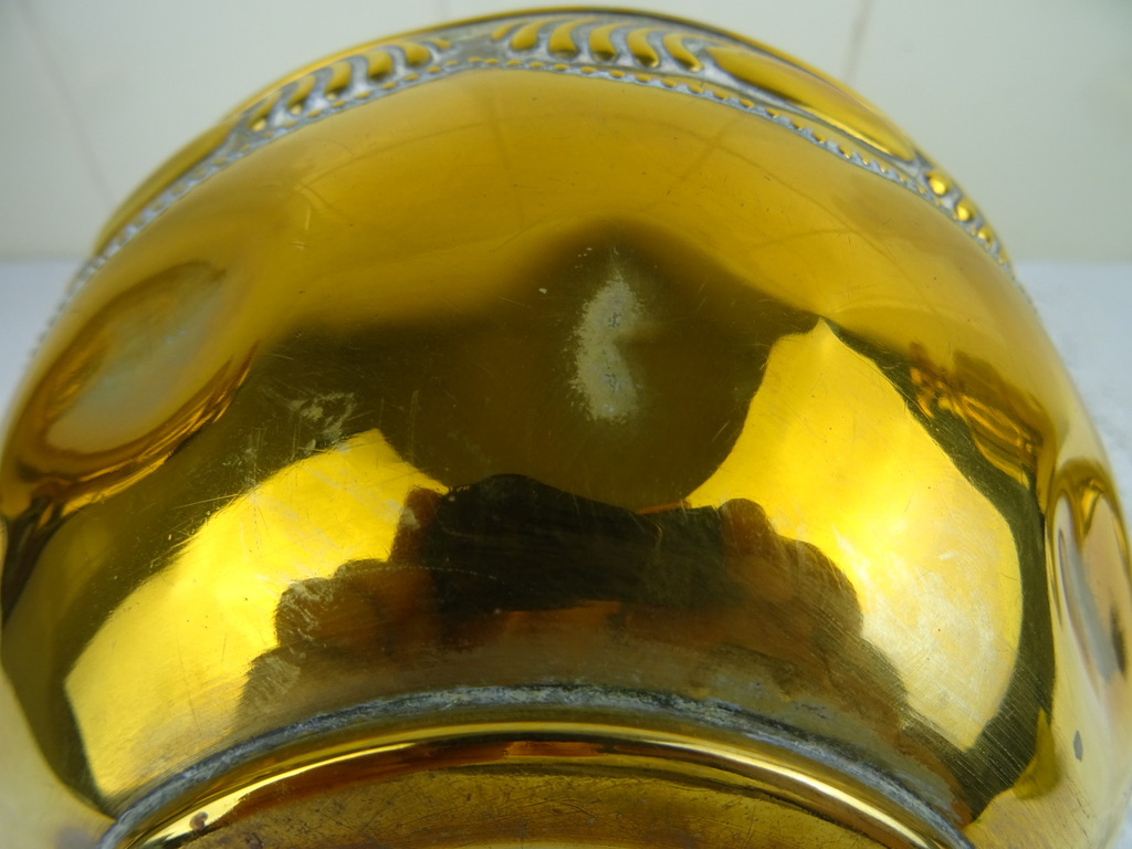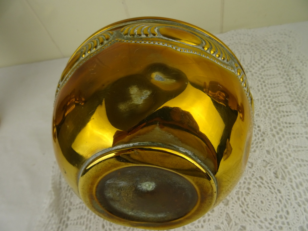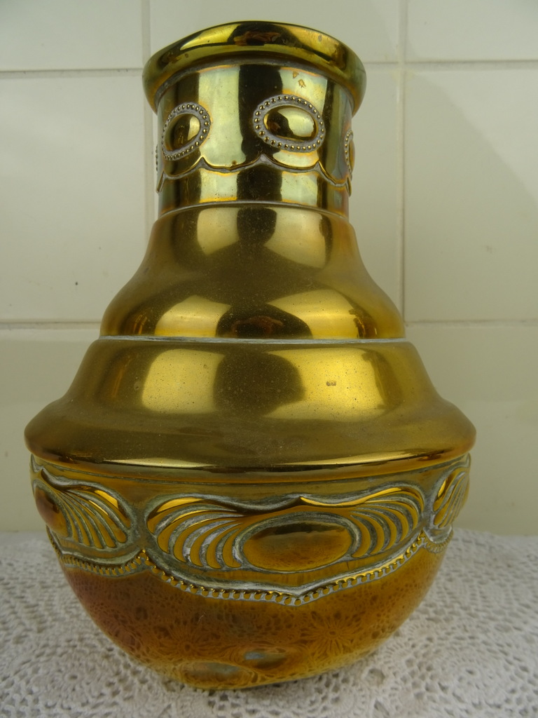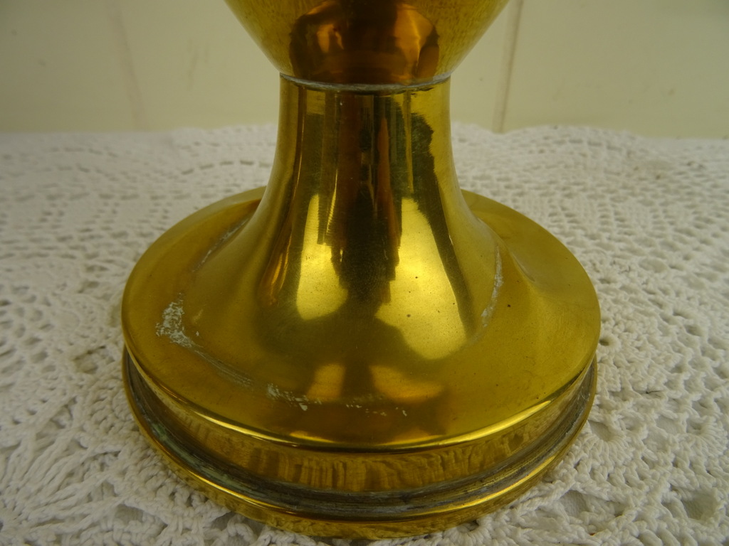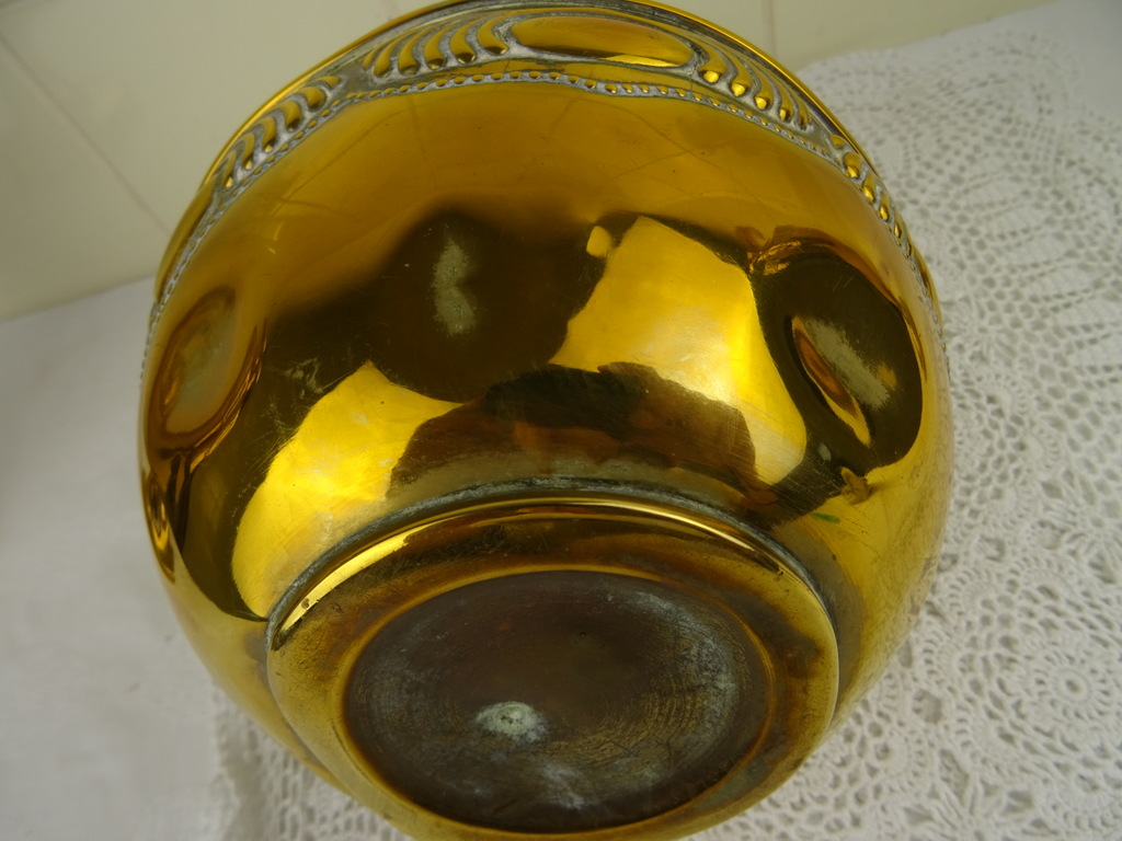 Antiek koperen kaststel vervaardigd in de negentiende of twintigste eeuw. De drie fraaie vazen zijn in goede gebruikte staat, Een van de twee identieke vazen is flink gedeukt aan de voet en staat hierdoor wat scheef, zie foto’s. Als de vaas op de juiste manier wordt neergezet valt dit haast niet op. De middelste vaas heeft ook een aantal deuken. De maker en herkomst van de vazen zijn onbekend (Daalderop?). Of ze bijeen horen weet ik niet zeker maar ze staan in ieder geval mooi samen! De afmetingen van de twee grote vazen zijn 10.5 bij 10.5 bij 32.5 cm. Deze vazen hebben iets (waarschijnlijk zand) in de voet zitten om te zorgen dat ze niet te snel omvallen. Ze wegen 532 en 550 gram. De afmetingen van de andere vaas zijn 15.5 bij 15.5 bij 22.7 cm. Ze weegt 439 gram.