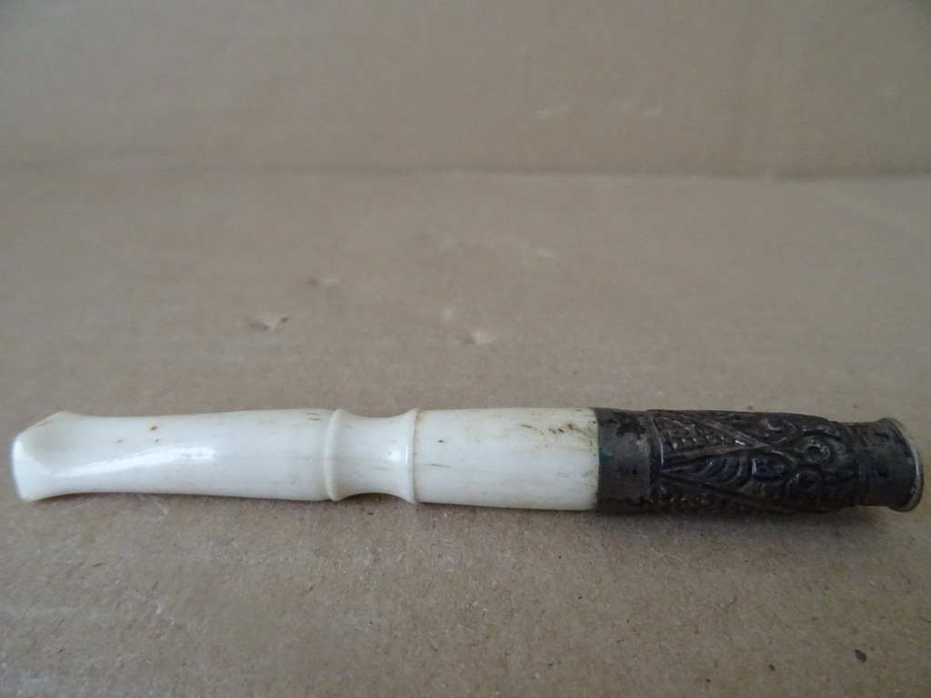 Antiek sigarettenpijpje gemaakt van been 9cm vervaardigd rond 1900 of iets eerder. In een schitterende gebruikte staat. Het (zilveren?) opzetstukje heeft een deukje, zie foto’s.