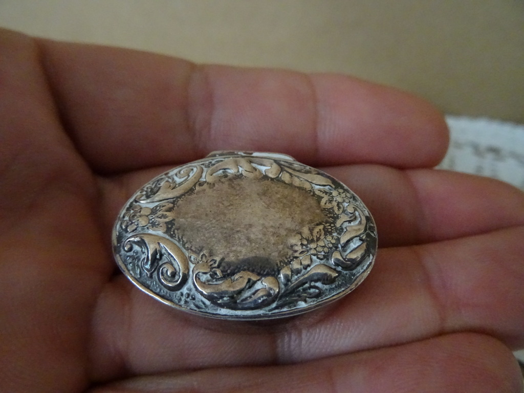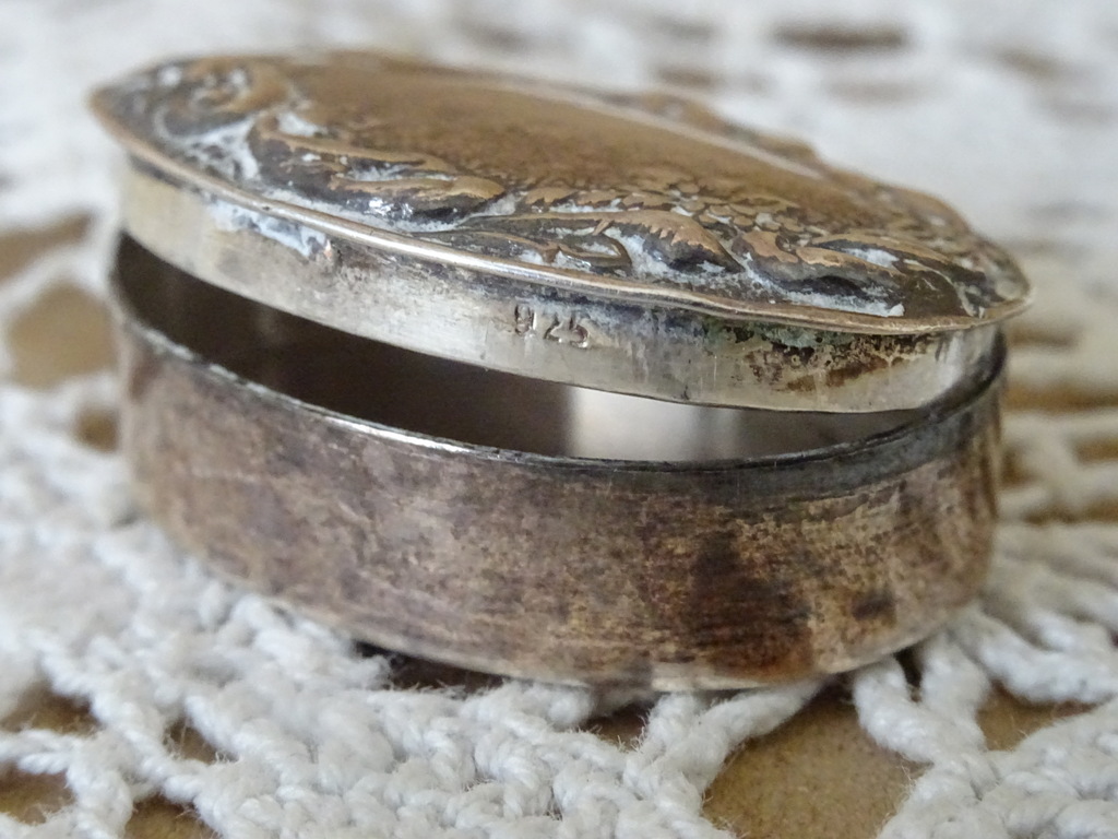 Antiek zilveren pillendoosje of snuifdoosje 925 gemerkt vervaardigd rond 1920 of later. In een schitterende gebruikte staat, zie foto’s. Circa 3,5 bij 2,7 bij 1 cm.
