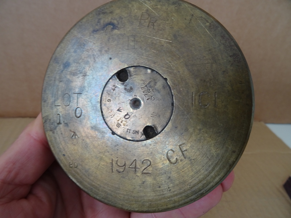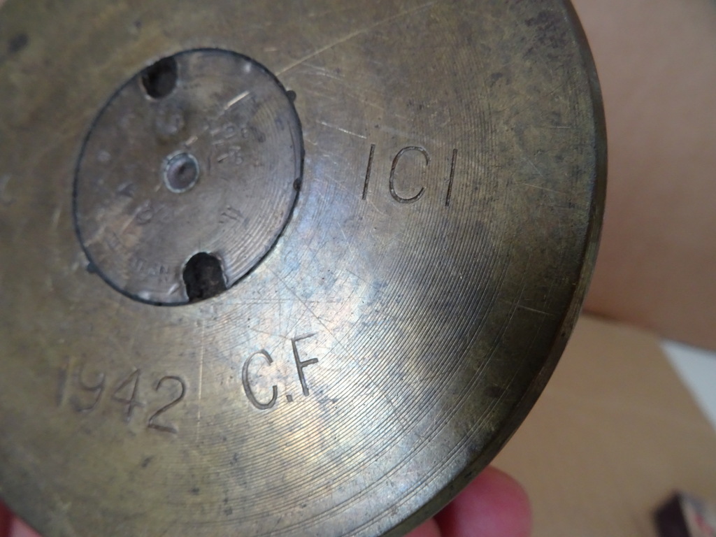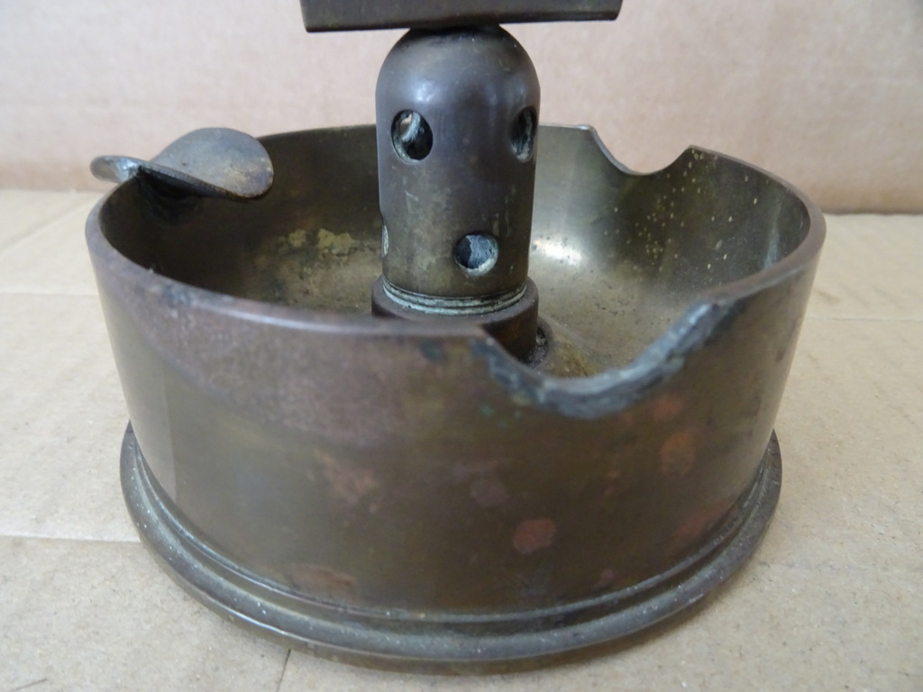 Antieke asbak granaathuls met luciferhouder vervaardigd rond 1945 of enkele jaren later. In een fraaie gebruikte staat, zie foto’s. Rook in stijl met deze imponerende asbak gemaakt van een granaathuls. Lijkt op brons.