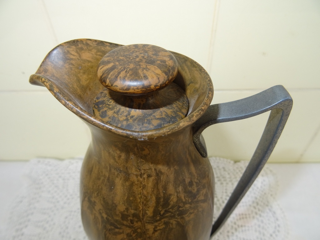 Antieke bakelieten thermoskan vervaardigd in 1926 in Engeland. Een beeldschone kan voor wie graag koffie of thee drinkt in stijl! De elegant vormgegeven Art deco kan is in goede staat, zelfs het glas binnenin is nog intact. De kan is verrijkt met een sierlijk metalen handvat. De kurk van de dop is wat uitgedroogd, hierdoor sluit de kan niet meer hermetisch. Dit is eenvoudig te verhelpen. Aan de onderzijde is de kan gemerkt Thermos 1926 Limited London No 24 JUG en 327838 (patentnummer).