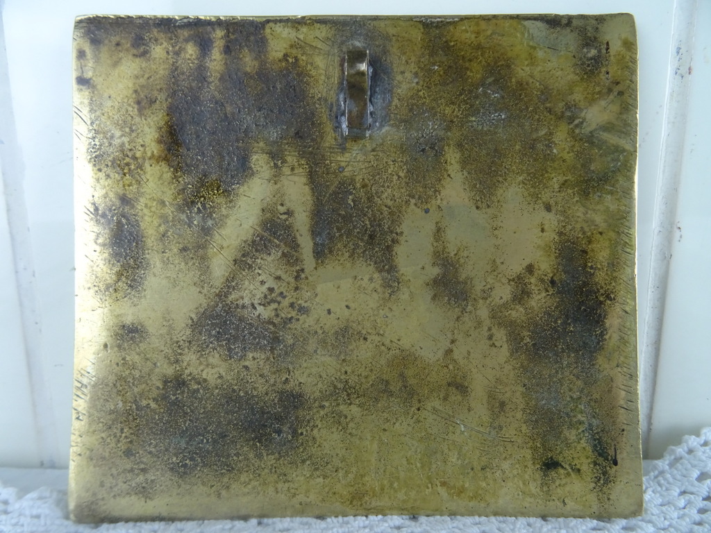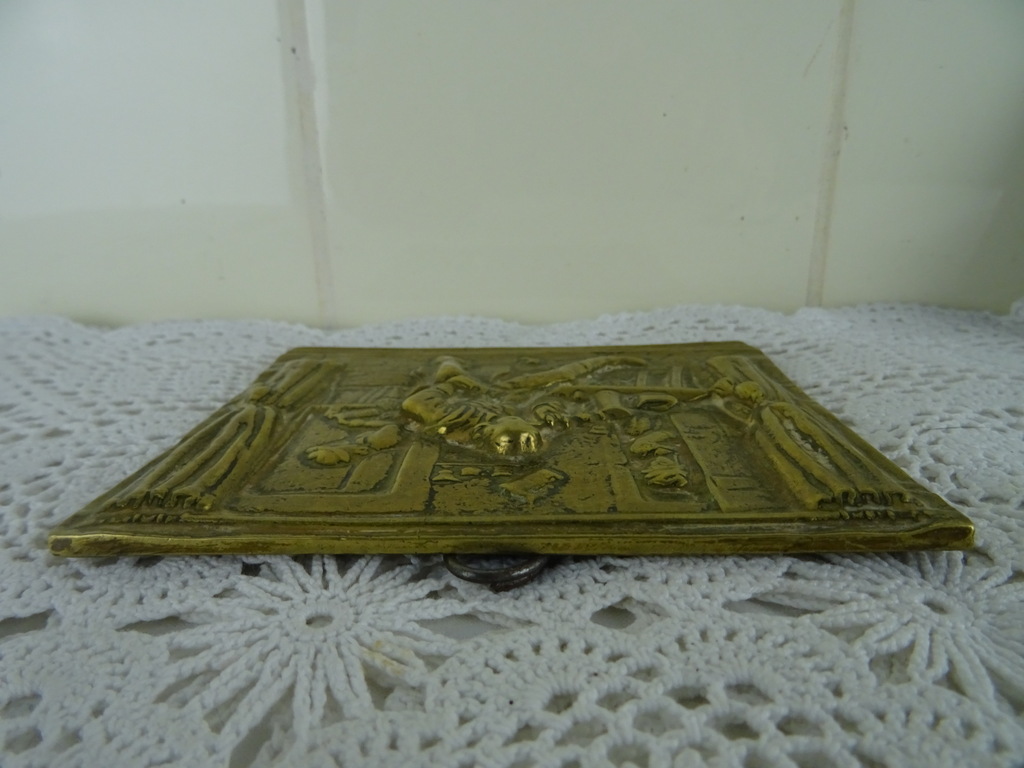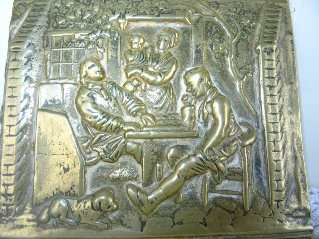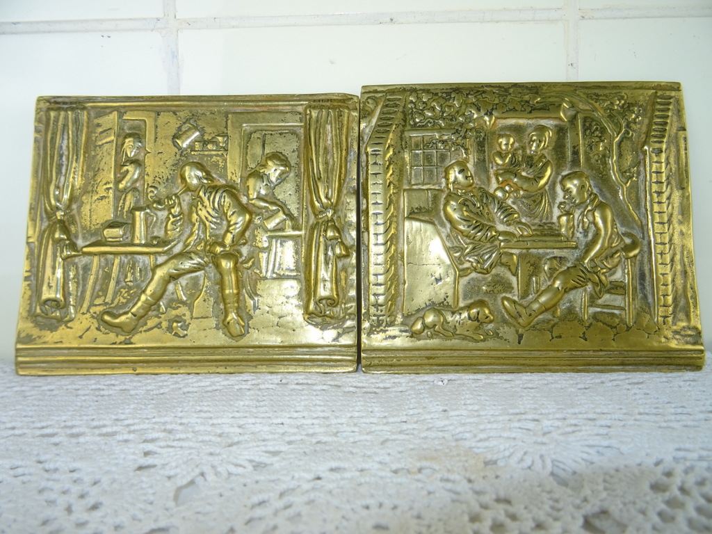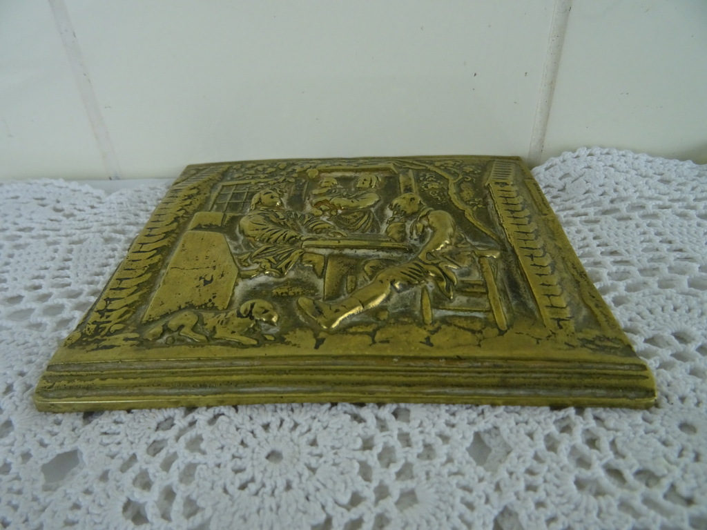 Antieke bronzen plaquettes vervaardigd in de negentiende eeuw of eerder. Op de fraaie plaquettes zijn oud-Hollandse voorstellingen weergegeven. Op plaquette 1 is een pijp rokende man te zien en op de achtergrond twee vrouwen. Afmetingen / 12.3 bij 10.5 bij 0.3 cm, 431 gram. Op plaquette 2 zijn twee mannen te zien die een spel spelen. Naast hen staat een vrouw met kind en op de grond ligt een hond. Op de achtergrond is een boom te zien dus het tafereel vindt buiten plaats. Afmetingen / 12.2 bij 10.8 bij 0.3 cm, 363 gram.