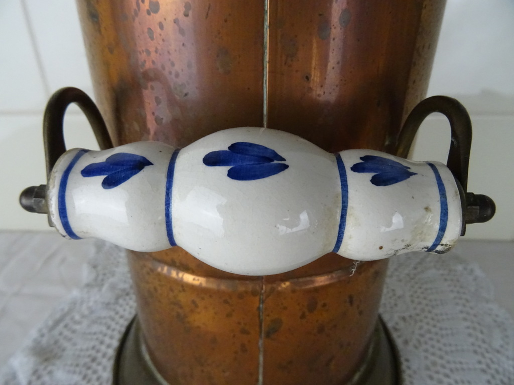 Antieke kolenkit met Delfts blauw handvat vervaardigd in de negentiende of twintigste eeuw. Met opschrift 5 kan (5 kannen kolen).De fraaie kolenkit heeft slechts enkele minuscule deukjes, je moet er echt naar zoeken. Ook mooi om te gebruiken als vaas met bijvoorbeeld wat zonnebloemen erin.