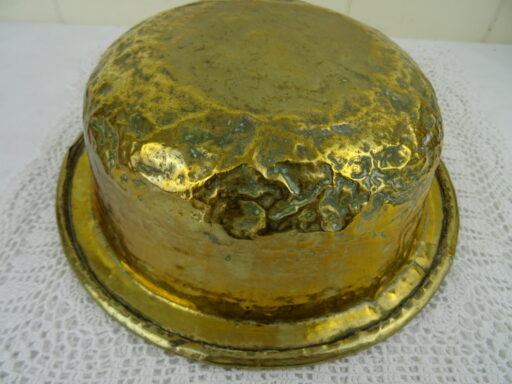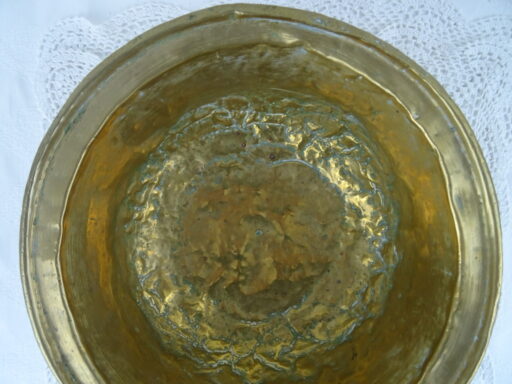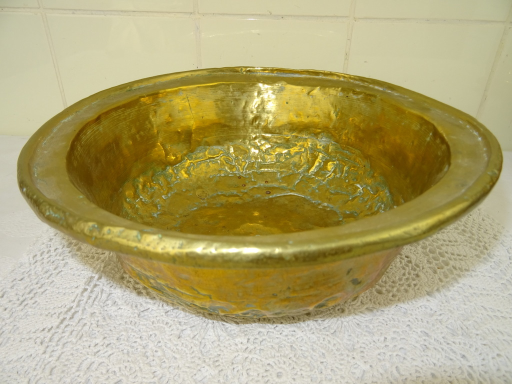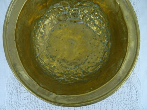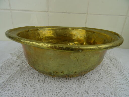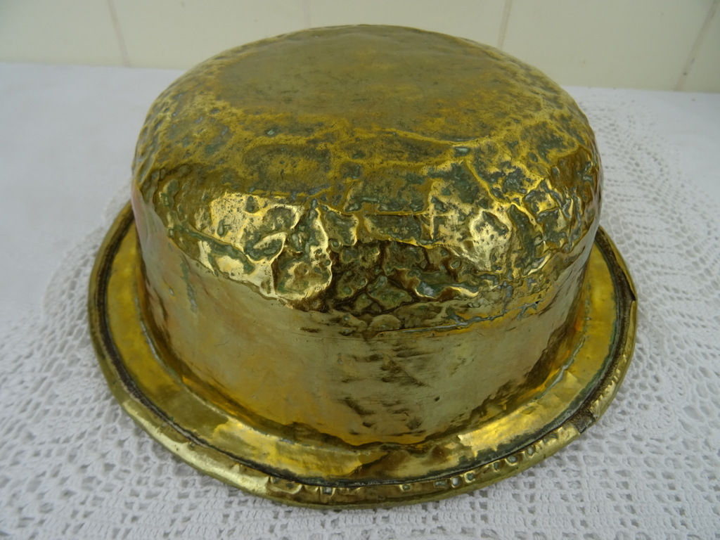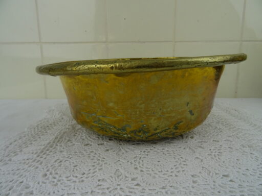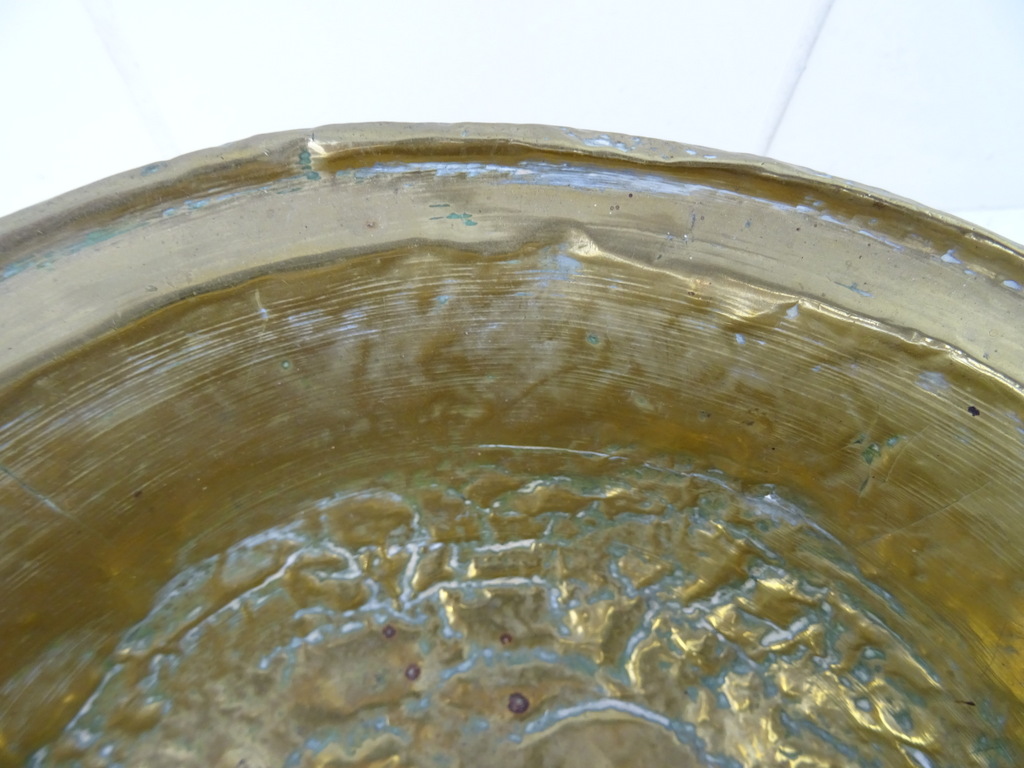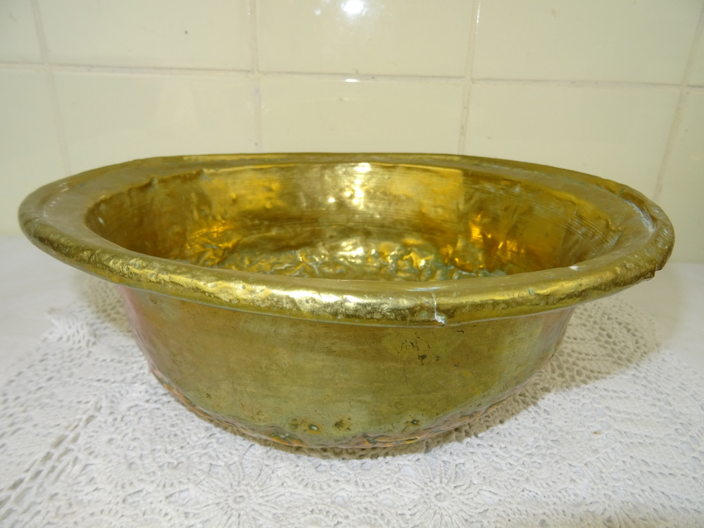 Antieke kom met koperbeslag vervaardigd in de negentiende of twintigste eeuw. De imponerende metalen kom of schaal is op fraaie wijze beslagen met koper. Het object kan worden gebruikt als fruitschaal of om snuisterijen in bewaren. De kom is in goede gebruikte staat, zie foto’s. Het is een fraai stukje huisvlijt.