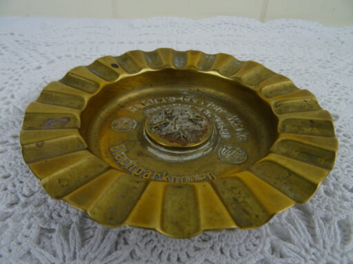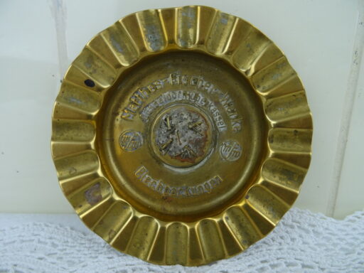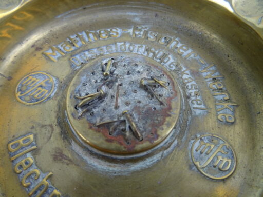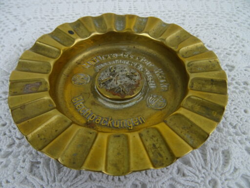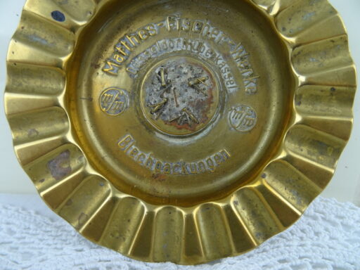 Antieke koperen asbak vervaardigd in de eerste helft van de vorige eeuw. In het midden van de asbak zijn koperen spijkertjes zichtbaar in verschillende maten, het is een waar kunstwerk! Hieromheen staat de tekst Matthes Fischerwerke Düsseldorf Oberkassel Blechpackungen. De asbak is in goede gebruikte staat, zie foto’s.