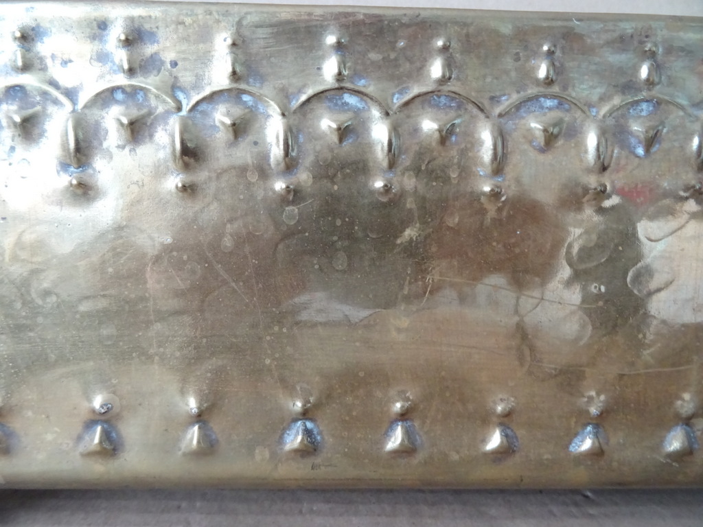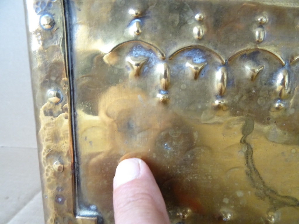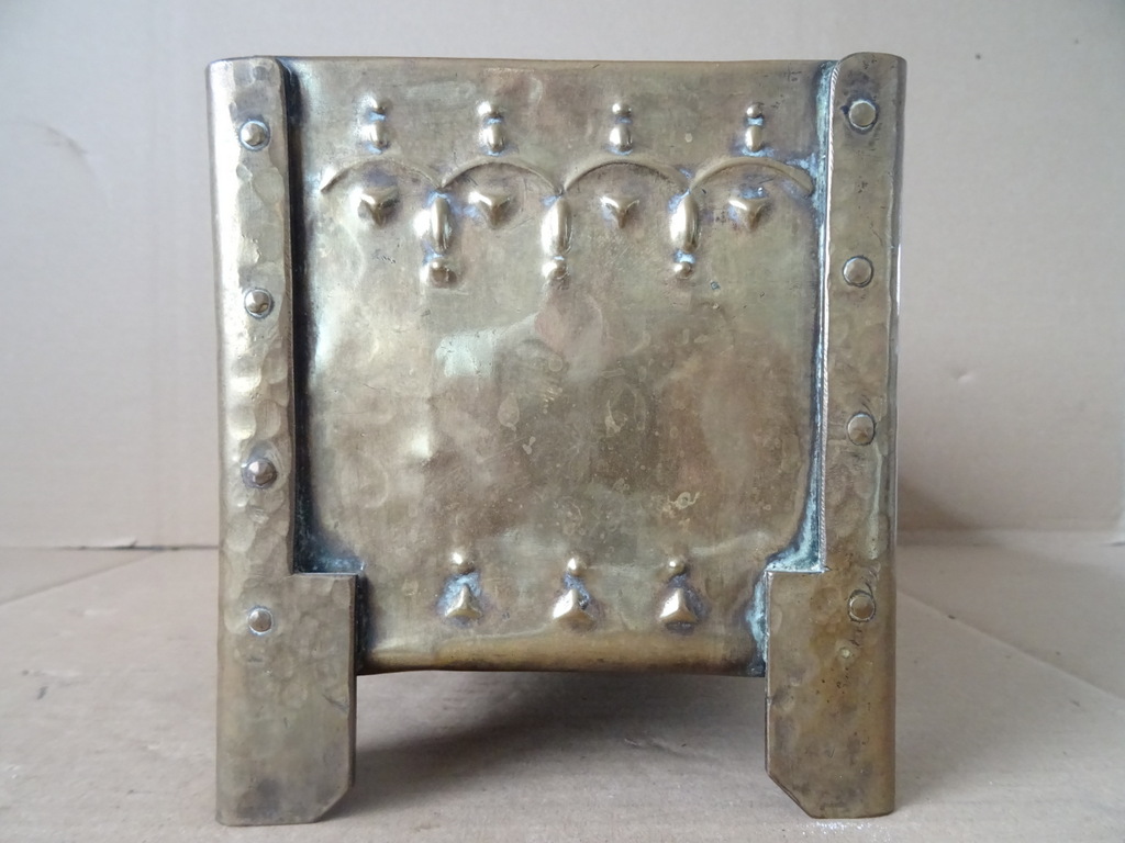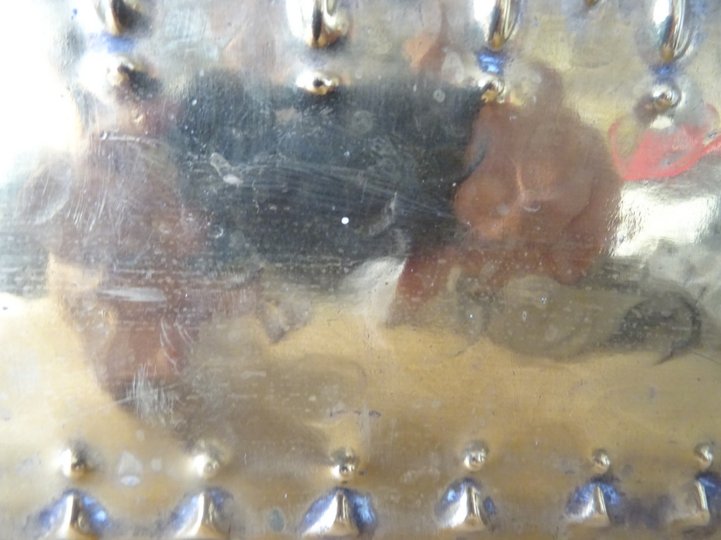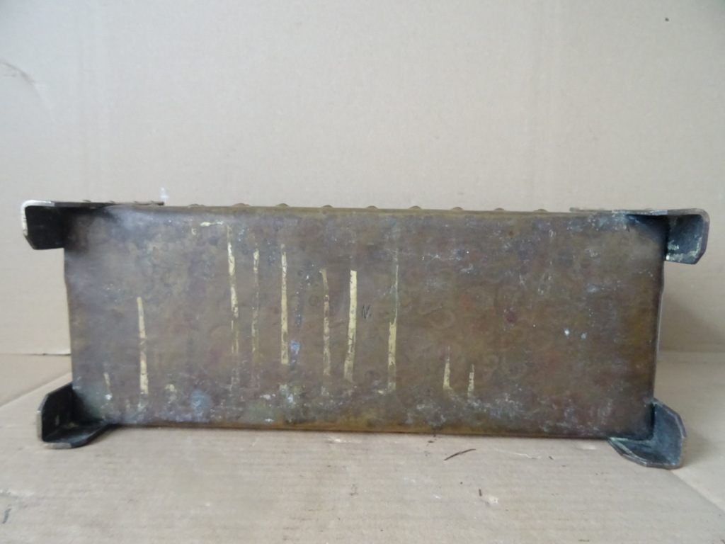 Antieke koperen bloembak 35cm Art deco vervaardigd in de periode 1900-1920. Deze fraaie bloembak van gele koper of messing is in een schitterende gebruikte staat. Er zijn slechts enkele minuscule deukjes die haast niet opvallen. Aangezien het een familiestuk is werd deze bloembak in ere gehouden en om de zoveel tijd geopoetst. Hierdoor ziet hij er aan de buitenkant nog uitzonderlijk goed uit, zie foto’s.