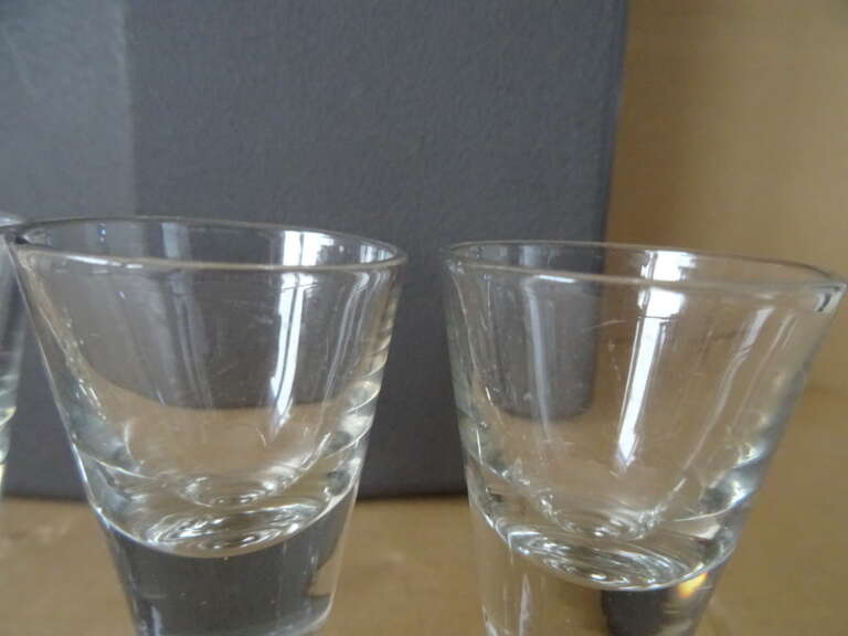Antieke likeurglaasjes mondgeblazen vervaardigd in de periode 1860-1880. Prachtige met de mond geblazen glaasjes. Dit is goed te zien aan de onderkanten en aan de verschillende hoogtes en vormen, zie foto’s. Drink of serveer uw likeurtje in stijl! Puntgaaf afgezien van een van de glaasjes dat een minuscuul afwijkend plekje of een beschadiging heeft in de rand, zie foto’s.