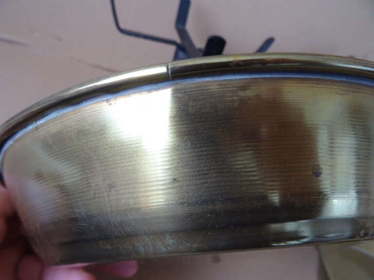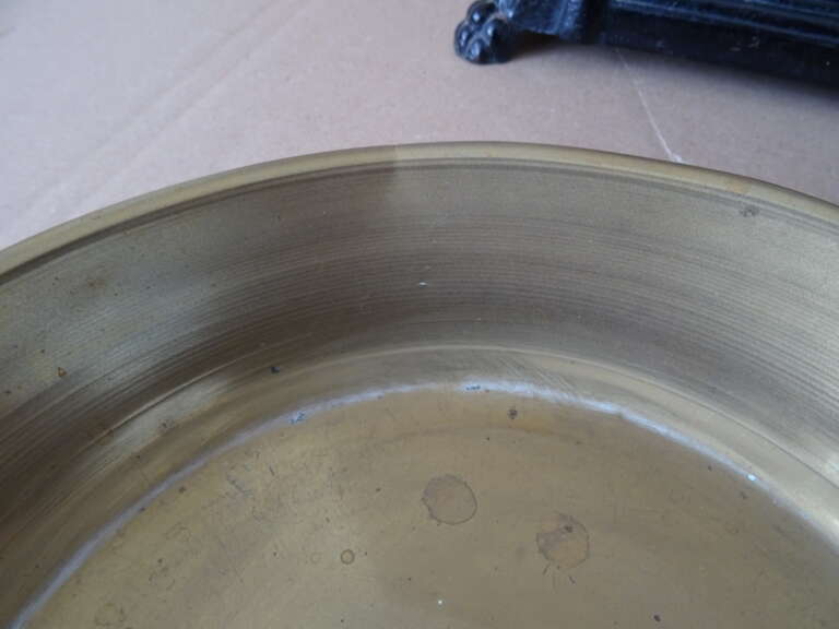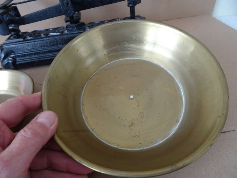 Antieke weegschaal 5 Kg vervaardigd in de eerste helft van de vorige eeuw of nog iets eerder. In redelijke gebruikte staat, met twee onderdelen die opnieuw vastgezet dienen te worden en enkele kleine deukjes en de schalen (een met een scheurtje), zie foto’s. Afmetingen weegschaal exclusief koperen schalen; circa 43,5 bij 18,5 bij 16 cm. Doorsnedes schalen; circa 20,3 en 20,7 cm. Hoogtes schalen circa 4 en 5 cm. Speciale afhaalprijs 25 euro.