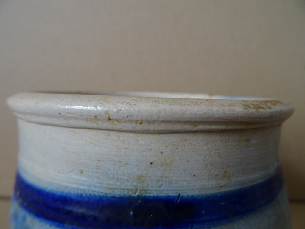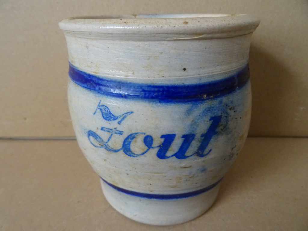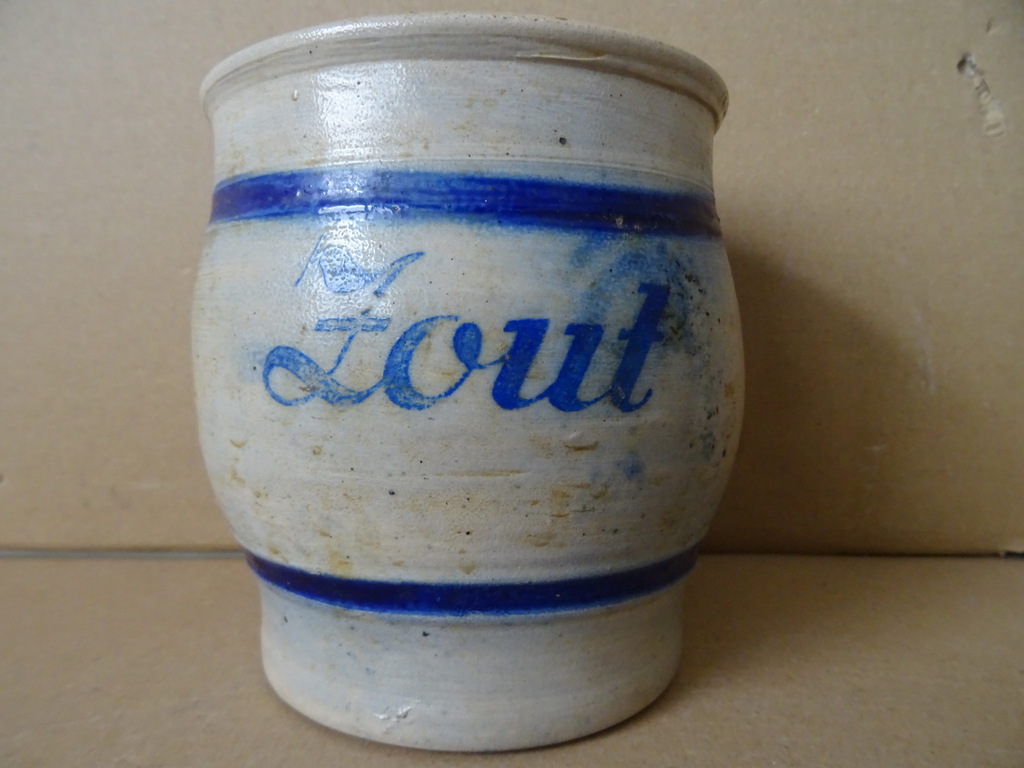 Antieke zoutpot voor aan de wand van aardewerk vervaardigd begin 1900. De prachtige grote zoutpot van 14 cm is nog in vrij goede staat, puntgaaf. Een pot als deze hing bij het fornuis.