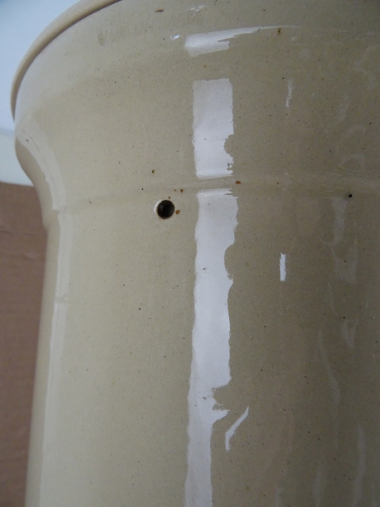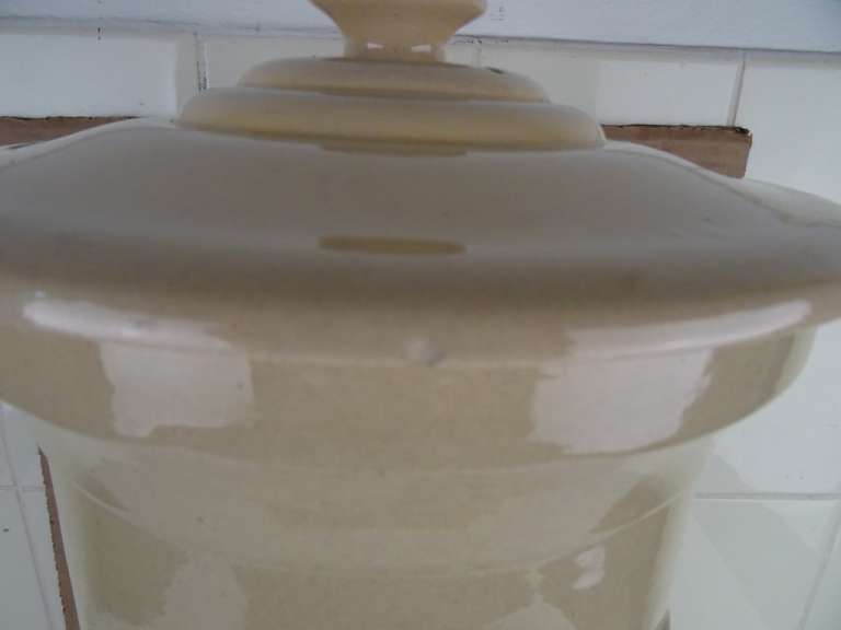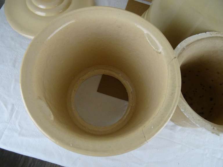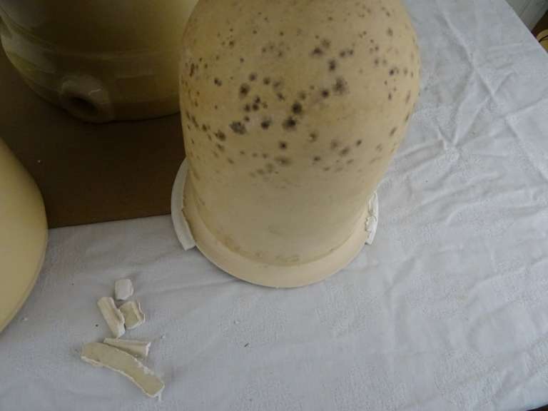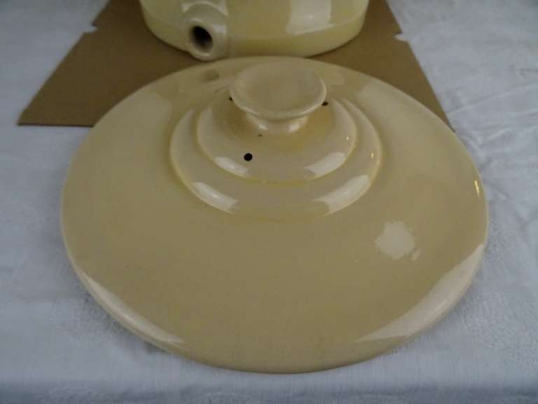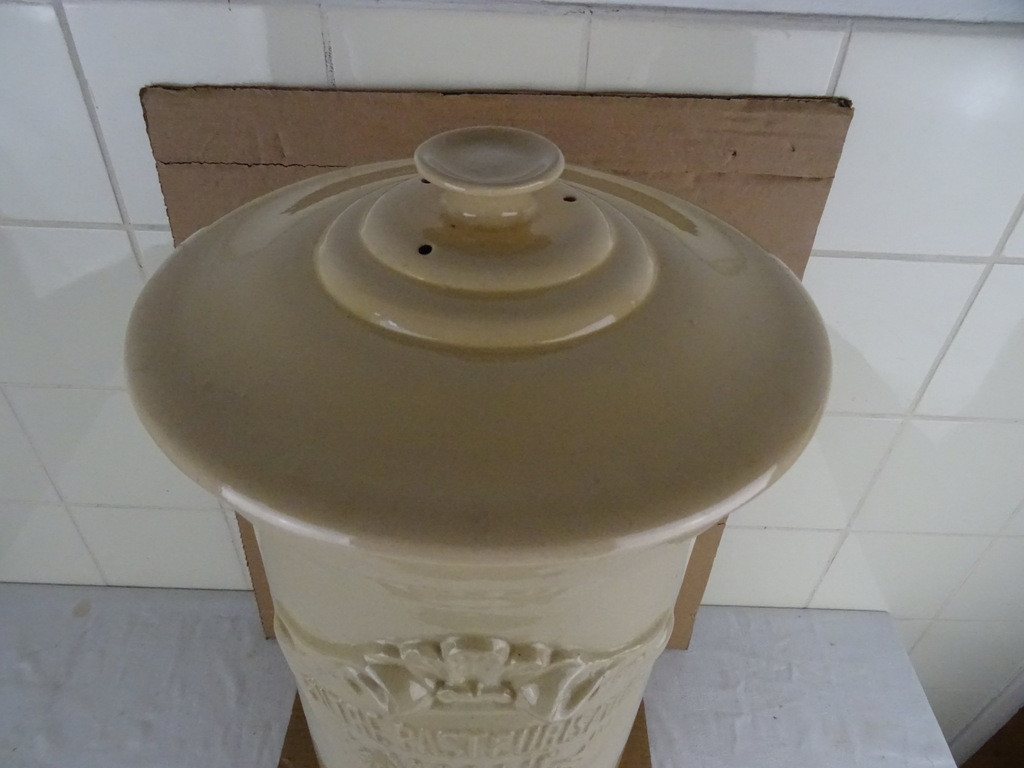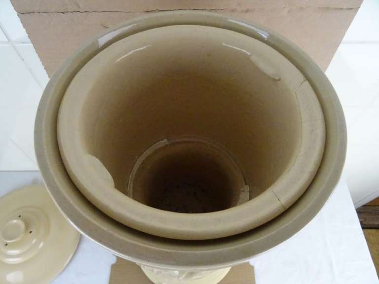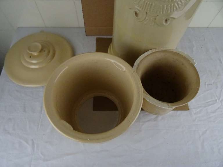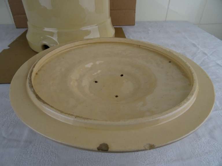 Antieke waterfilter Filtre pasteurisateur mallié van 59 cm vervaardigd in Frankrijk tussen circa 1890 en 1930. Het fraaie object stond mogelijk in een apotheek. Men moedigde mensen aan om waakzaam te zijn over het verbruikte water en het water te filteren. Apotheken promootten daarom ijverig deze filters. Deze brachten schoon vervuilingsvrij water in de strijd tegen allerlei soorten ziekten. De binnen-pot vulde men met grondwater. Vervolgens sijpelde het water tussen de twee potten door, het vuil achterlatend. Naarmate het waterpeil onderin de filter steeg drukte dit de onderste pot naar boven toe. Deze kon er dan makkelijk worden uitgehaald om het vuil te verwijderen. Systemen als dit gebruikte men al sinds de Romeinse tijd. De aardewerk of porseleinen filter is in een prachtige gebruikte staat, zonder kraantje (dit zat onderin aan de voorkant). De deksel mist 3 chipjes. Een van de binnen-potten is geplakt of in ieder geval gespleten. De andere pot is nog puntgaaf, wel is de rand er wat vanaf. Deze rand is er later aangemaakt met gips of iets dergelijks. Dit randje is zeer fragiel. Telkens als ik de pot erin hang vallen er stukjes rand af, zie foto’s. Indien gewenst wordt alles (wat mogelijk is) gratis in ere hersteld. Een antieke waterfilter van dit formaat komt niet veel meer voor. Verrijk uw interieur met dit pronkstuk! Gewicht; 8.6 Kg, ingepakt ruim 10 Kg.