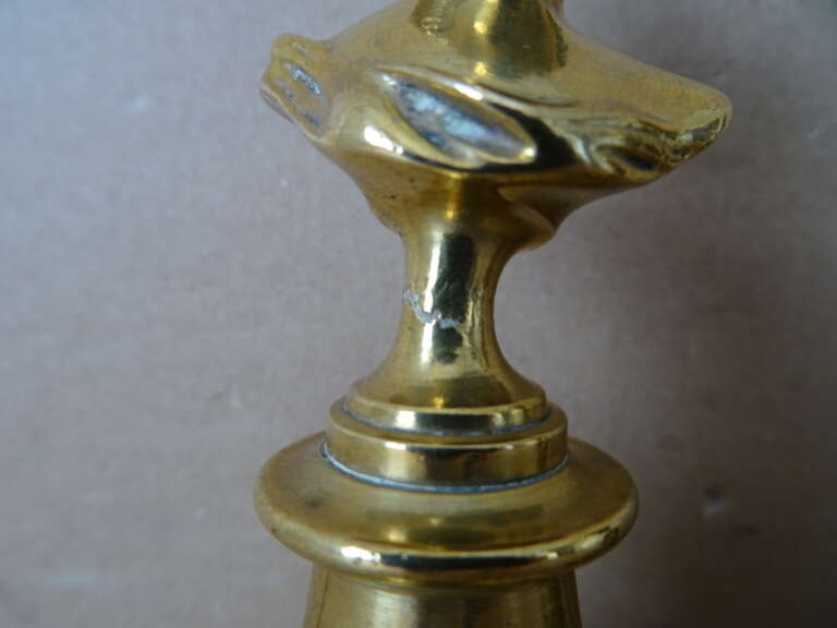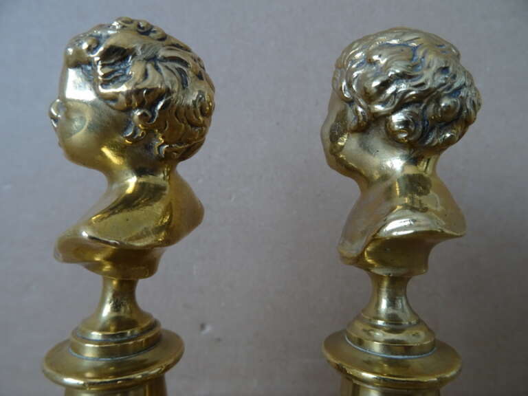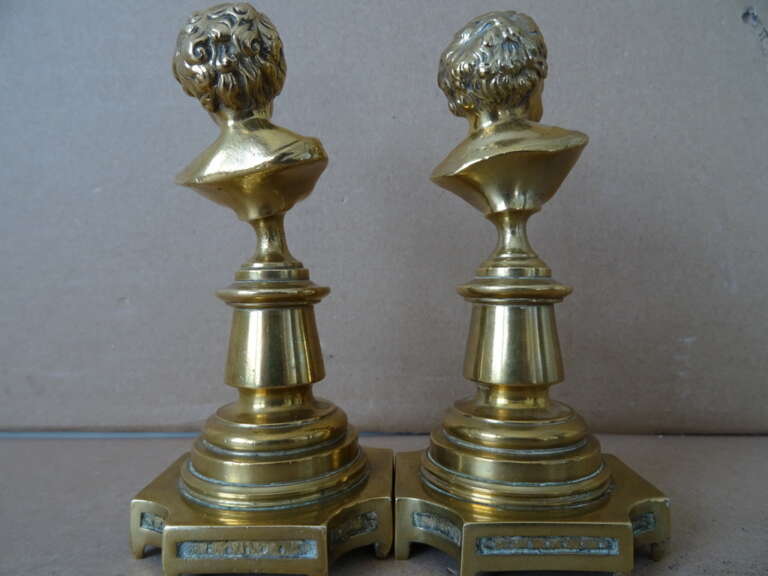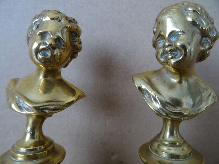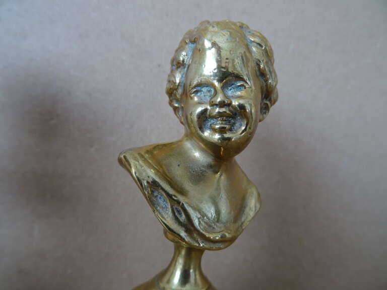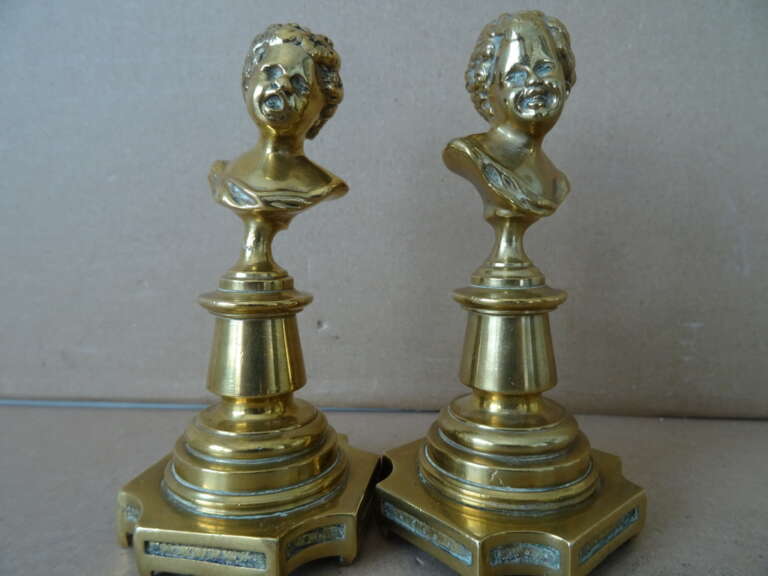Bronzen beeldjes Jantje lacht Jantje huilt Charles X stijl vervaardigd rond 1830 of iets later. De beeldjes van circa 13,5 cm zijn in een schitterende gebruikte staat. In de bijna 200 jaar dat ze bestaan zullen ze vast wel eens omgevallen zijn. Jantje lacht is nog redelijk recht, Jantje huilt is iets schever, zie foto’s. Desalniettemin nog altijd twee zeer mooie elegante beeldjes. Een mooi detail zijn de fraaie moeren aan de onderkant. Deze zijn nog echt met de hand gemaakt.