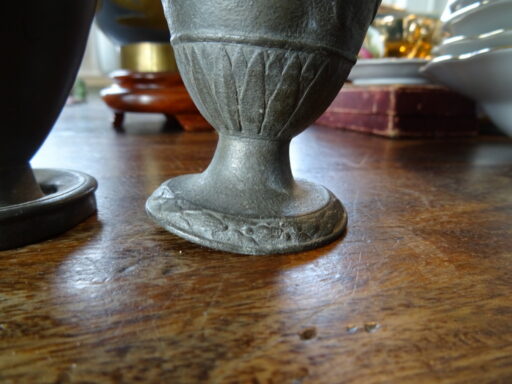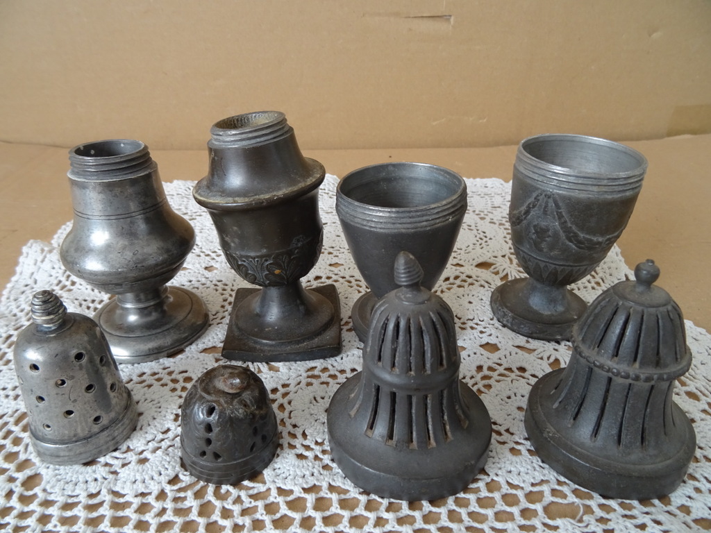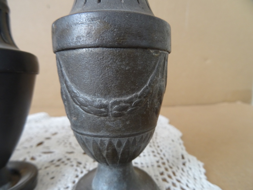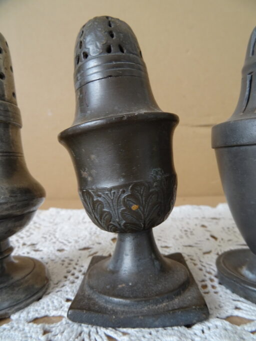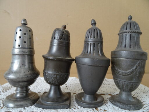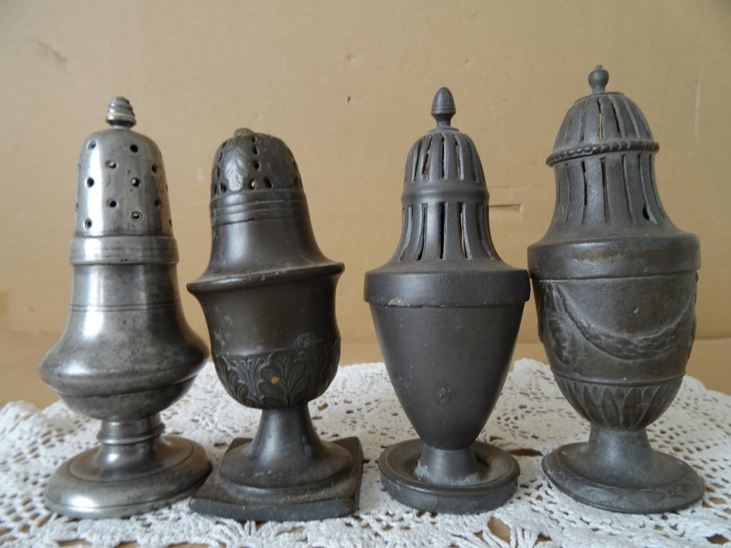 18e-eeuwse Collectie tinnen peperbussen vervaardigd in de periode 1780-1800. Peperbus nummer 1 is van rond 1780, de andere 3 van rond 1790. Allemaal in een schitterende gebruikte staat met sporen van gebruik en wat scheef. Nummer 1 is nog redelijk recht, zie foto’s. Peperbus nummer 4 staat wat wankel. Met een kleedje eronder staat deze een stuk stabieler, zie laatste foto. Hoogtes circa 12,5 tot 14 cm. Afmetingen peperbus nummer 1; circa 5,5 bij 5,5 bij 13 cm.
