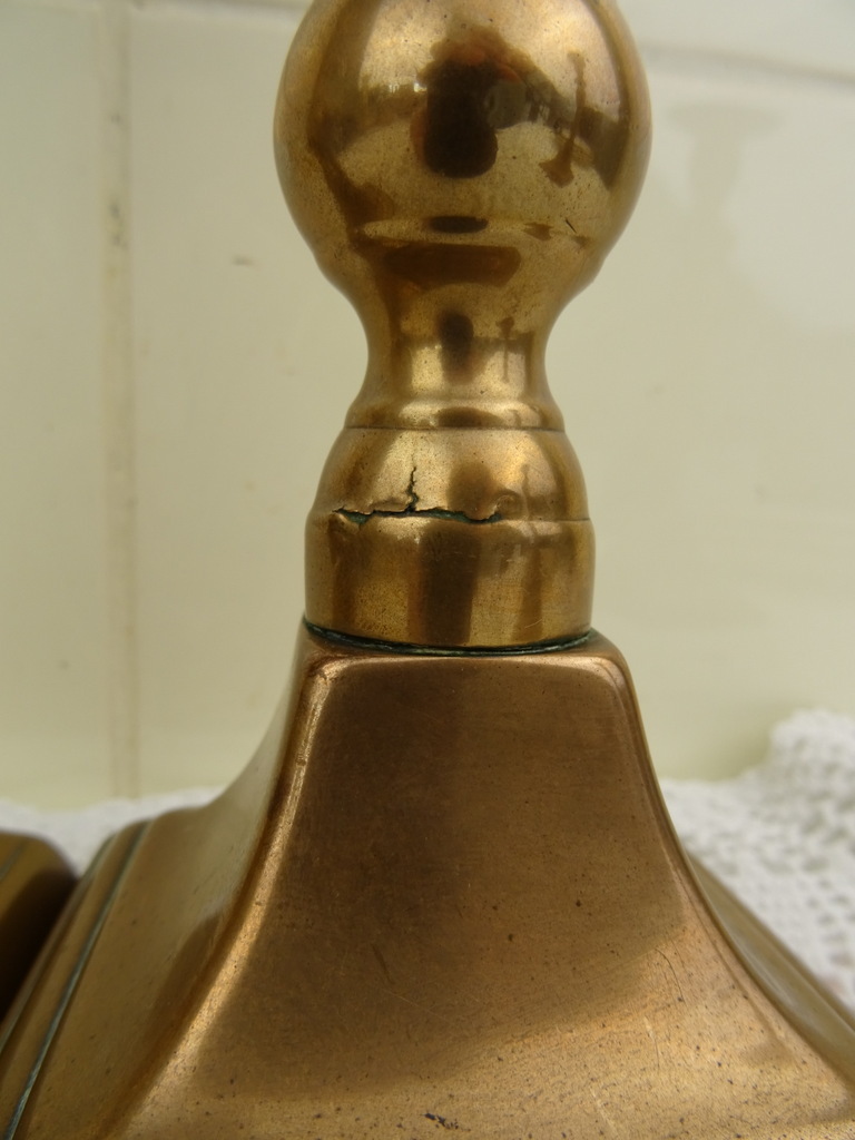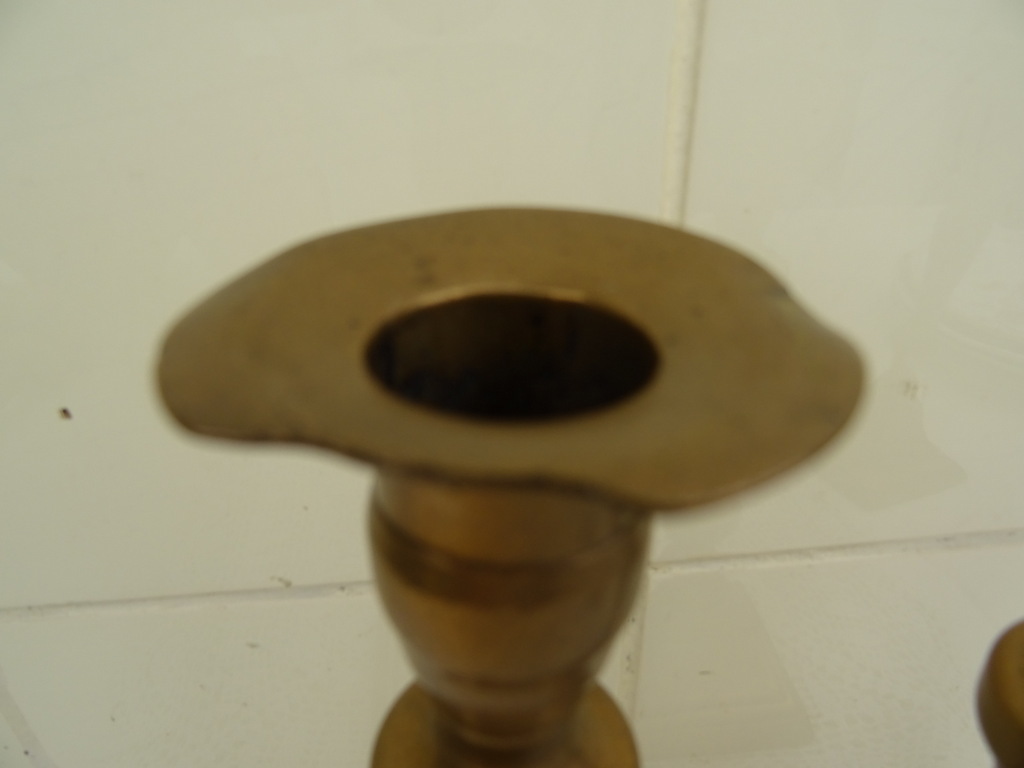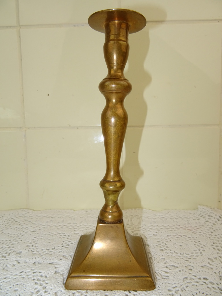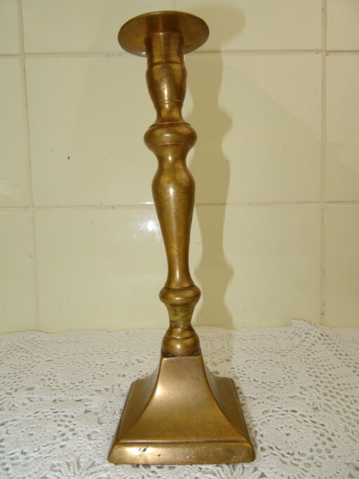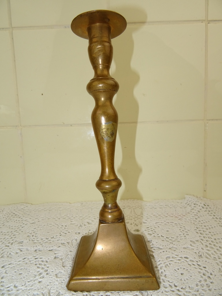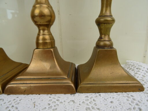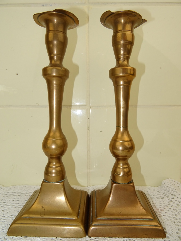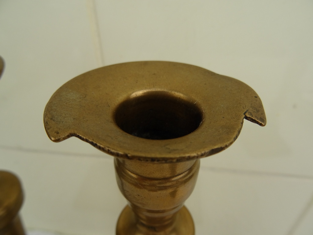 Drie antieke kandelaars vervaardigd in de negentiende of twintigste eeuw. Ze zijn gemaakt van koper of messing. De maker en herkomst zijn onbekend. De twee grote kandelaars zijn bijna identiek. Deze zijn ook nog vrij recht, wel is er een licht beschadigd. Bij beide kandelaars is er een stukje opgezet ofwel weggehaald, zie foto’s. De derde kandelaar is scheef en heeft een deukje. De afmetingen van de grote zijn 8 bij 8 bij 23 cm, de kleine is 7.5 bij 7.5 bij 22 cm.