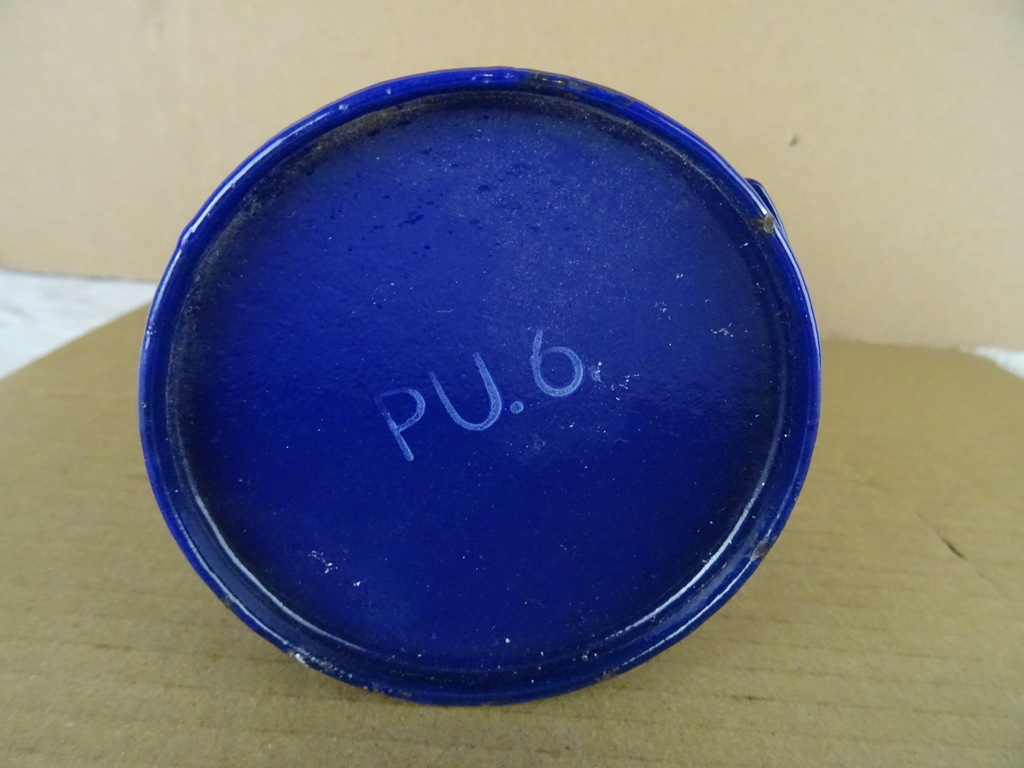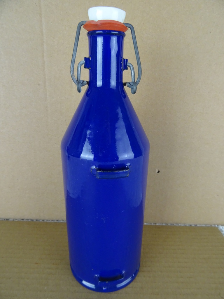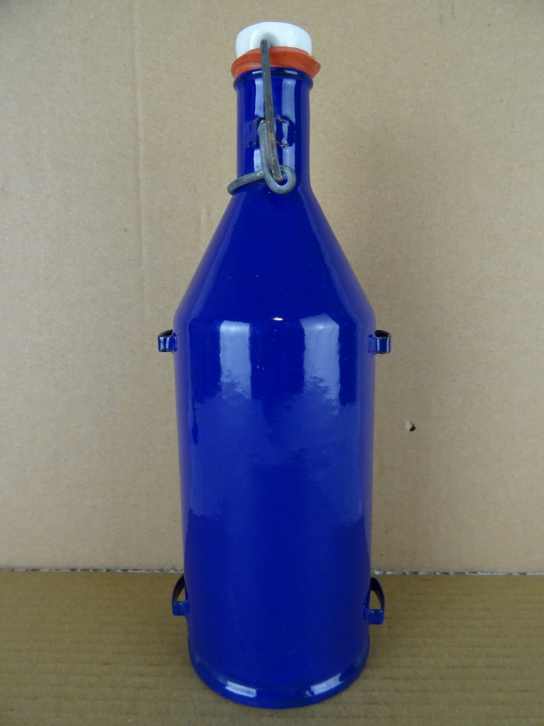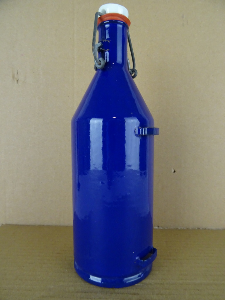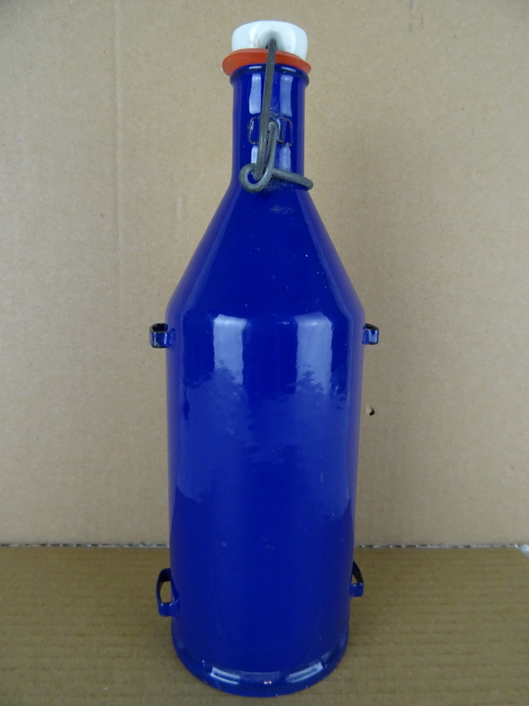 Vintage mijnwerkersfles vervaardigd rond 1950 of wat later. Fraaie blauw geëmailleerde veldfles met beugeldop van het merk BK. De fles is nog in uitzonderlijk goede staat, haast als nieuw (ook van binnen). Alleen het metaal van de beugeldop heeft wat lichte roestplekjes. De stoffen draagband ontbreekt. Onder de fles staat PU.6, dit zal een typenummer of keurmerk zijn.