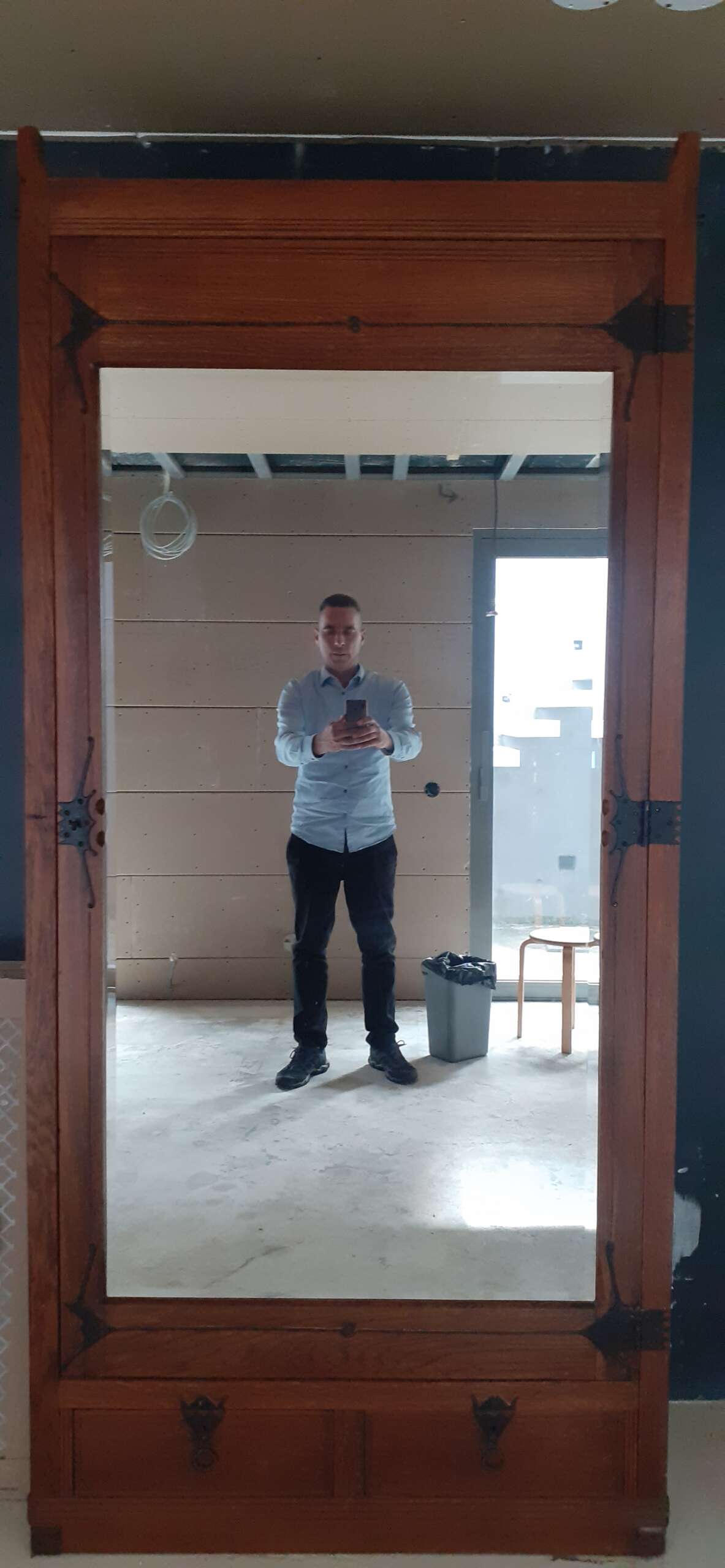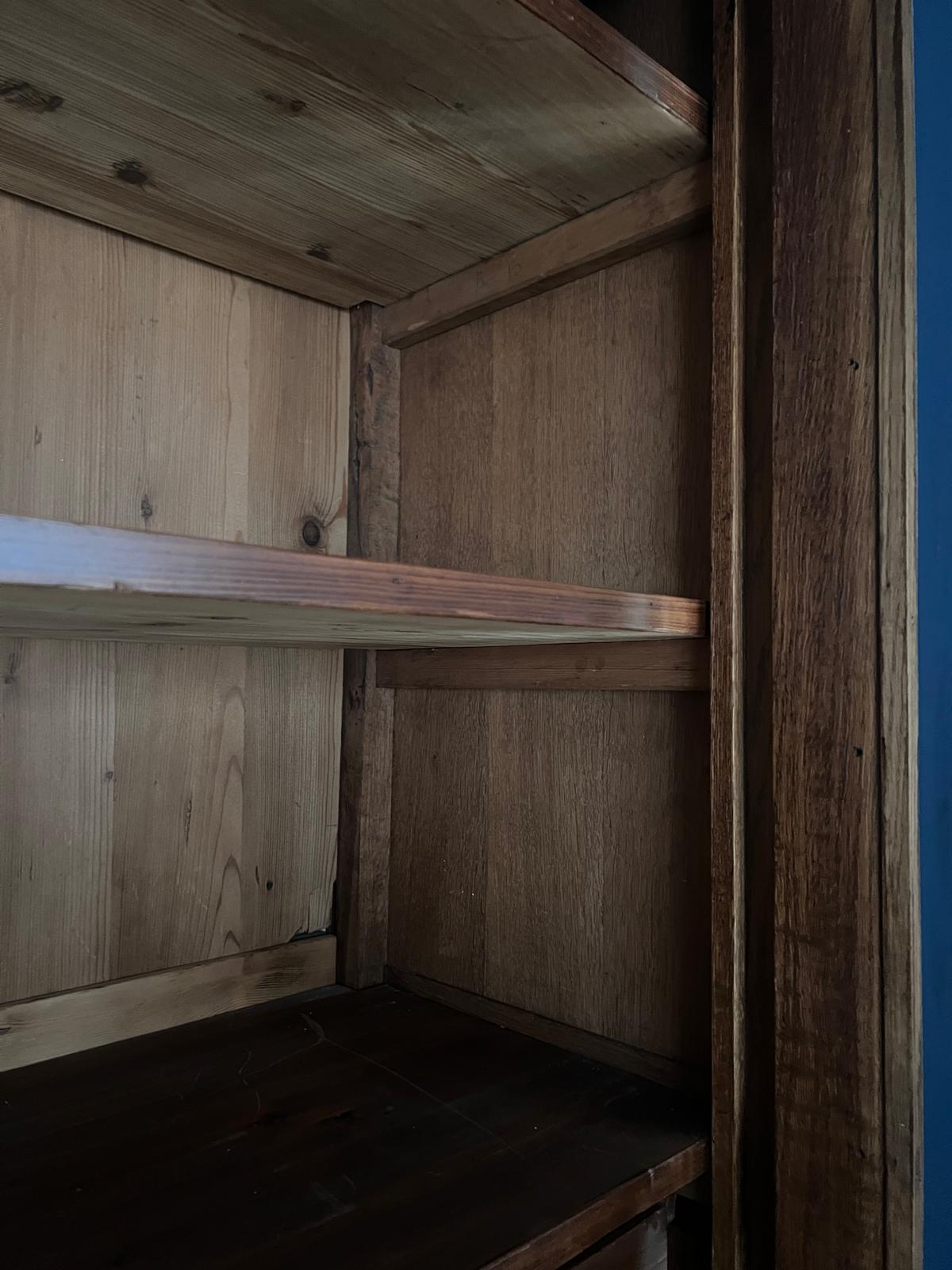 Antieke houten kast linnenkast 225cm koloniale stijl vervaardigd rond 1930 of iets eerder. Een fraaie statige kast in nog vrij goede staat, zeer solide. Aan de achterwand ontbreekt slechts een stukje hout, zie foto’s. De enorme facet geslepen spiegel is ofwel dertig jaar geleden vervangen ofwel de laag aan de achterkant van de spiegel is toen vernieuwd. Aan de achterkant van de kast bevindt zich overigens een haak om haar mee aan de muur te verankeren. De deur van de kast is afsluitbaar, de sleutel is erbij. De kast is niet uit elkaar te halen. Breedte 104 cm, diepte 44,5 cm, hoogte 225 cm. Verrijk uw interieur met deze prachtige antieke linnenkast! Ze dient afgehaald te worden in Bunde. Bezorging in de gehele Benelux is mogelijk na overleg en bijbetaling.