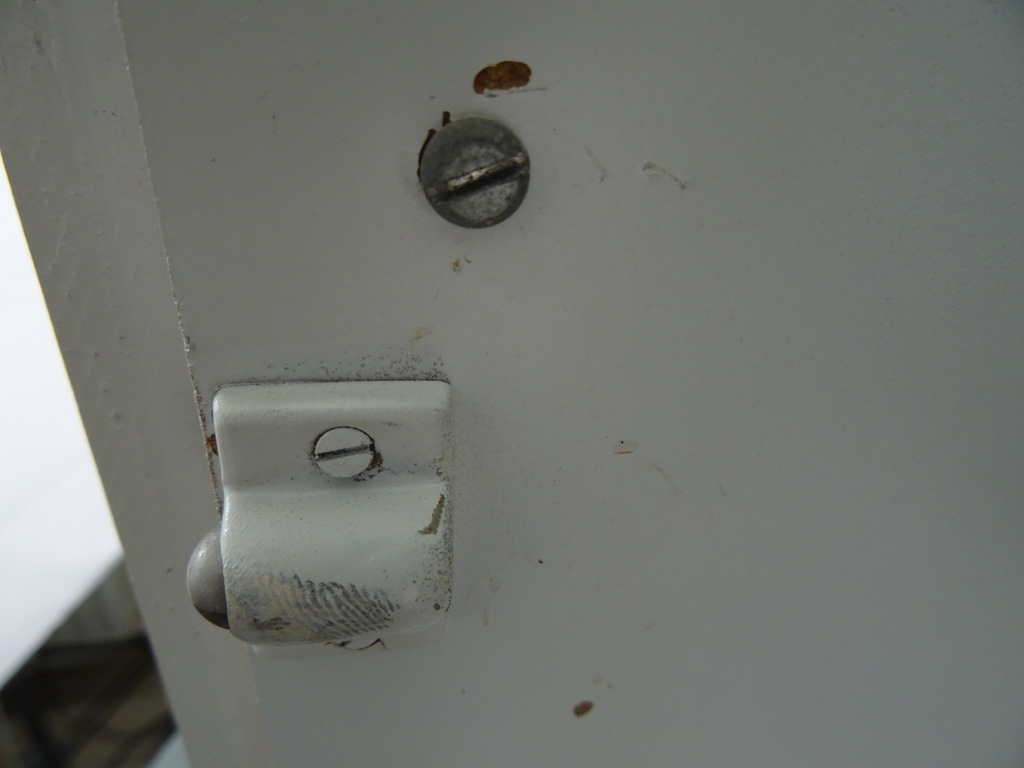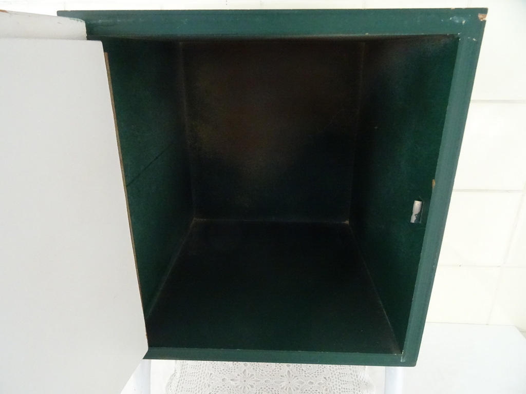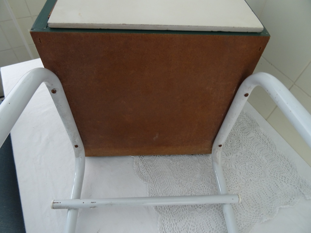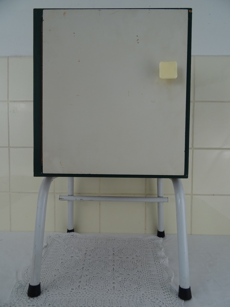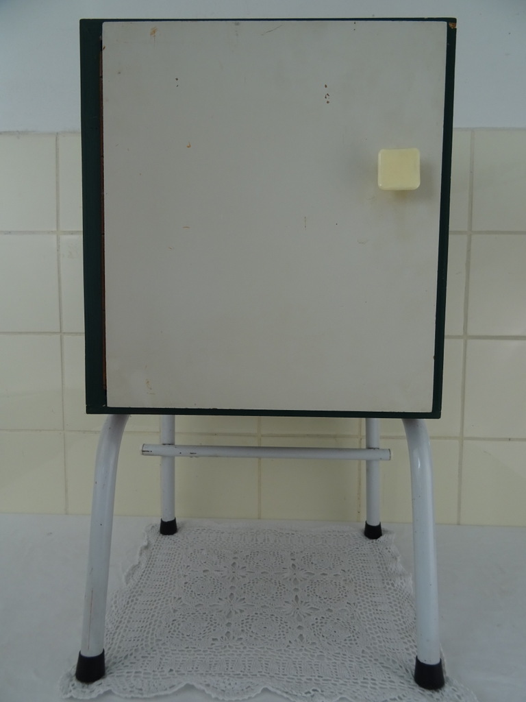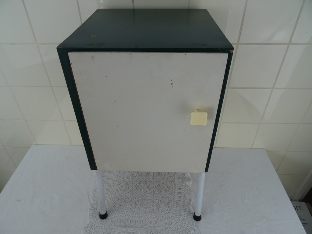 Retro houten kastje Space Age stijl vervaardigd rond 1950 of wat later. Het opvallende kastje of nachtkastje is een lust voor het oog. Het is in goede gebruikte staat, zie foto’s. Het is nog zeer solide en sluit goed. Het weegt 4.6 Kg, ingepakt ruim 5 Kg.
