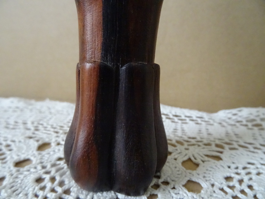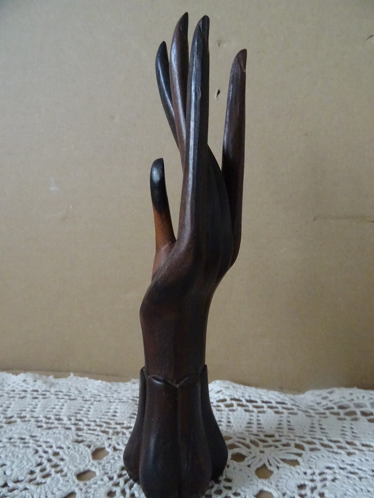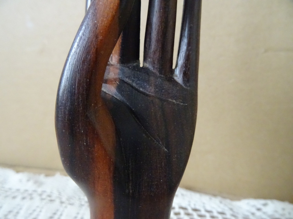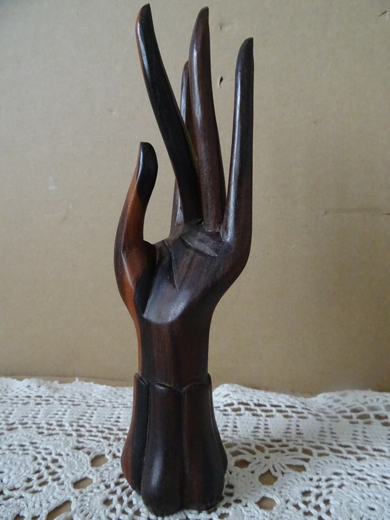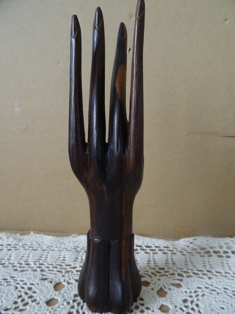 Balinees houten beeld hand ringhouder 19cm vervaardigd rond 1960 of later. Het beeld is met de hand gesneden uit coromandelhout. Het is in een schitterende gebruikte staat en puntgaaf, zie foto’s. Ook mooi om ringen in stijl te fotograferen / presenteren of op te bergen. De dikte van de vingers is circa 1 cm.