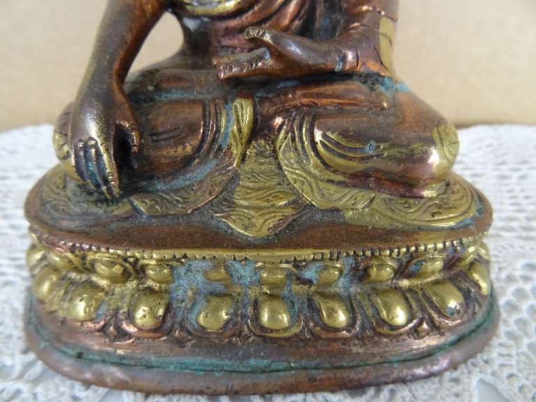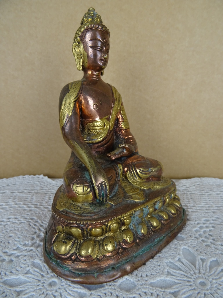 Imposant bronzen Boeddhabeeld vervaardigd rond 1950 of iets later. Afgebeeld is een zittende Boeddha met een hand horizontaal en een hand verticaal. Het beeld is gegoten uit brons, het is hol van binnen. Het is nog in vrij goede staat en gemerkt aan de onderzijde, zie foto’s. Verwen uzelf met dit prachtige en tijdloze Boeddhabeeld of geef het iemand cadeau!